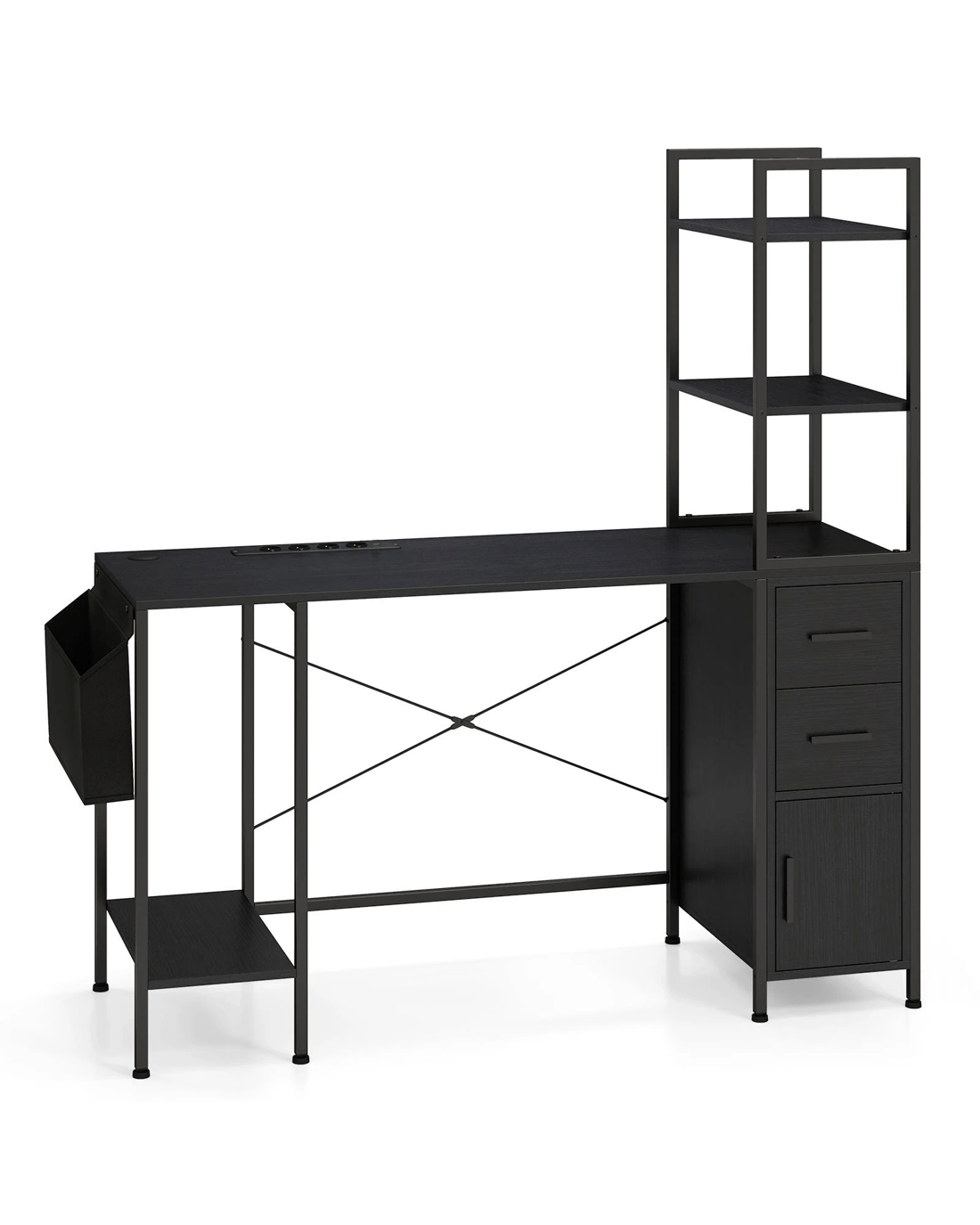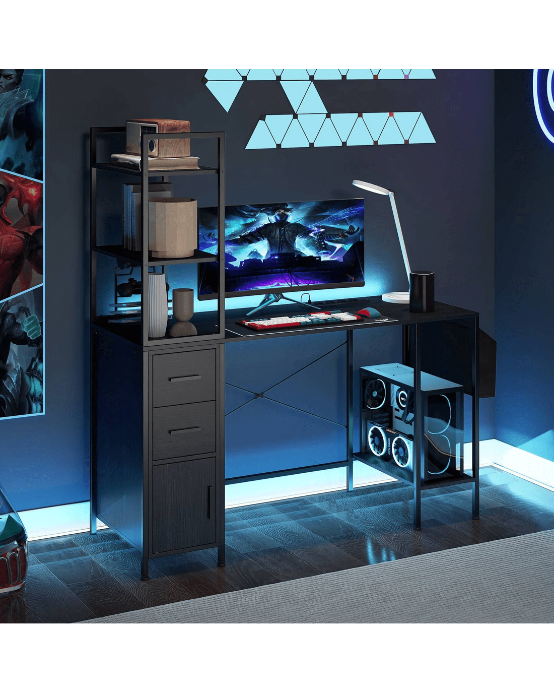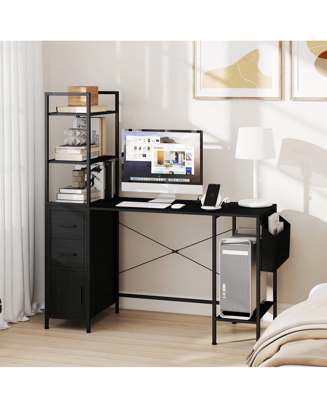Features 2 shelves, 2 drawers, a cabinet, a CPU stand, and fabric pocket