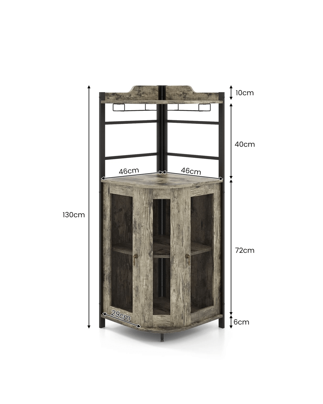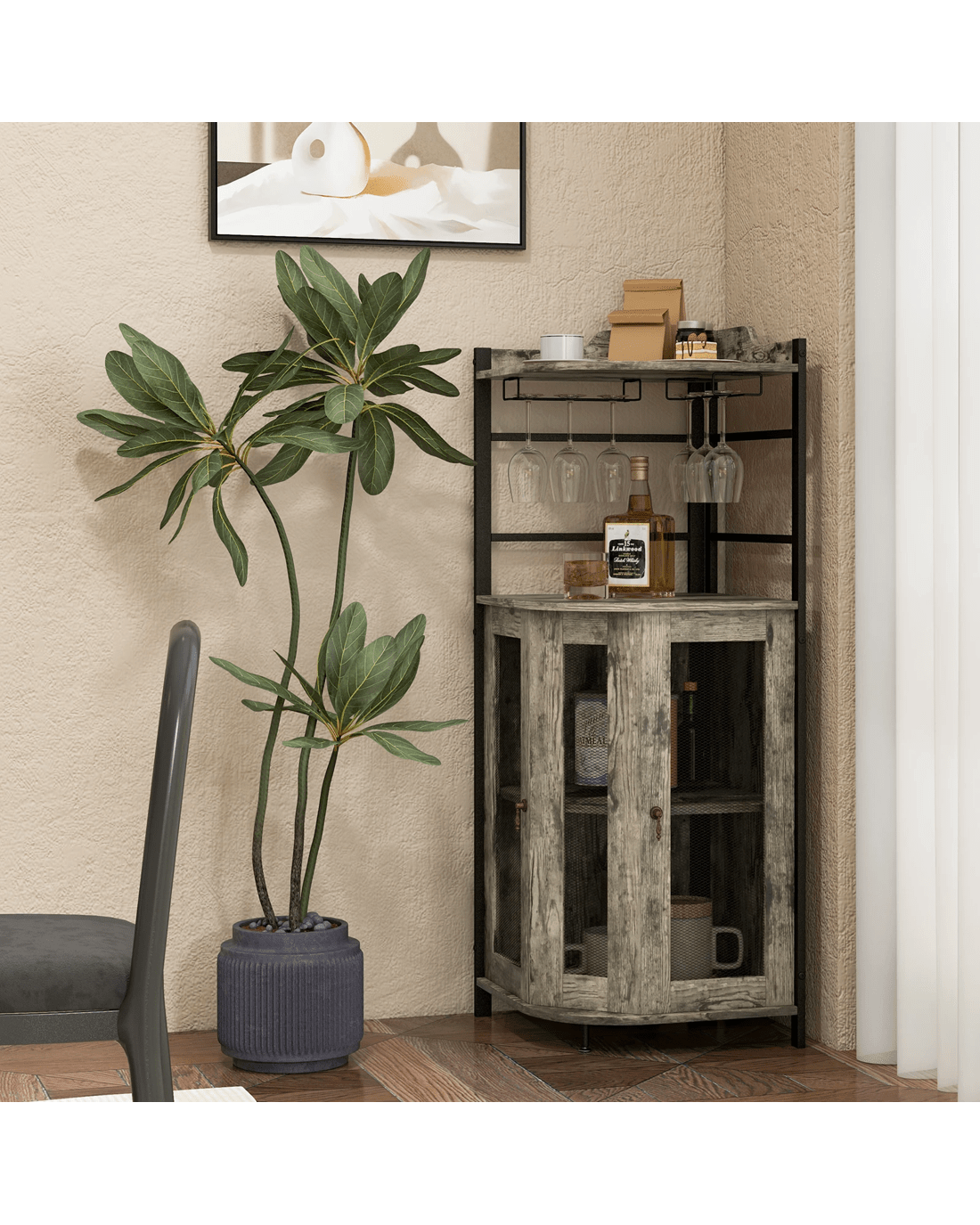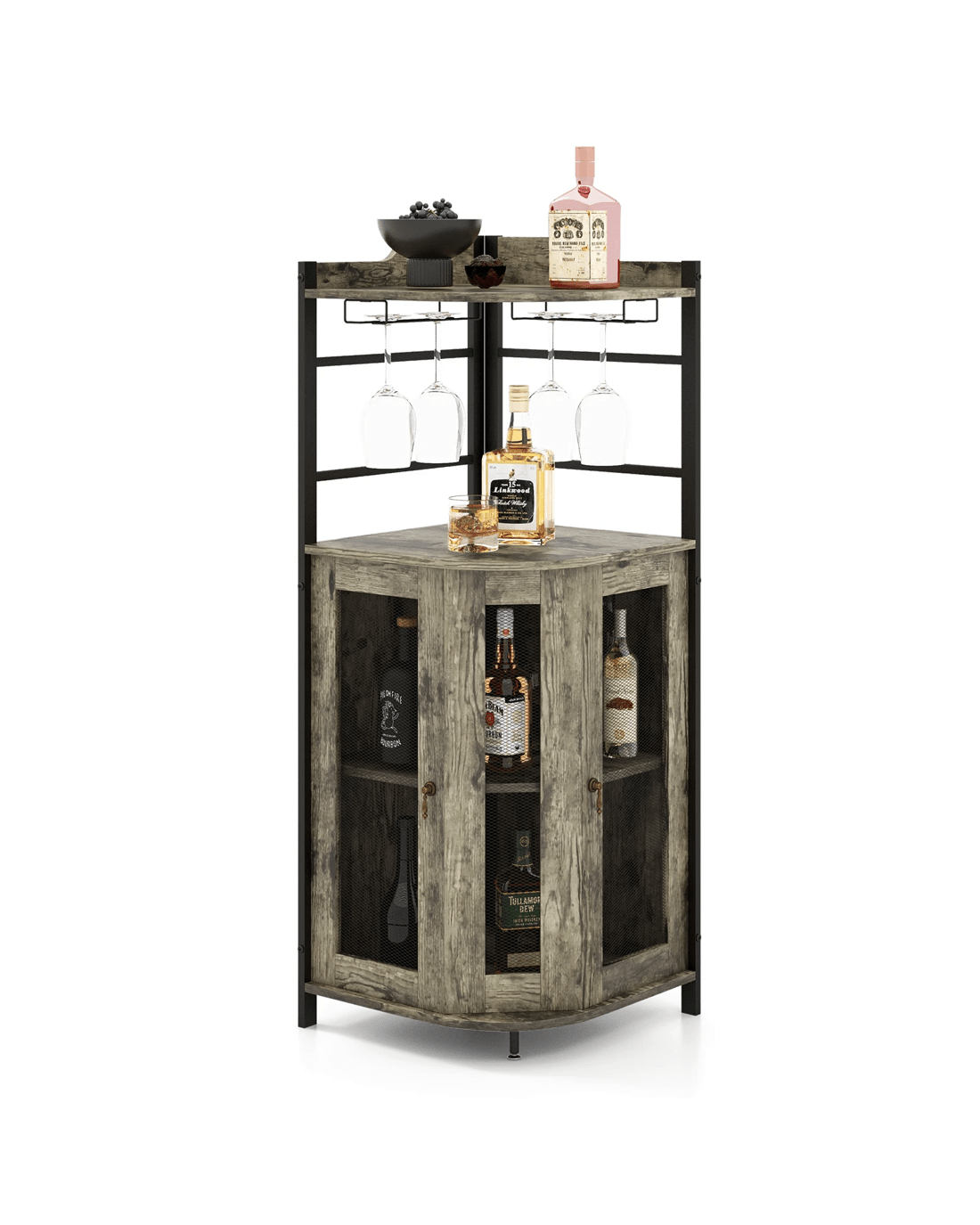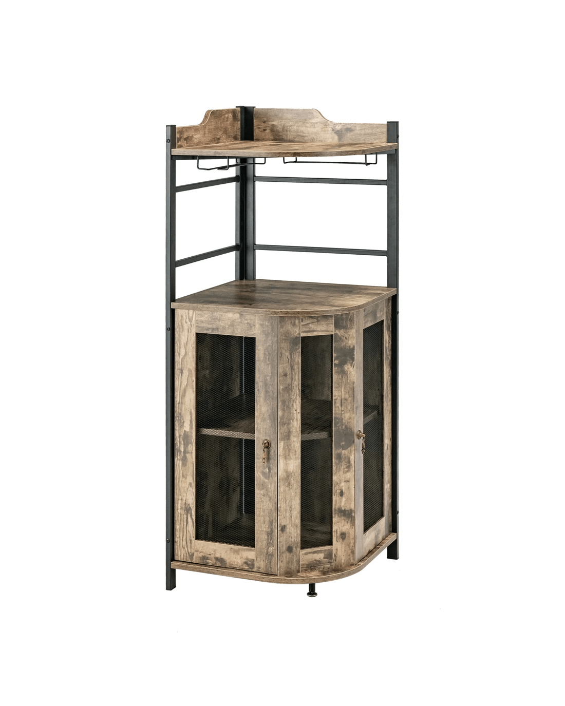 This stylish wine cabinet will de-clutter the space and turn the unnoticed corner into a fine home bar. The top shelf is equipped with 2 glass holders for well storing fragile stemware, making it convenient for a drink at any time. And the bottom cabinet with ventilated metal mesh doors provide plenty of storage space. The shelf inside, can be adjusted or be removed as needed. Of course, a sturdy construction is a must to support the load. In addition to the high-quality material, the corner bar cabinet is equipped with an anti-tipping kit as well as adjustable foot pad to increase stability.