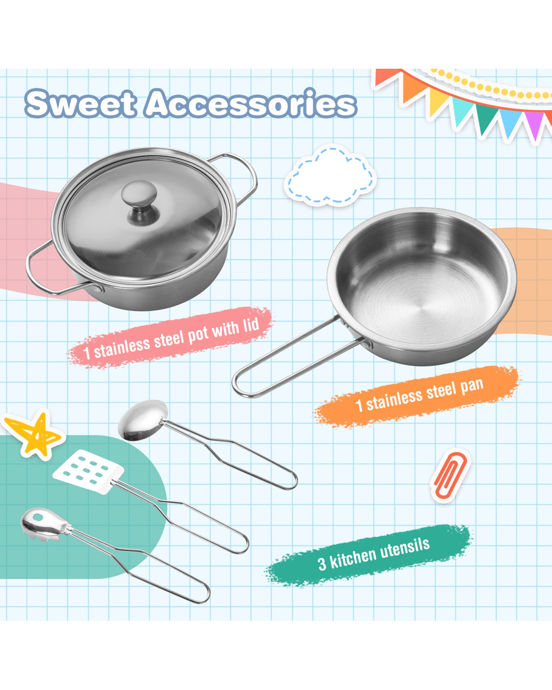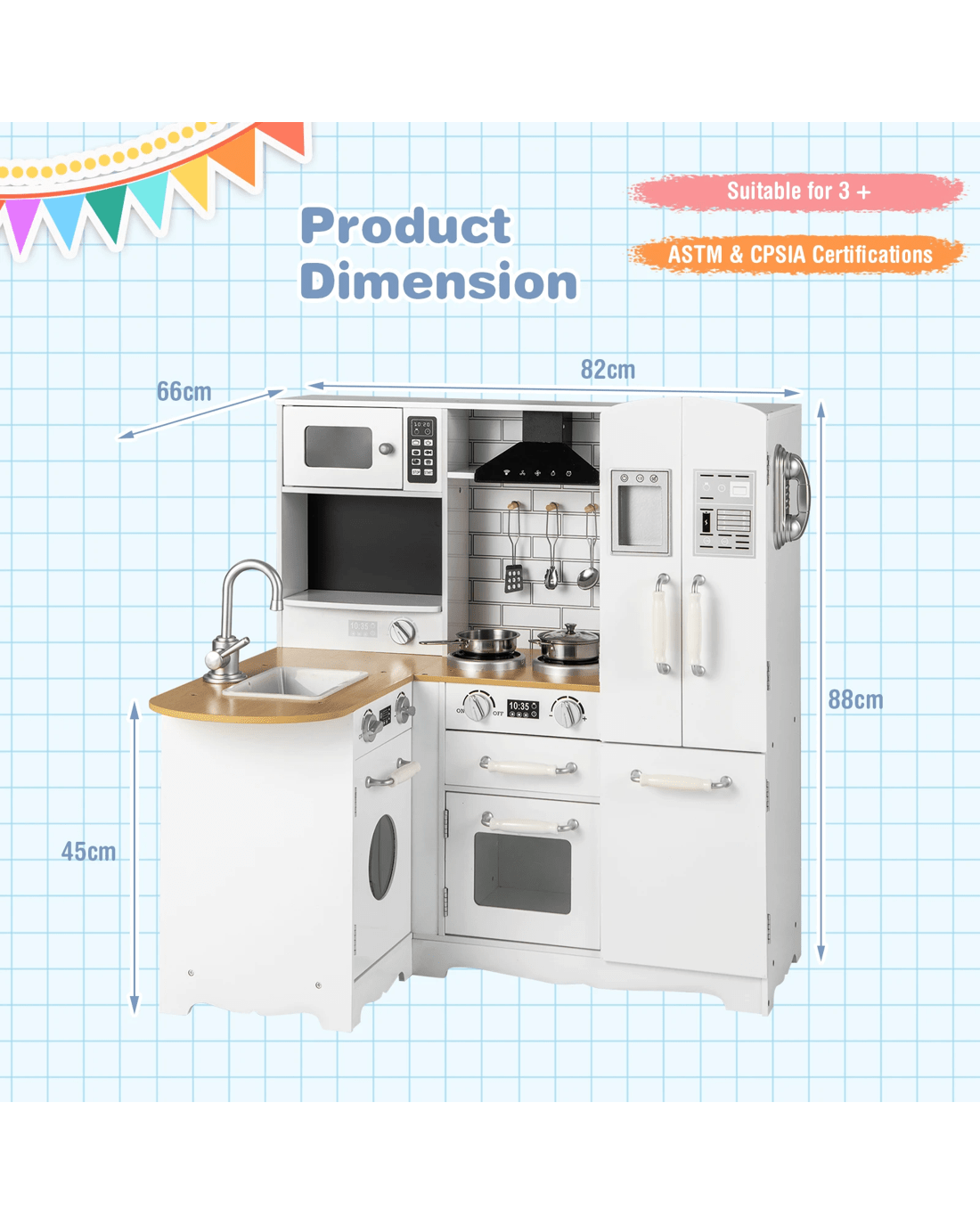 Our corner kitchen play set not only brings little ones hours of cooking joy, but also enables them to enjoy the interesting washing machine and telephone. 1 stainless steel pan, 1 stainless steel pot with lid and 3 kitchen utensils help to make their cooking experience more realistic. Besides, there is 1 microwave oven, 1 open shelf, 1 deep drawer and 4 enclosed cabinets to meet little one's toy storage needs. Little ones can also hang kitchen items on the hanging area. We specially design it with L-shaped construction and MDF frame to ensure long-lasting lifespan.