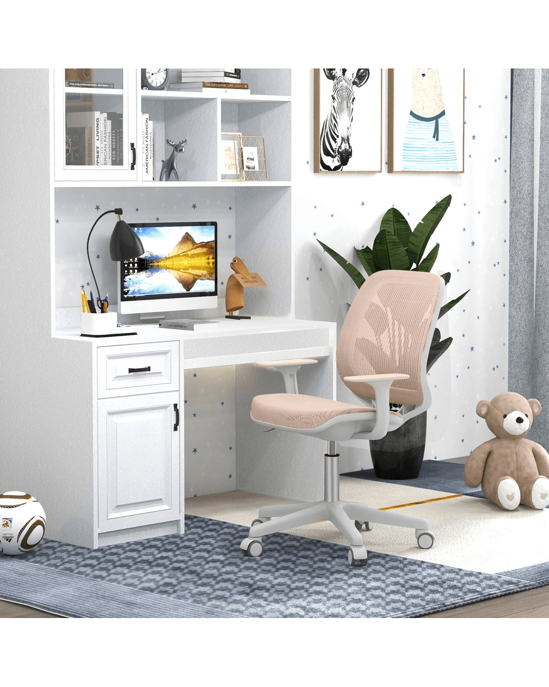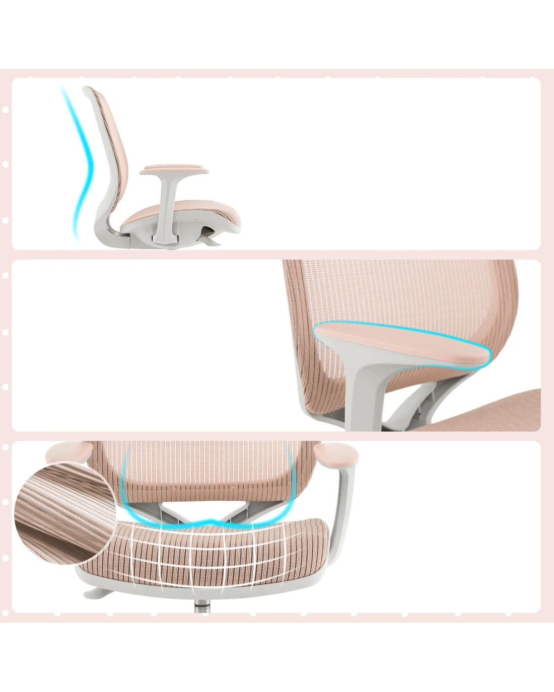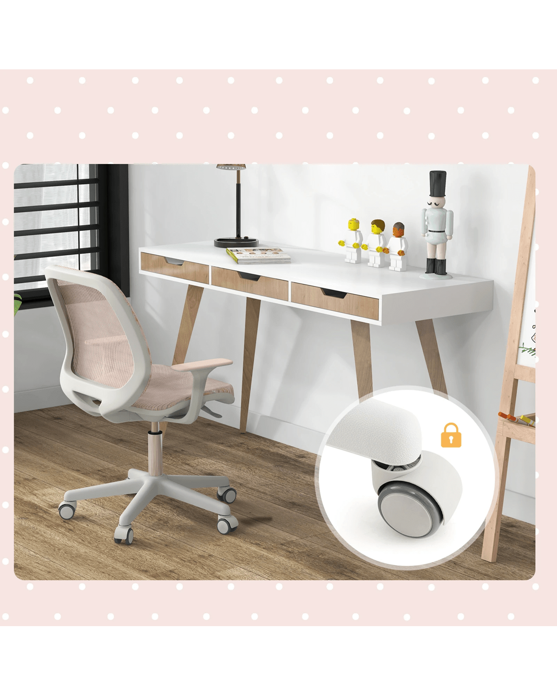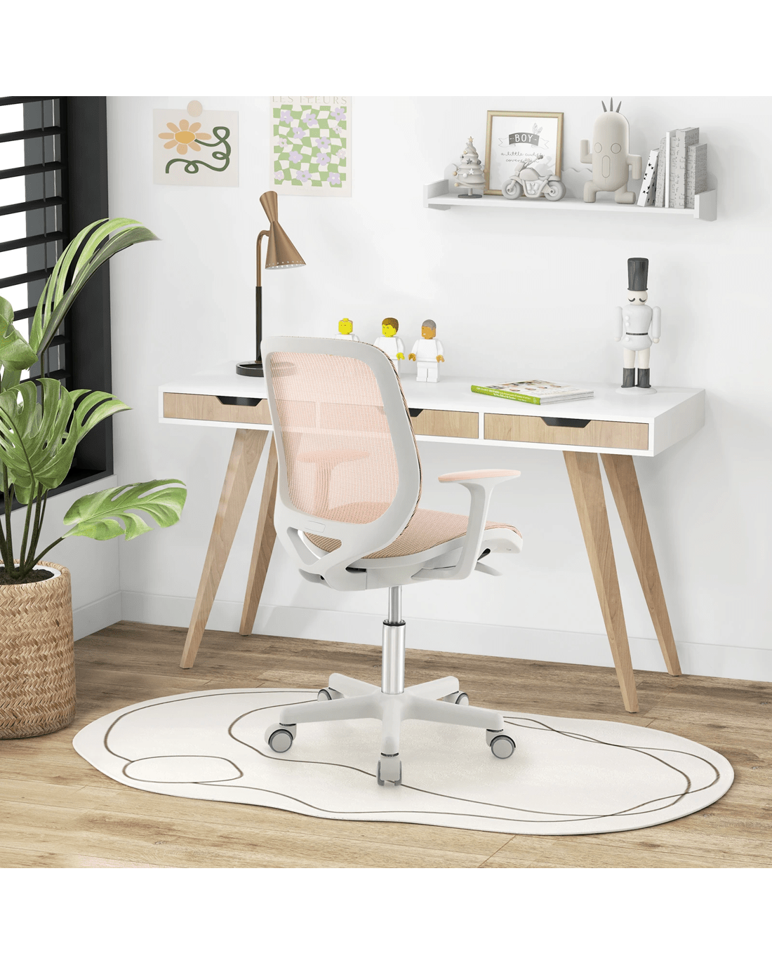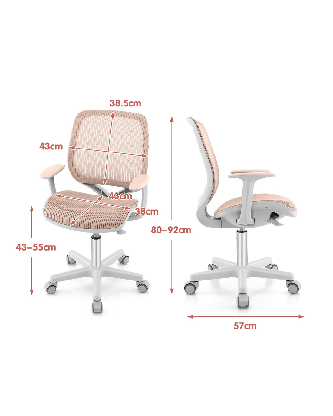 Our height-adjustable desk chair will grow with your little one(6-15 years old). The premium gas lift system and an adjustment lever allow the chair to easily lift up and down. Ergonomic backrest helps little ones to develop a good sitting posture. Smooth armrests and elastic mesh seat add more sitting comfort. The breathable nylon mesh fabric ensures heat dissipation and excellent durability. Besides, the 360° swivel seat ensures easy changing direction. 5 flexible wheels allow for easy movement. And the sit-brake wheels will automatically lock when the pressure is over 25kg and automatically loose when little ones stand up.