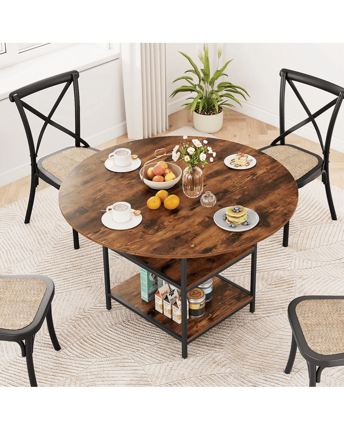 Elevate your dining experience with this 120 cm modern round dining table—perfect for family meals or gatherings of 4 to 6 in any kitchen, dining room, or studio apartment. Featuring ample tabletop space and 2 convenient open storage shelves, this minimalist table keeps essentials like tableware and snacks within easy reach while keeping your dining area clutter-free. The sturdy metal frame and non-slip foot pads ensure lasting stability and security, while smooth rounded edges provide a family-friendly touch. Designed with a sleek, waterproof surface for easy cleaning, this versatile large round table combines elegant style, smart storage, and hassle-free maintenance—making it an ideal centerpiece for both small and spacious homes.