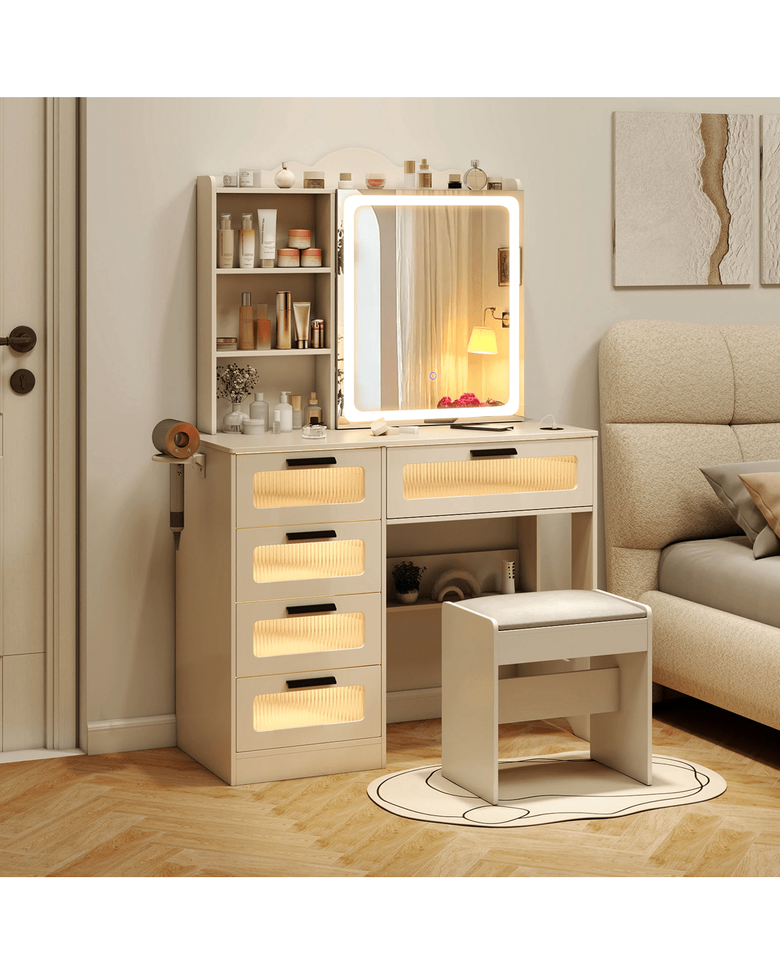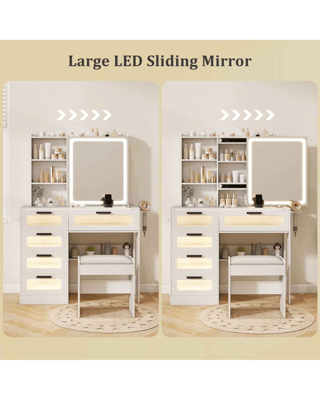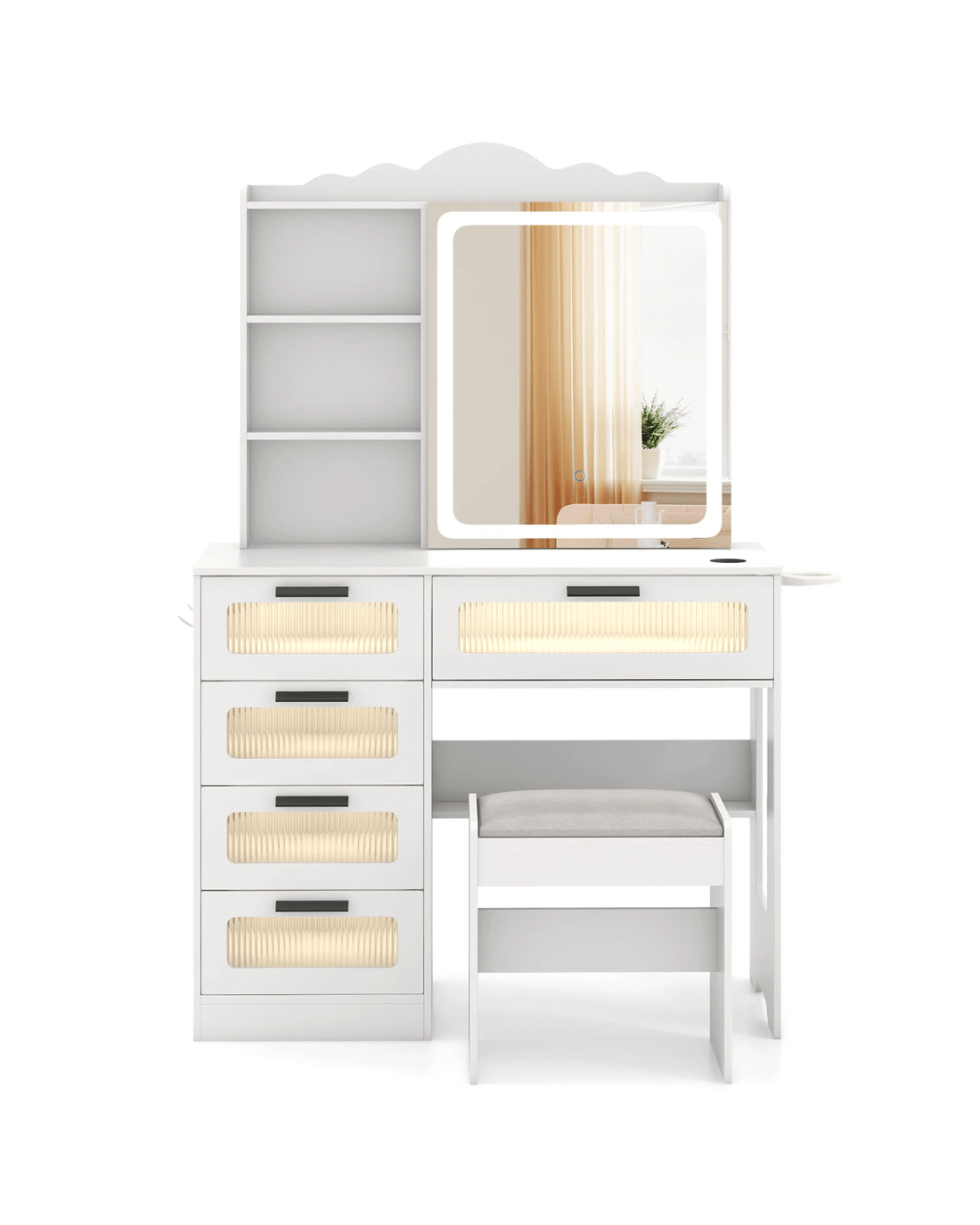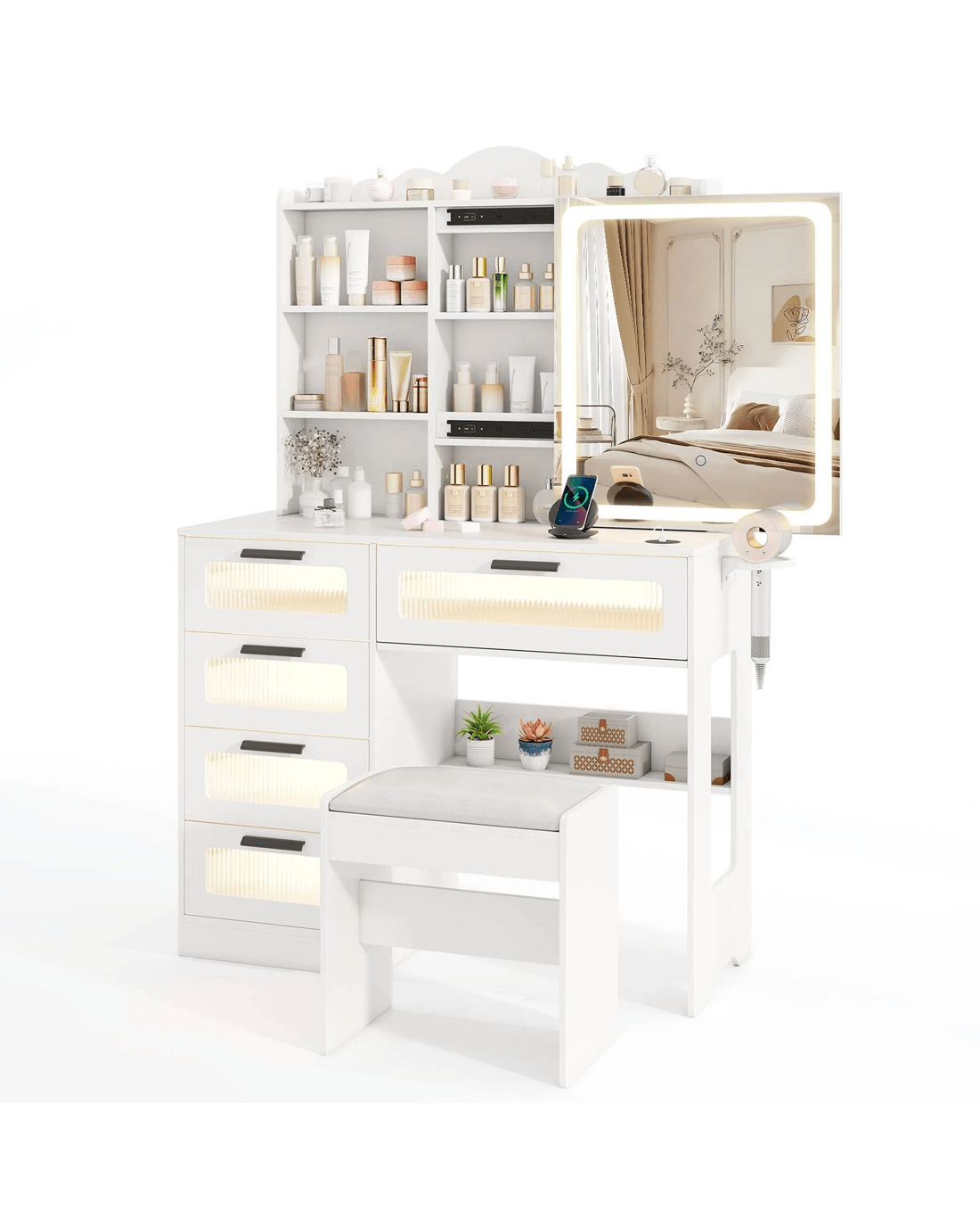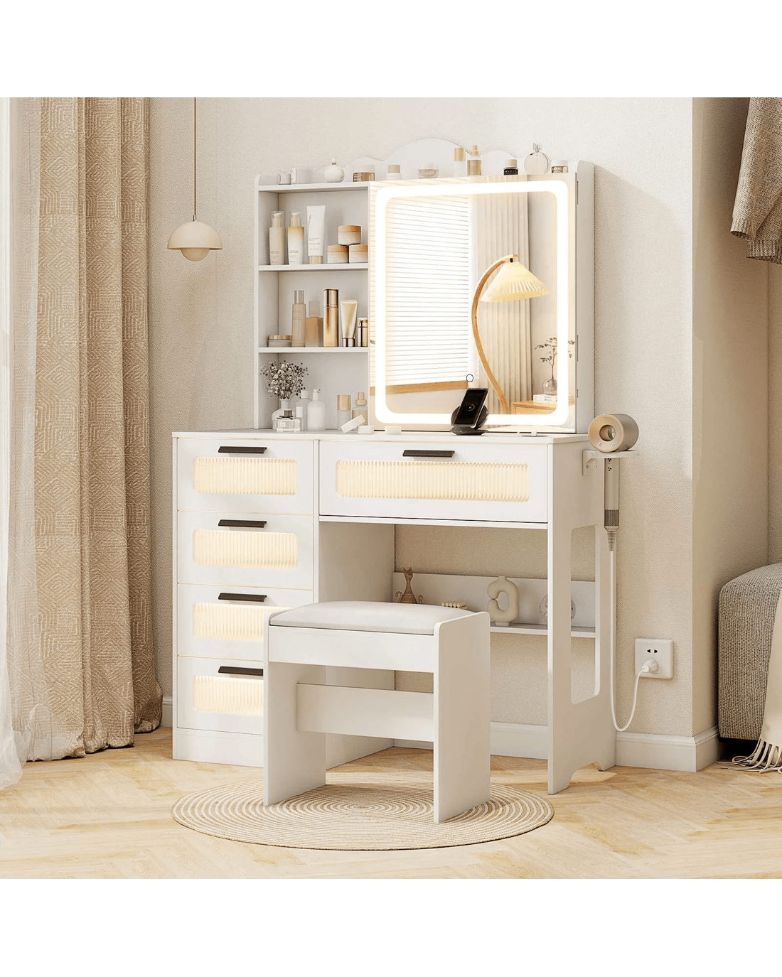 Featuring 1 USB port, 1 Type-C port, and wireless charging capability, you can conveniently power up your devices while getting ready. The HD LED sliding mirror offers adjustable brightness and 3-color lighting options. Moreover, you stay organized with ample storage including open and hidden shelves, hair dryer rack, hooks, and drawers. With its modern design and thoughtful features, this dressing table makes a stylish and practical gift for loved ones.