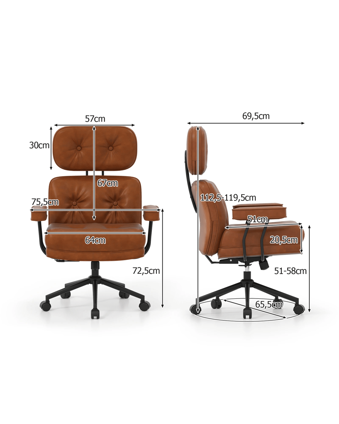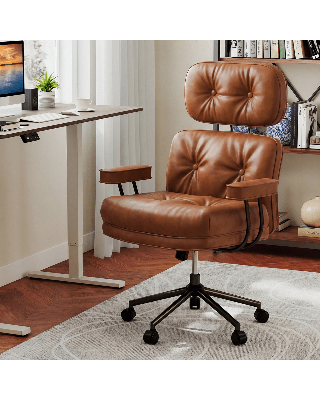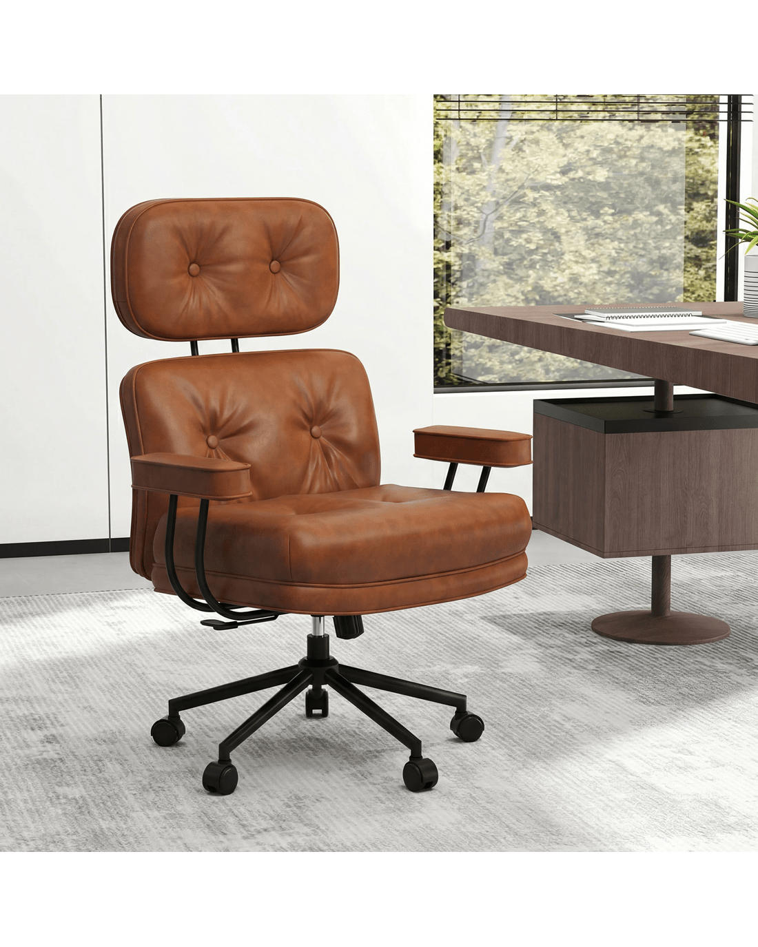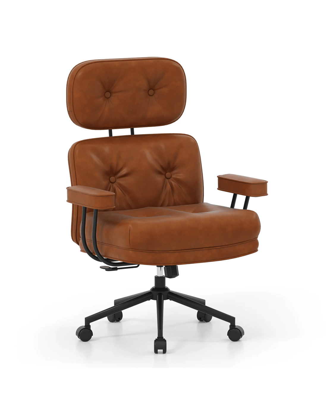 Featuring a reclining backrest adjustable from 90°to 135°, this executive chair allows personalized positioning to reduce fatigue. The widened and thickened tufted seat, upholstered in premium PU leather, provides plush support in this computer desk chair. The adjustable seat height, combined with padded armrests and a supportive headrest, enhances overall comfort. Built on a heavy-duty 5-claw metal base with smooth-rolling wheels, this swivel task chair ensures stability and easy mobility. All in all, this mid-century modern computer desk chair combines durability and mobility, perfect for any workspace.