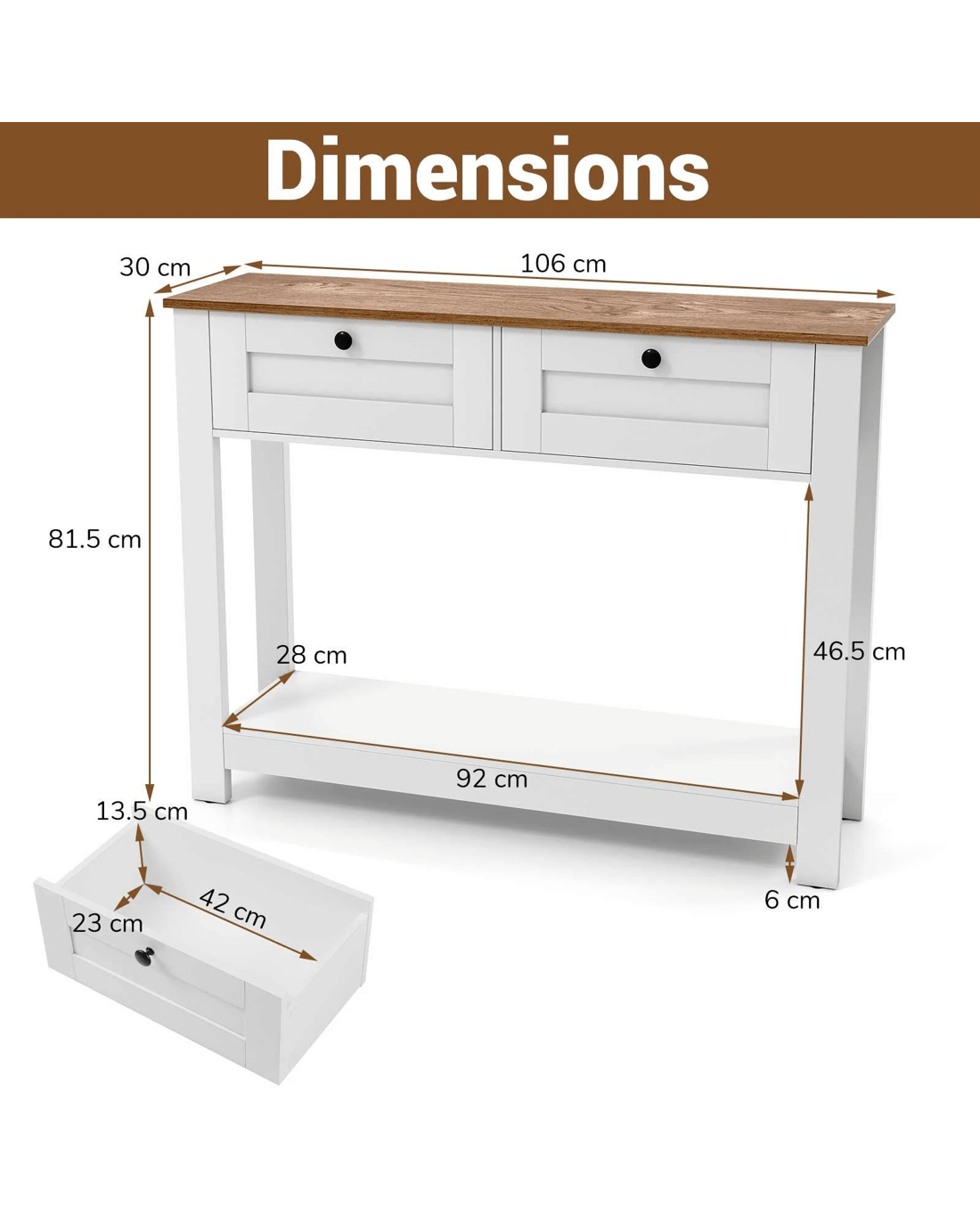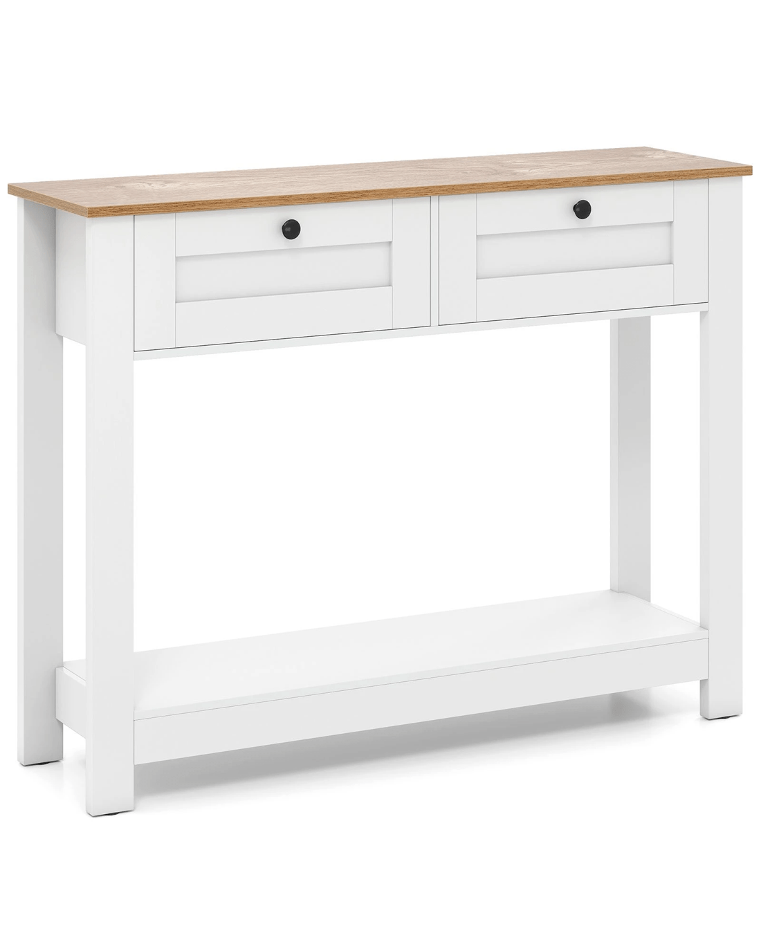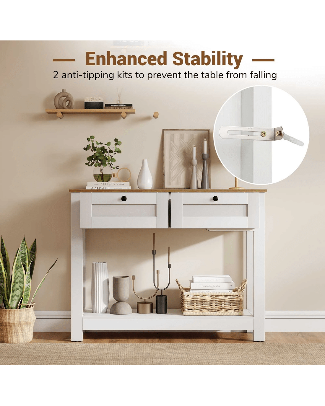 Elevate your home decorations with our enchanting farmhouse console table! Perfectly blending country charm with practicality, this narrow entryway table features a wood grain tabletop finish and clean lines, designed to catch the eye and become the center of attraction in any room. Say goodbye to clutter with 2 drawers and a wide shelf, ideal for storing and displaying in style. Built with strong legs to support up to 80 kg and complete with non-slip foot pads, it ensures stability and scratch-free floors. security is enhanced with included anti-tipping kits, ensuring a worry-free setup. Ideal for tight spaces yet versatile for any room -- entryway, living, or dining. Don't miss out, bring functional elegance into your home today!