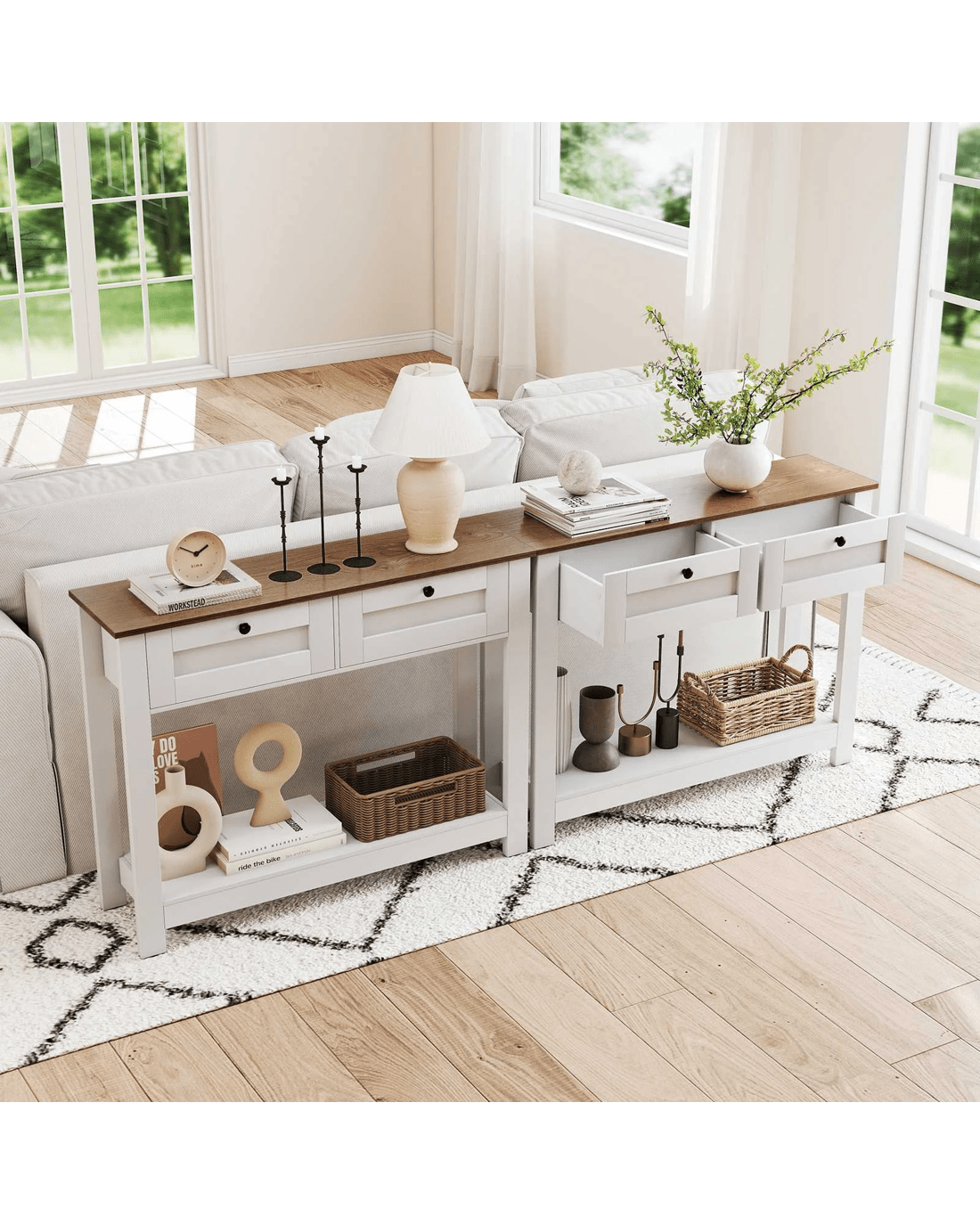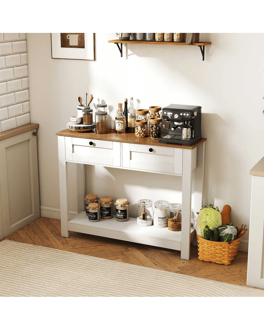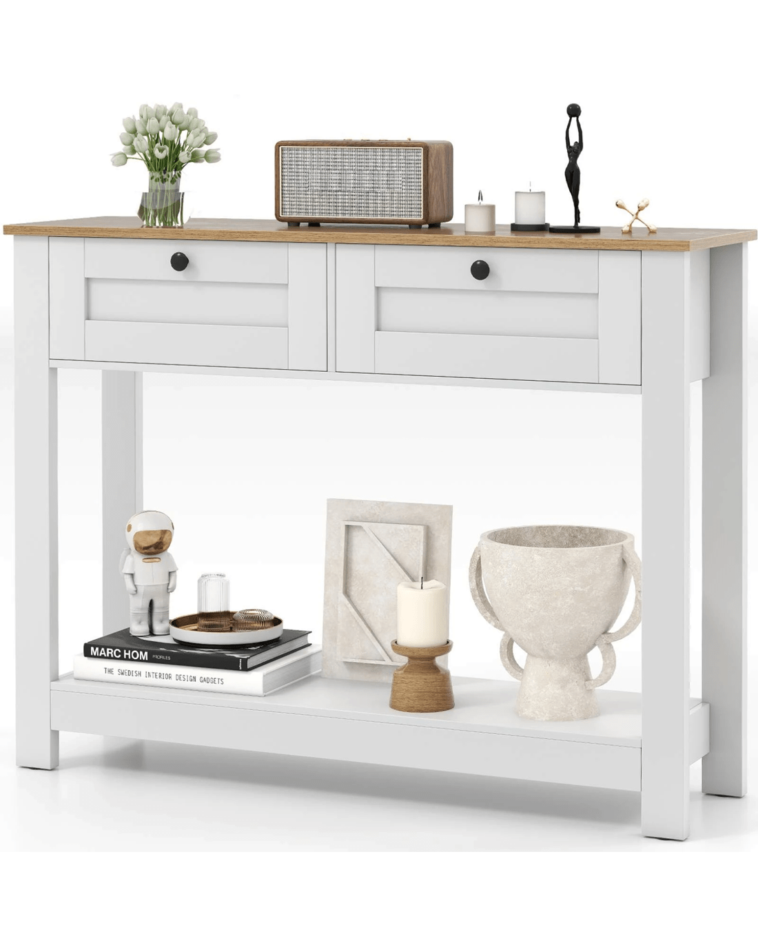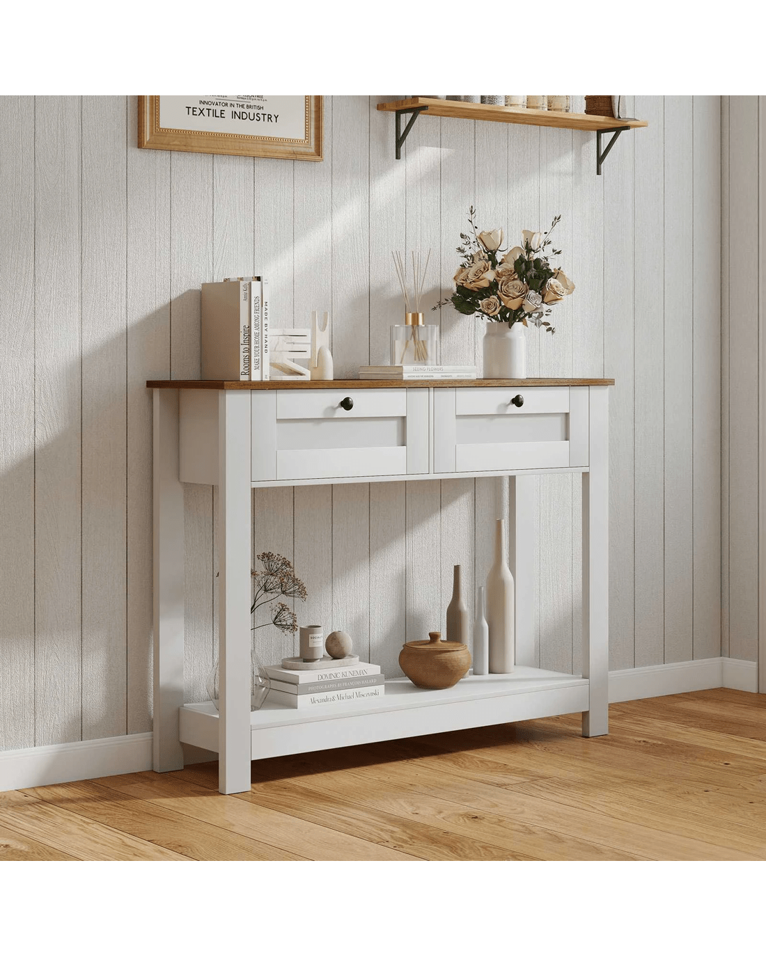 Elevate your home decorations with our enchanting farmhouse console table! Perfectly blending country charm with practicality, this narrow entryway table features a wood grain tabletop finish and clean lines, designed to catch the eye and become the center of attraction in any room. Say goodbye to clutter with 2 drawers and a wide shelf, ideal for storing and displaying in style. Built with strong legs to support up to 80 kg and complete with non-slip foot pads, it ensures stability and scratch-free floors. security is enhanced with included anti-tipping kits, ensuring a worry-free setup. Ideal for tight spaces yet versatile for any room -- entryway, living, or dining. Don't miss out, bring functional elegance into your home today!