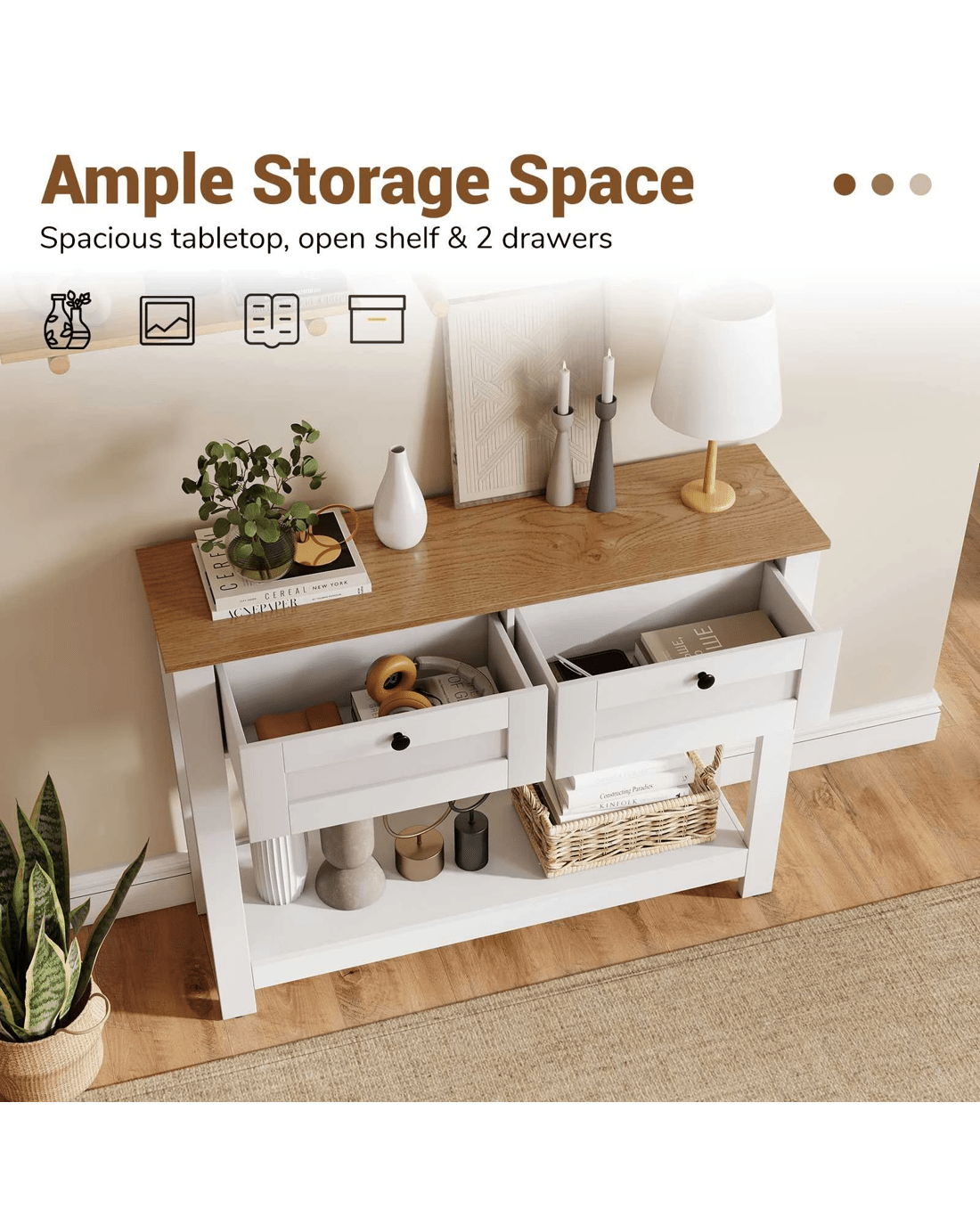 Spacious tabletop and open shelf for a stylish display