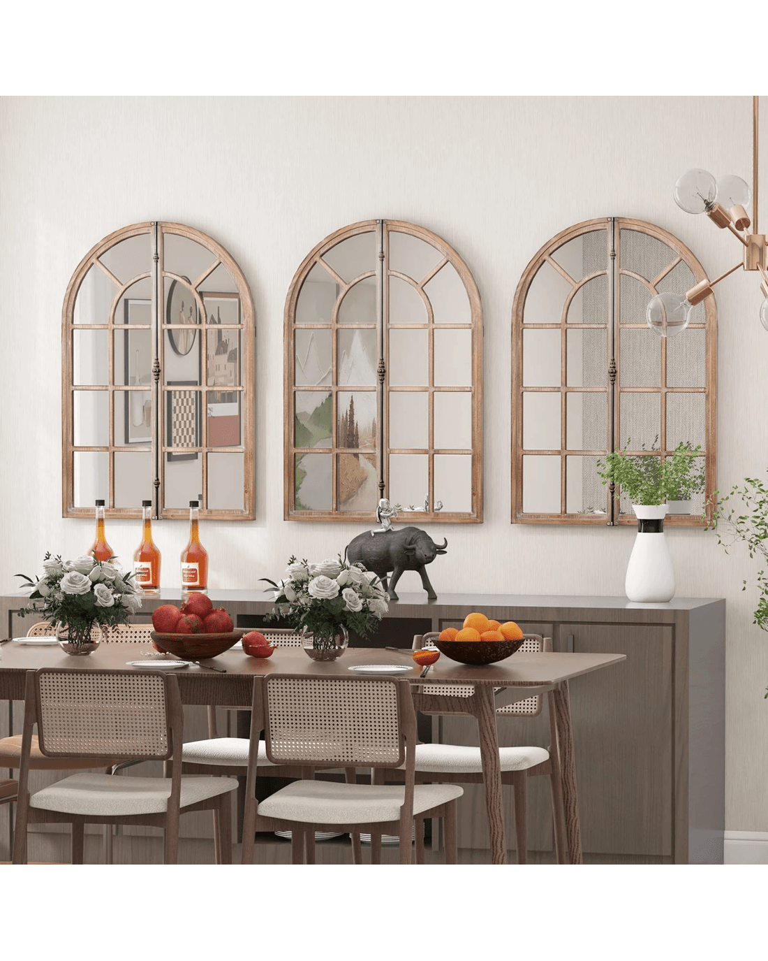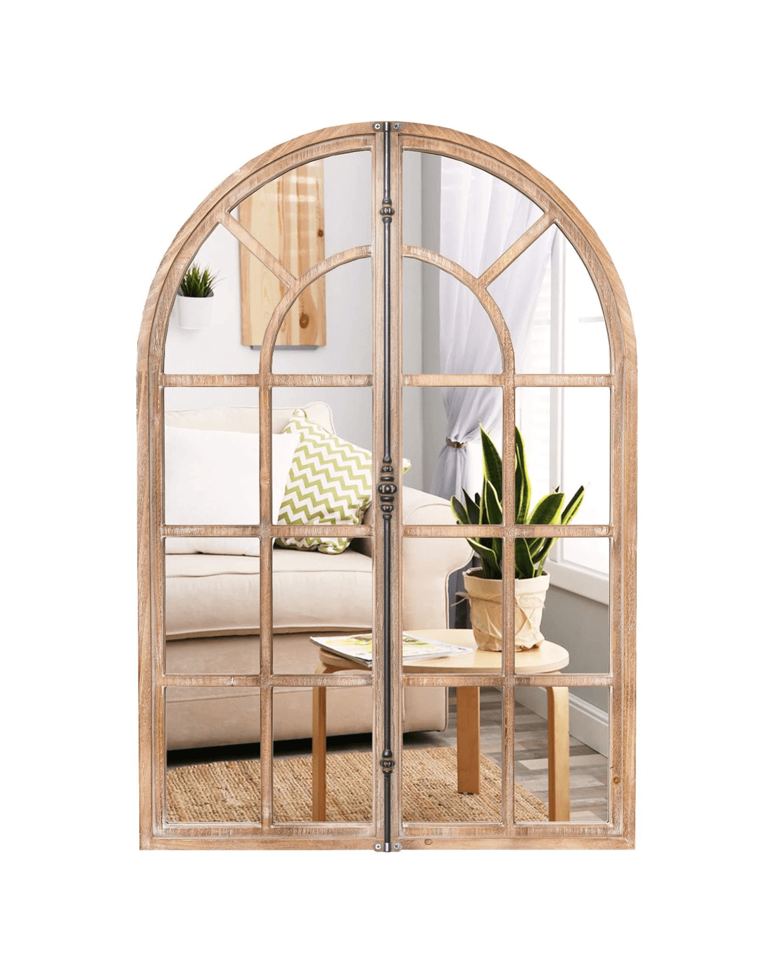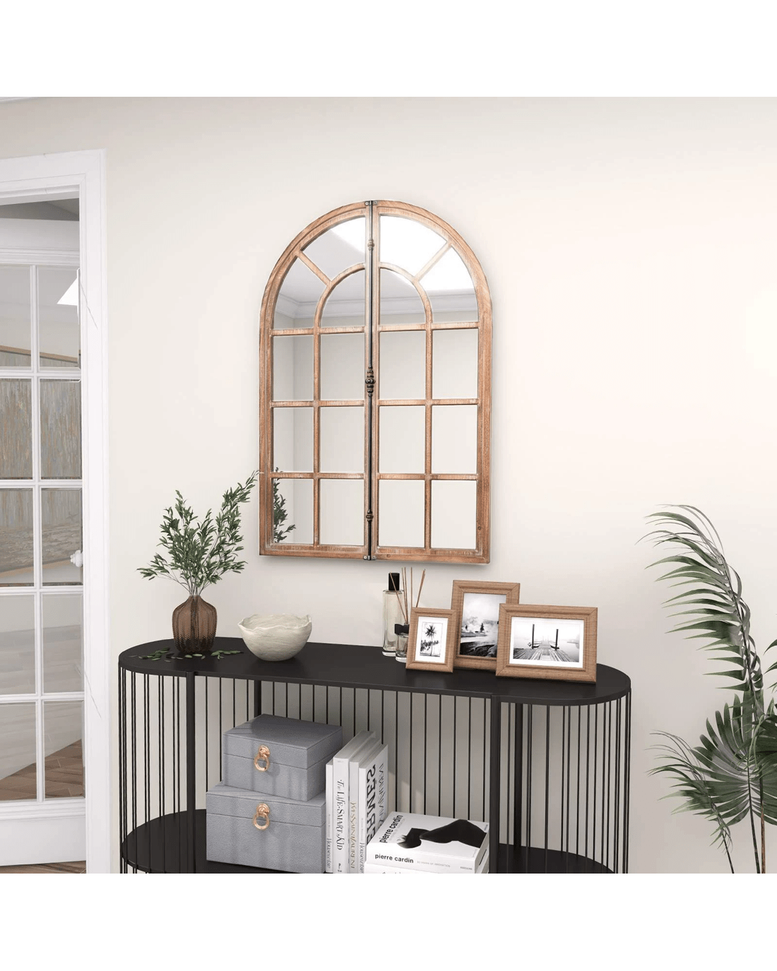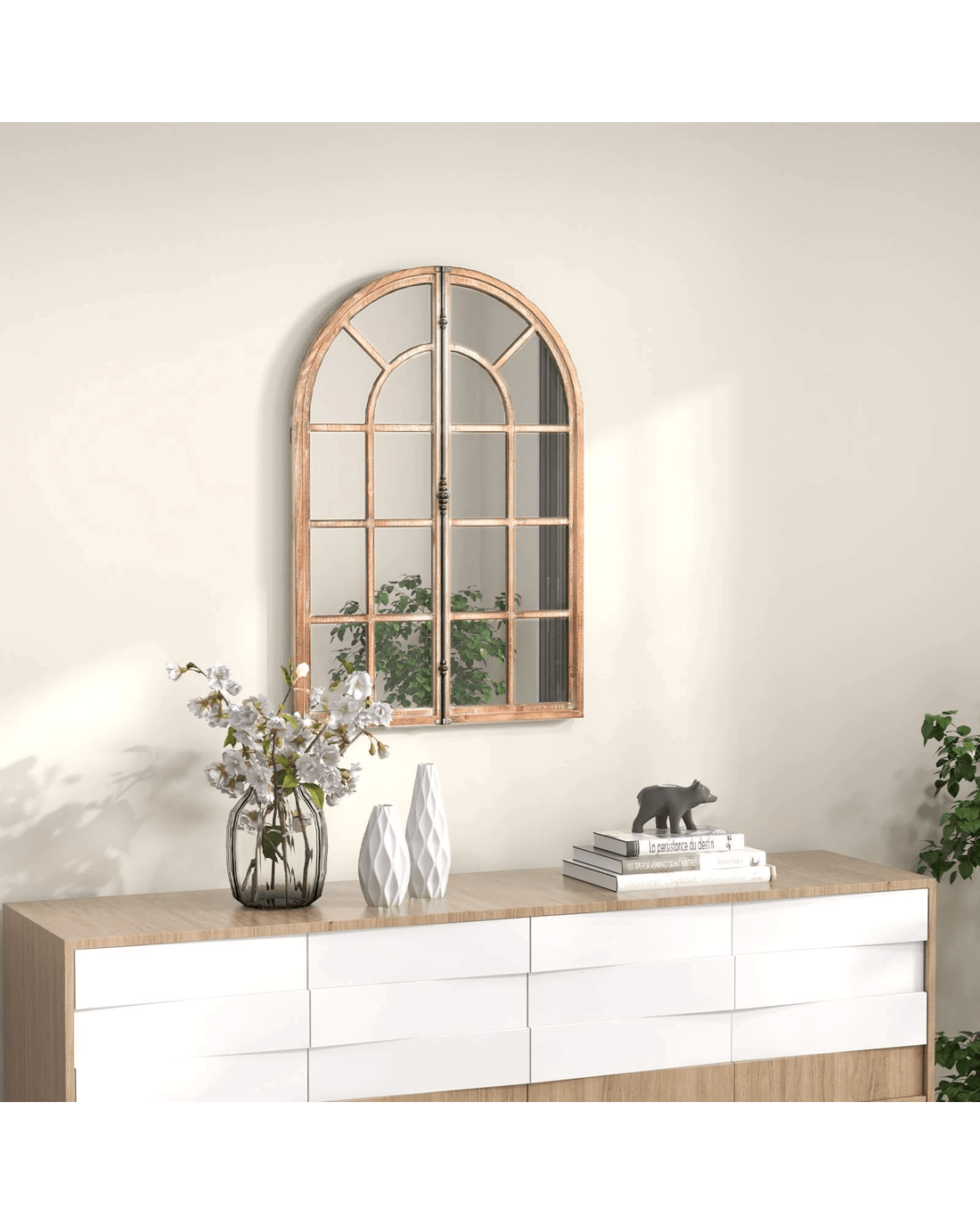 Enhance the rustic charm of your home with our farmhouse-inspired wall mirror. Featuring a rustic wooden frame and intricate metal detailing, this wall mirror will add a timeless appeal and vintage style to your room. The distinctive arch window frame adds depth and creates a captivating focal point in any space. More, you can place 2 or more of them side by side to brighten the entire wall, reflecting light to create a brighter atmosphere. This wall decoration is perfect for the entryway, living room, hallway, fireplace, dining room, or bedroom.