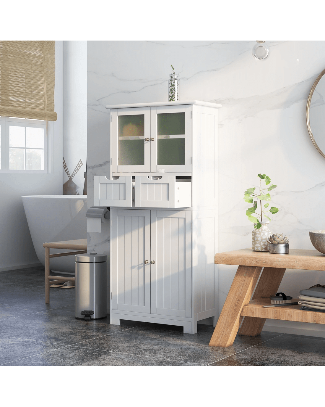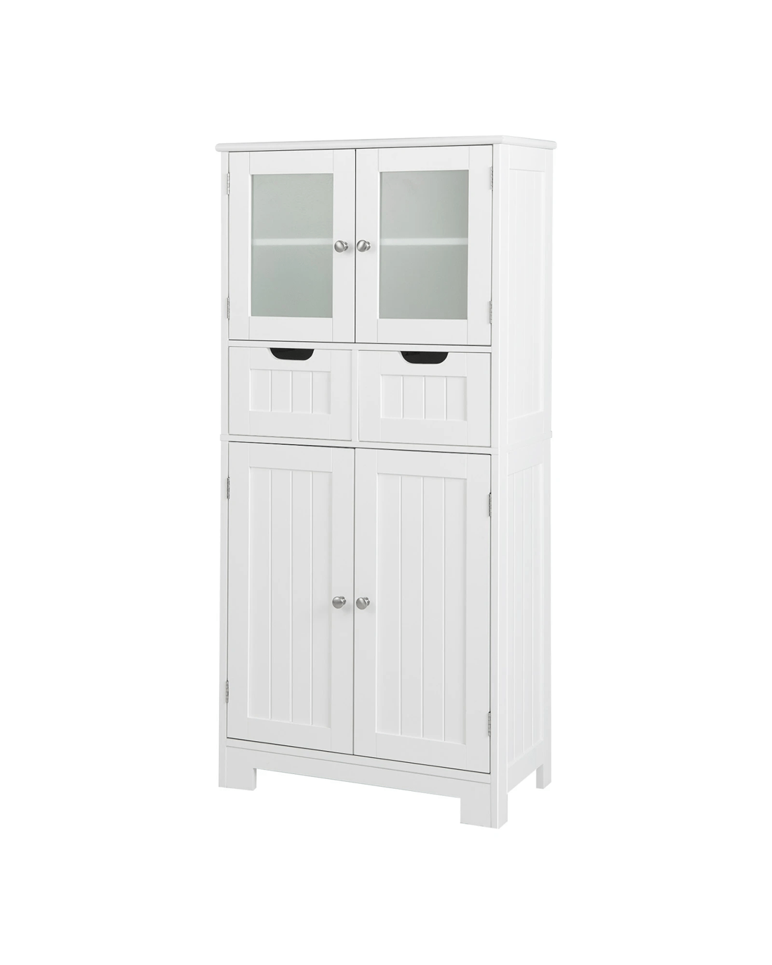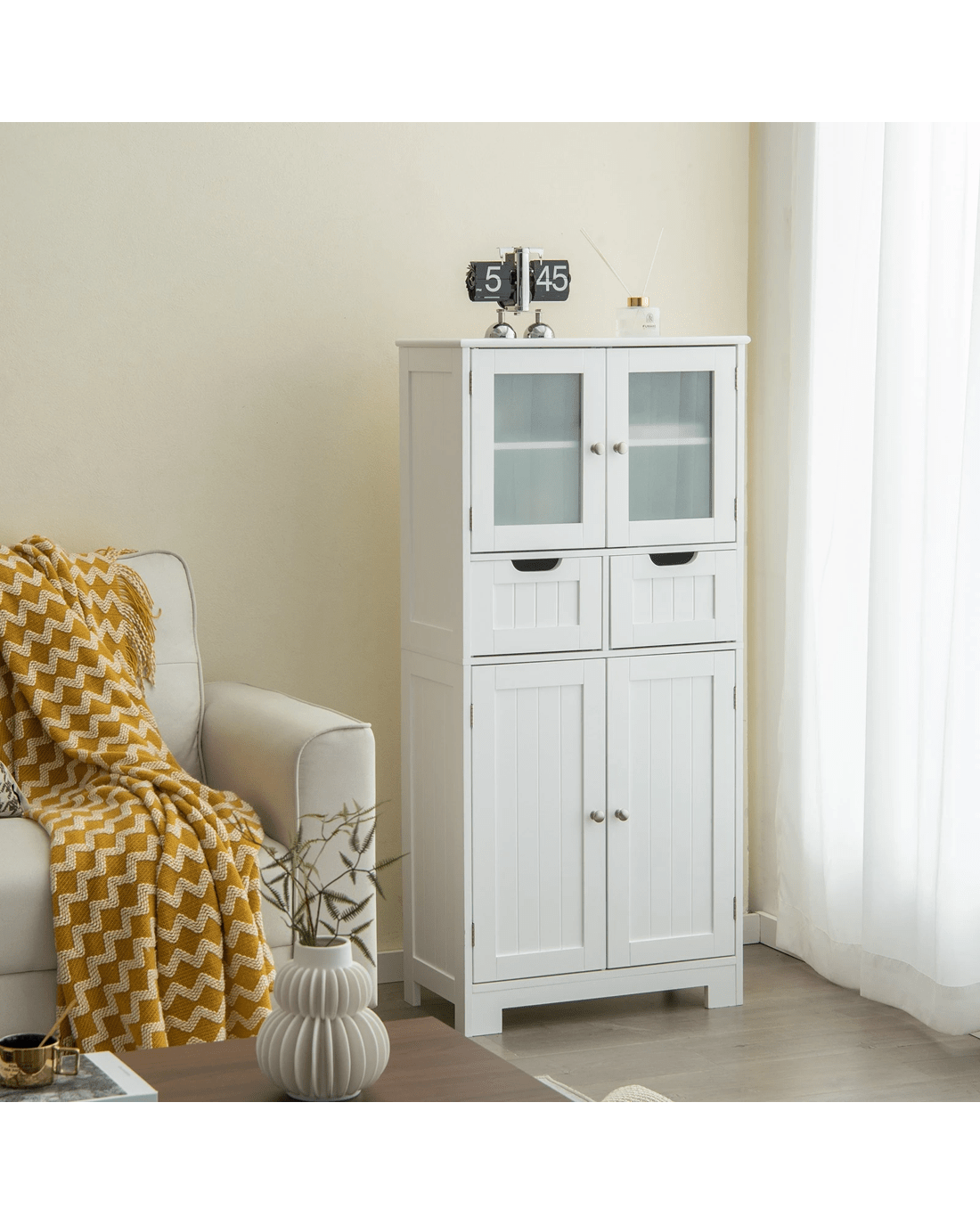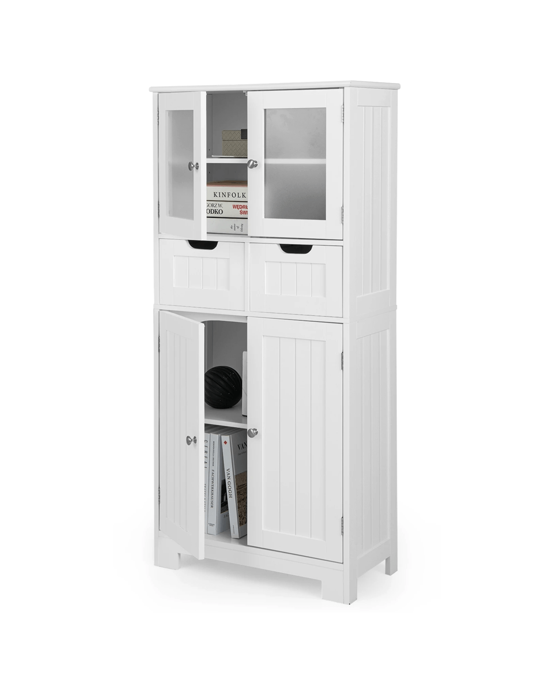 Equipped with a spacious table top, an upper 2 level cupboard with tempered glass doors, 2 drawers and a lower 2 level cupboard with doors, this freestanding cupboard has large and organised storage space for various items such as toiletries, craft items, books, crockery and so on. It is worth mentioning that the shelves can be adjusted to 3 different positions or removed so that you can store items of different heights. The cabinet is made from thick and durable MDF, ensuring a long service life. It also comes with 2 anti tipping devices to ensure the security of you and your family. With a modern look and multi-functional design, this 4-door floor cupboard is suitable for various occasions, such as bathroom, living room, kitchen, etc.