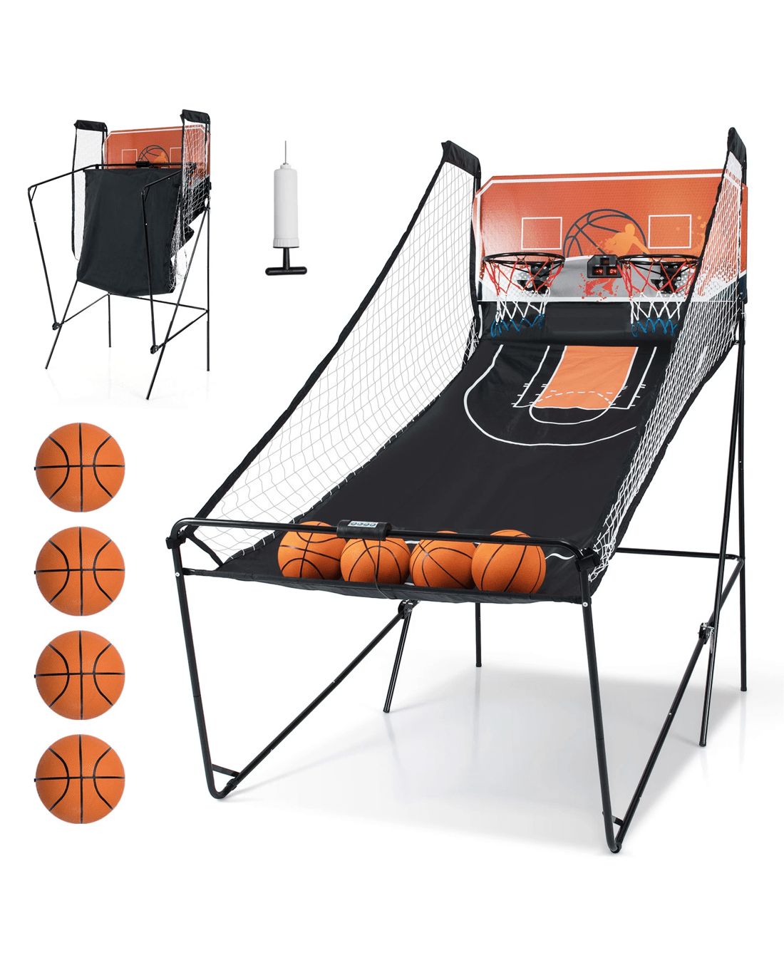 Get ready for endless excitement with this versatile basketball match that offers nonstop fun through 8 modes like beat the time clock and around the world, all designed for easy play by users of any skill level. Equipped with 2 hoops and 4 high-quality basketballs plus an inflation pump, it accommodates up to 4 players, doubling the competitive thrill for families and friends. An LED electronic scoreboard and lively sound effects enhance the immersive experience. When finished, the convenient folding design with a secure lock pin allows for quick storage and transport, ideal for limited spaces or travel. With well crafted details including a sturdy backboard, strong rims, wear-resistant grid, enduring ramp and anti-slip foot pads, this match ensures stable and long-lasting enjoyment for indoor play.