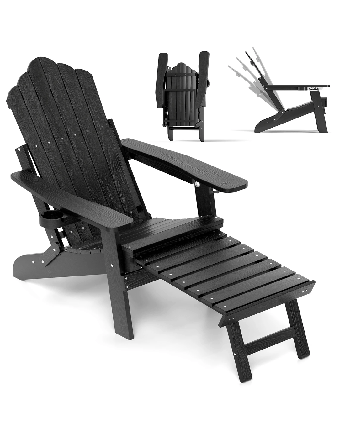 Featuring a 4-level adjustable backrest, this lounge chair allows you to comfortably read, sunbath, and nap. Made from premium all-weather HIPS material and reinforced with stainless steel screws, the Adirondack chair stands against all climatic conditions, ensuring durability and low maintenance. The cozy seat includes a rotatory cup holder for your drinks or gadgets, enhancing its utility. With quick-folding design and retractable footrest, the oversized chair is space-efficient and easy to store and move. Elevate your backyard or patio area with this stylish and functional Adirondack chair, a perfect blend of comfort and convenience for any home.