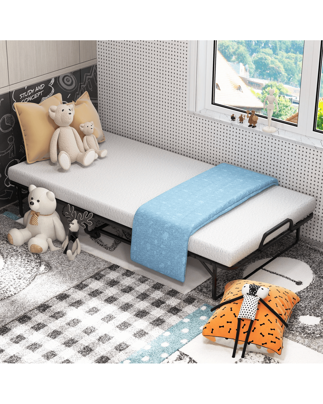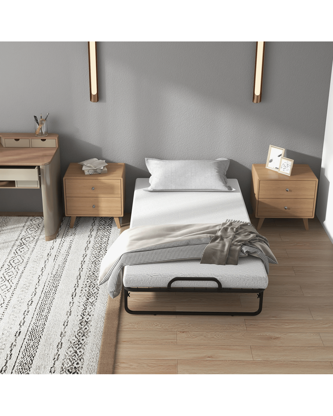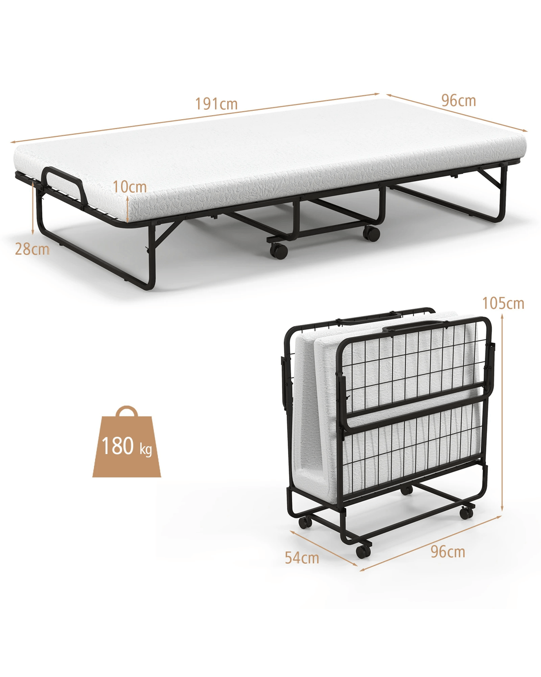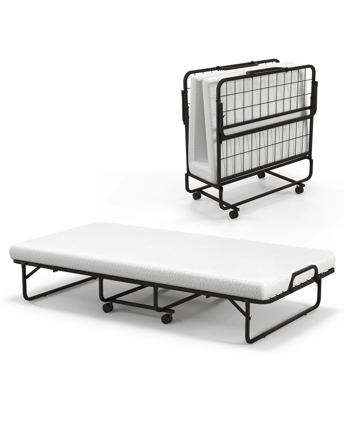 Have you found a sturdy yet comfortable folding bed? The rollaway bed with mattress is designed to achieve this. Supported by powder-coated metal frame, the folding bed has the characteristics of good toughness and bending resistance. Thick and soft mattress is stuffed with soft memory foam and base support foam that allow you to sleep more comfortably. In addition, the rollaway guest bed is easy to fold away in a few simple steps, which can be stored in the corner to improve space utilization. The folding bed is equipped with 4 smooth rolling wheels (2 lockable) for great mobility. Combining with reliable quality and delicate craftsmanship, the portable folding bed can be served as a spare guest bed in the home and office, or used for outdoor camping.