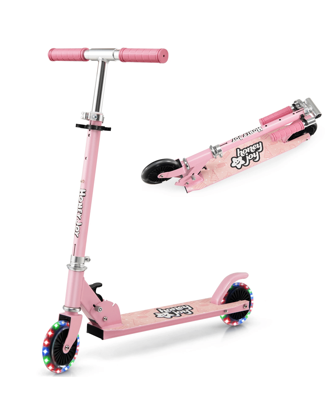 Designed with a 3-position adjustable handlebar, this kick scooter can meet various needs and grow up. Anti-slip hand grips, wear-resistant PU wheels with shock-absorbing bearing can offer little ones a smooth and safe ride. Besides, the wheels can light up without batteries when riding, offering more fun and higher security at night. The rear brake makes it easy to stop and the wide deck brings a more comfortable riding experience. Made of high-quality aluminum alloy and steel, this scooter ensures great stability, a strong load capacity of up to 50kg and long-lasting use. What's more, with a quick folding design, this lightweight kick scooter is easy to store and carry.