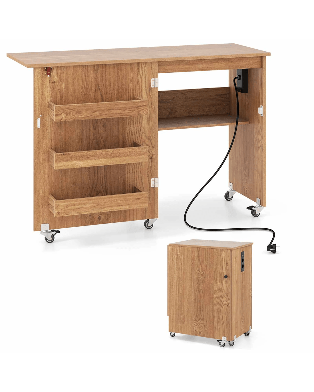 Costway Folding Sewing Table w/Power Outlet Mobile Craft Station Desk - Natural