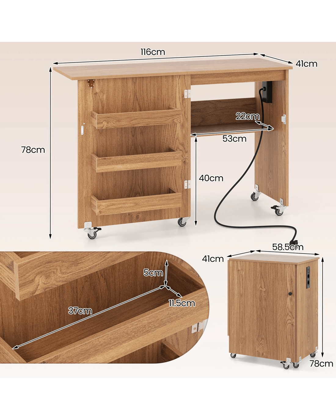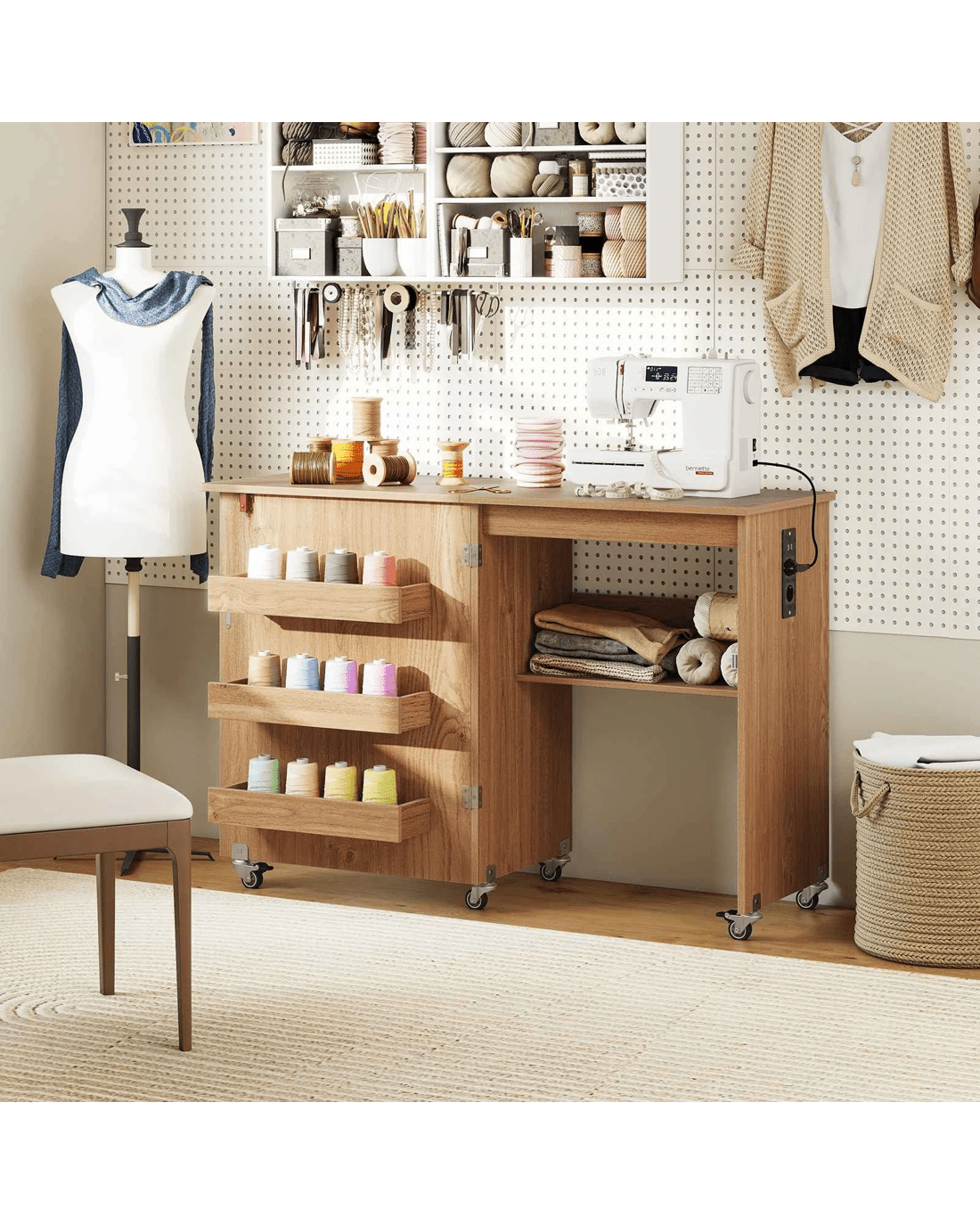 nleash your creativity with our must-have 2-in-1 folding sewing table! This ingenious design boasts a spacious work surface that folds down into a chic storage cabinet, keeping your space clutter-free. With a built-in charging station offering multiple outlets, you can effortlessly power your devices right where you work. Stay organized with a generous open shelf and 3 handy storage trays, ensuring all your sewing tools are always at your fingertips. Plus, glide it around effortlessly! With 5 universal casters—3 lockable—this sewing machine table boasts excellent stability when you need it. And it’s not just for sewing; it doubles as a modern computer desk or stylish cabinet! Elevate your workspace experience today!