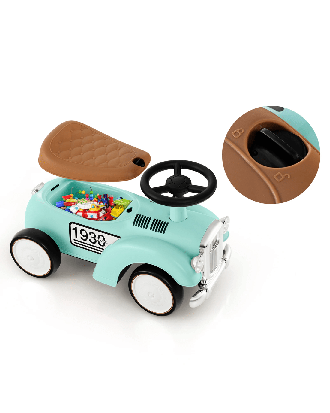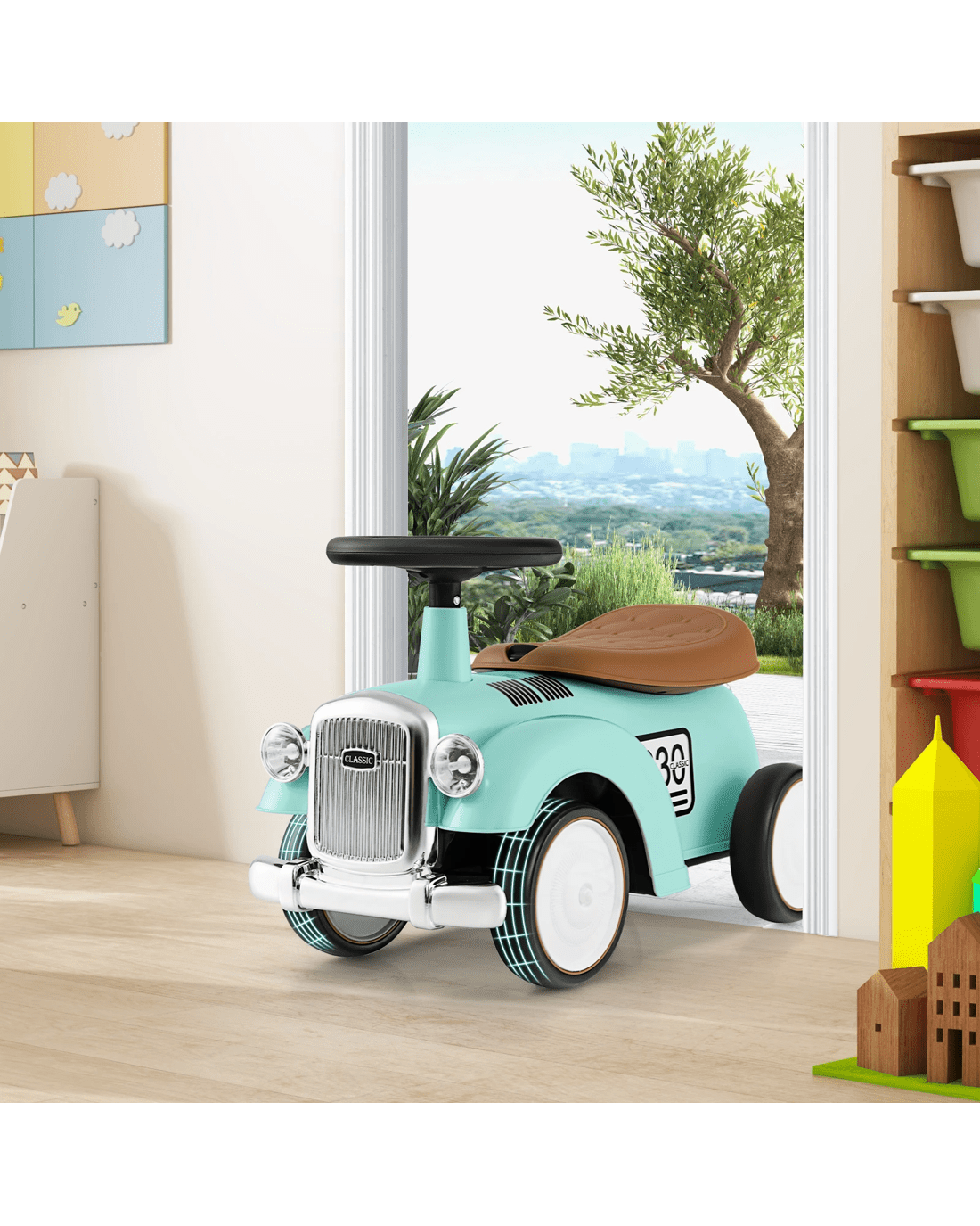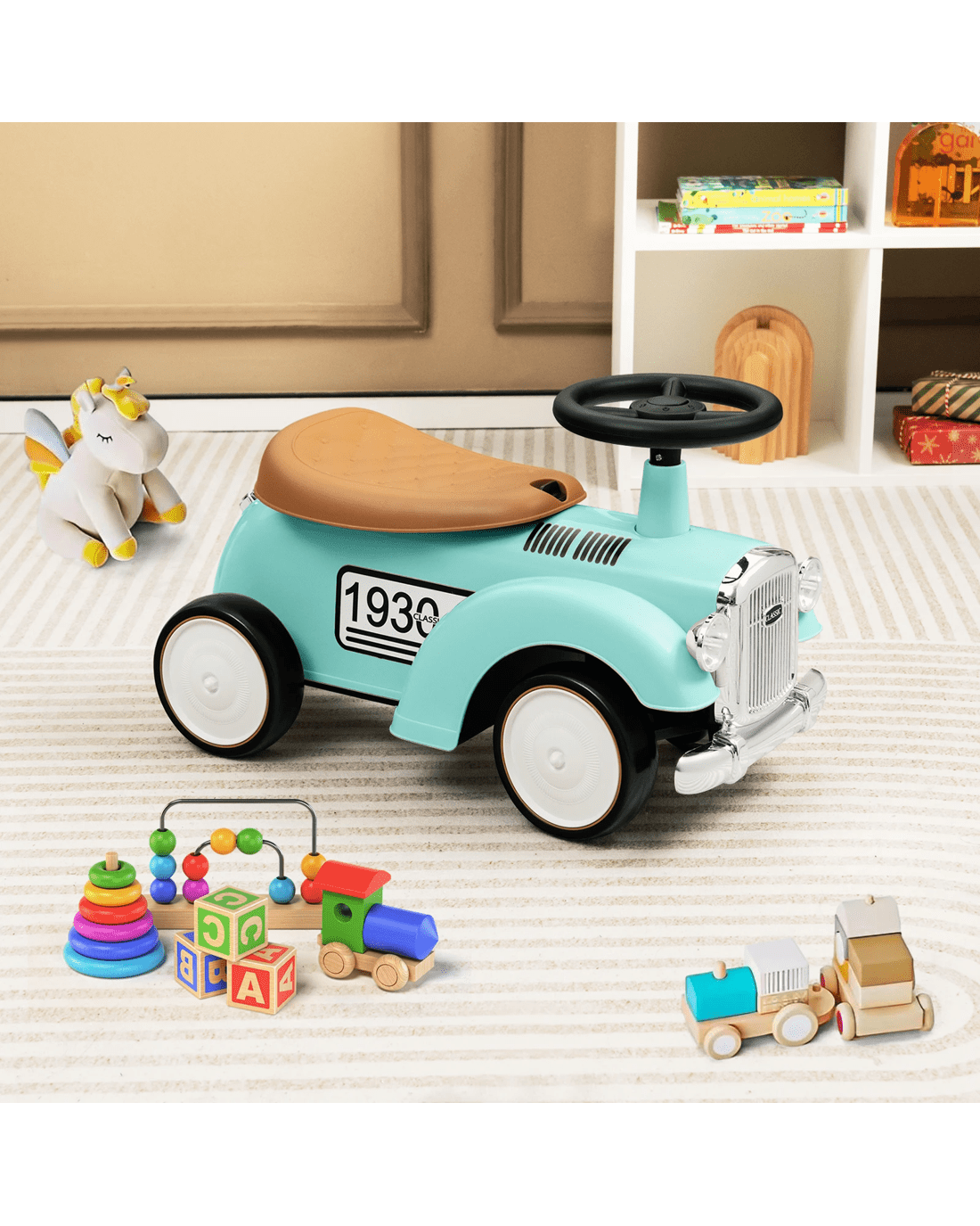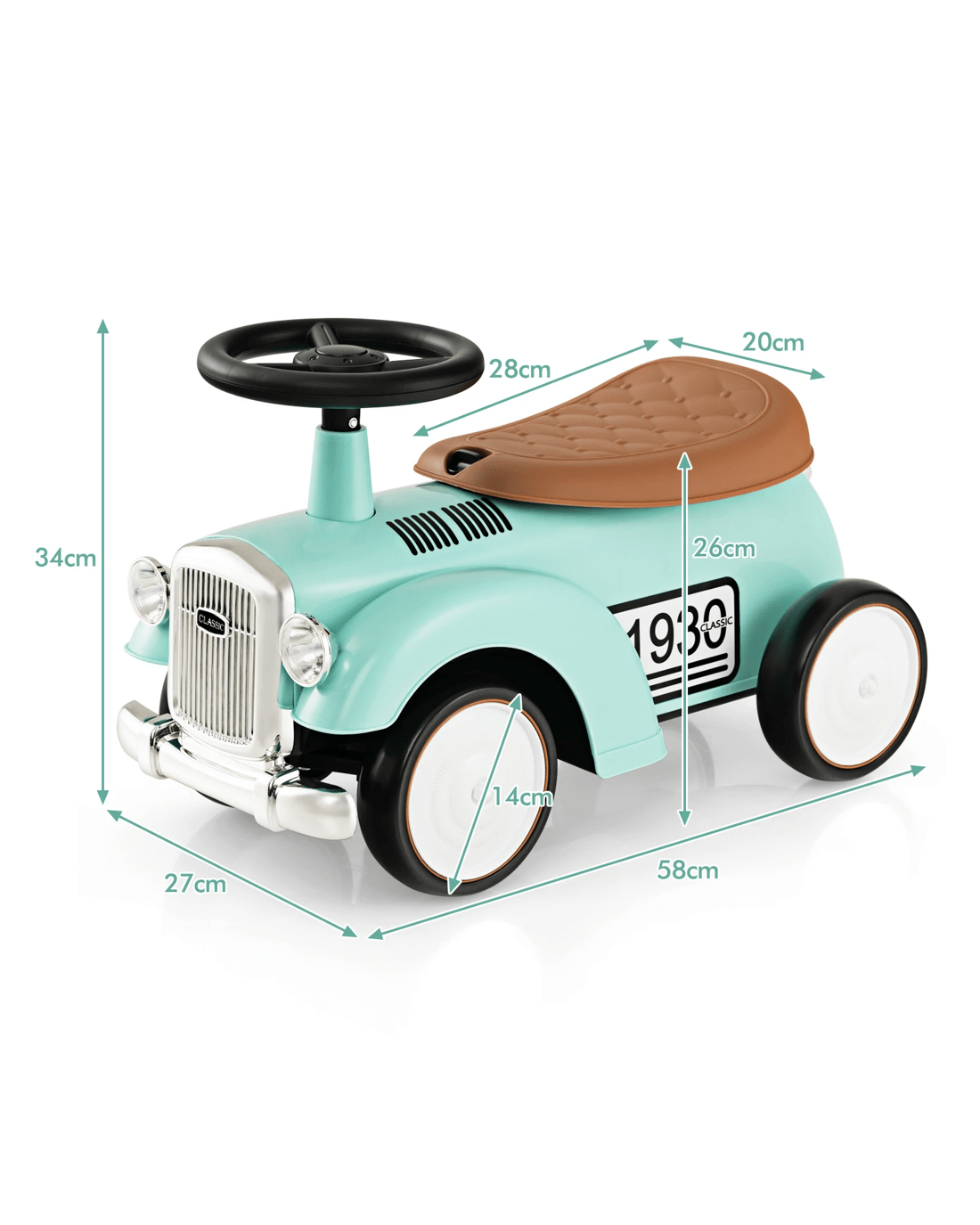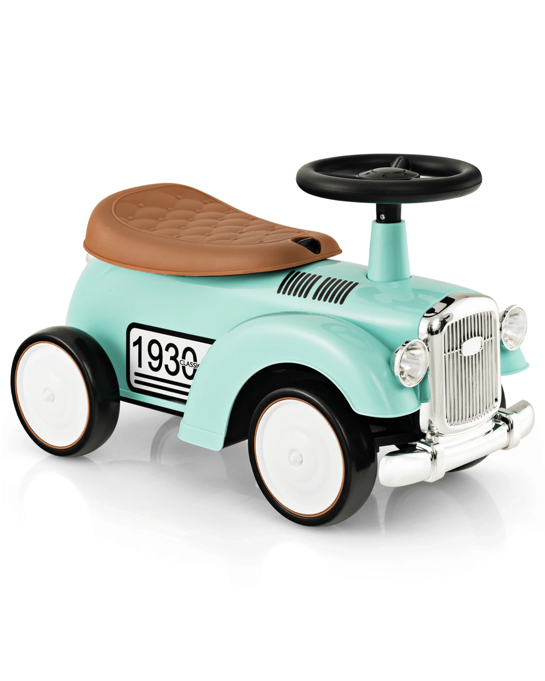 Made of high-strength materials, this ride-on car is built to accompany little ones to grow up. With a working steering wheel, little ones are able to turn left or right easily. And the 40° limit steering keeps little onesren always safe while riding. Besides, the slightly curved seat enables little ones to sit comfortably. By rotating the knob, you can remove the seat and there is practical storage space for objects. More importantly, the large and smooth wheels adapt well on various roads. So, little ones can enjoy indoor or outdoor riding for different fun. Riding is a good way for little ones to develop motor skills and promote balance. Furthermore, the retro appearance with DIY stickers makes this foot to floor riding toy more attractive to little onesren.