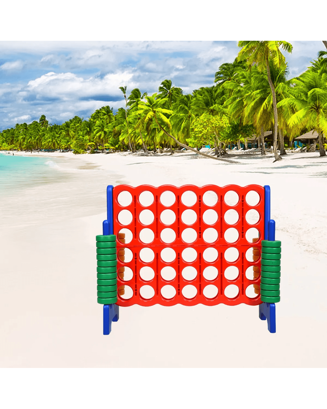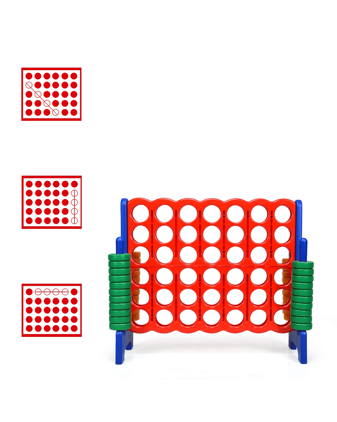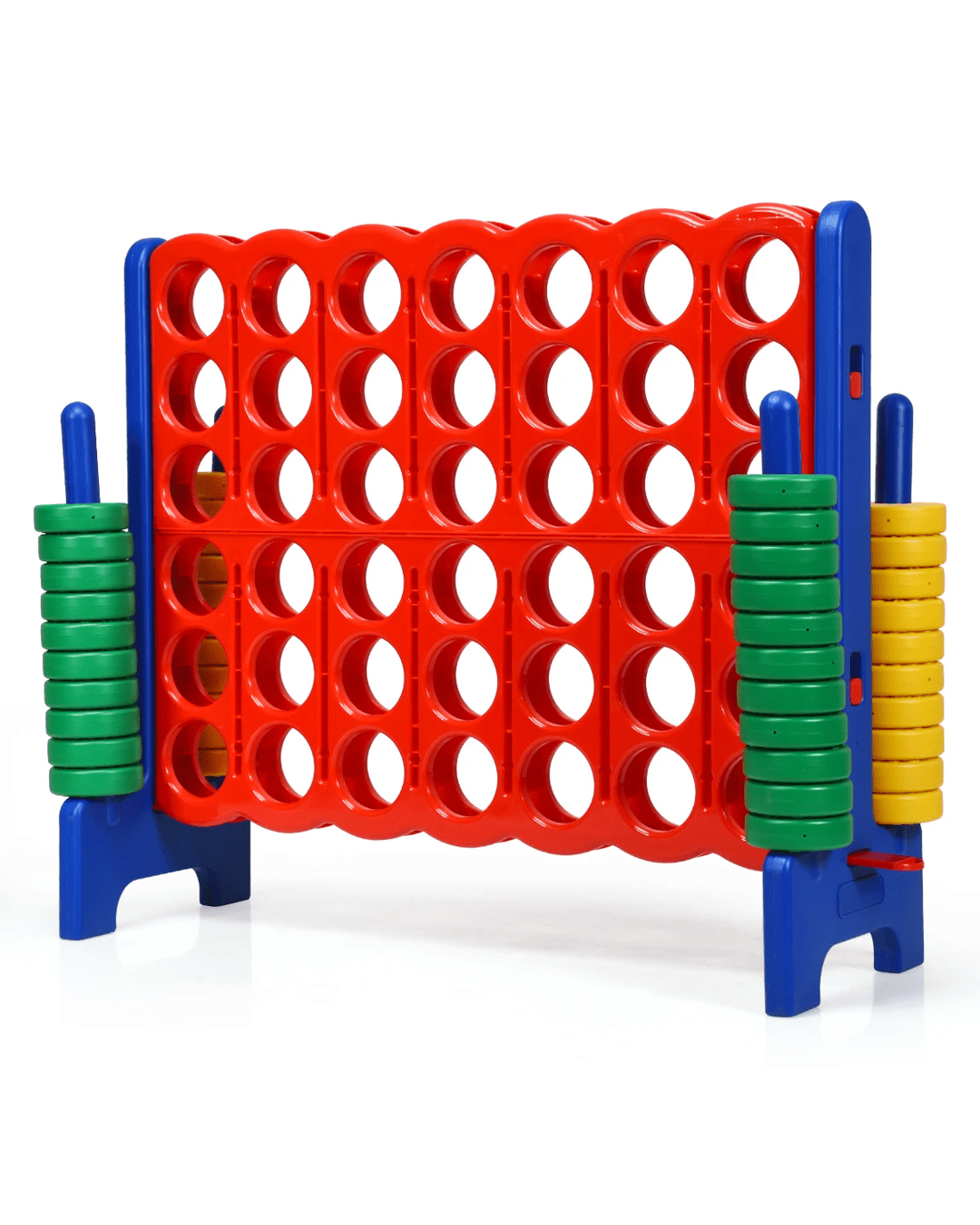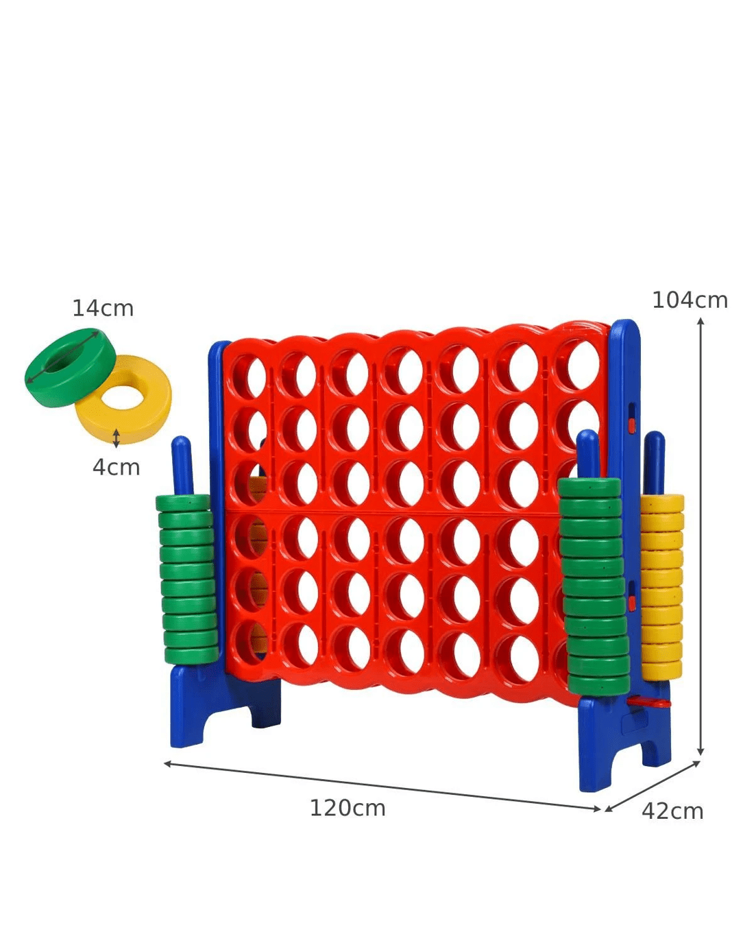 Take a look at the jumbo 4-to-score giant game set we've prepared for you and your little ones. 104cm height makes it suitable for outdoor game. And you can compete with your friends and enjoy the happy time with them. Our 4-to-score connect game is made of premium PE and PP materials, which provide a long service life.