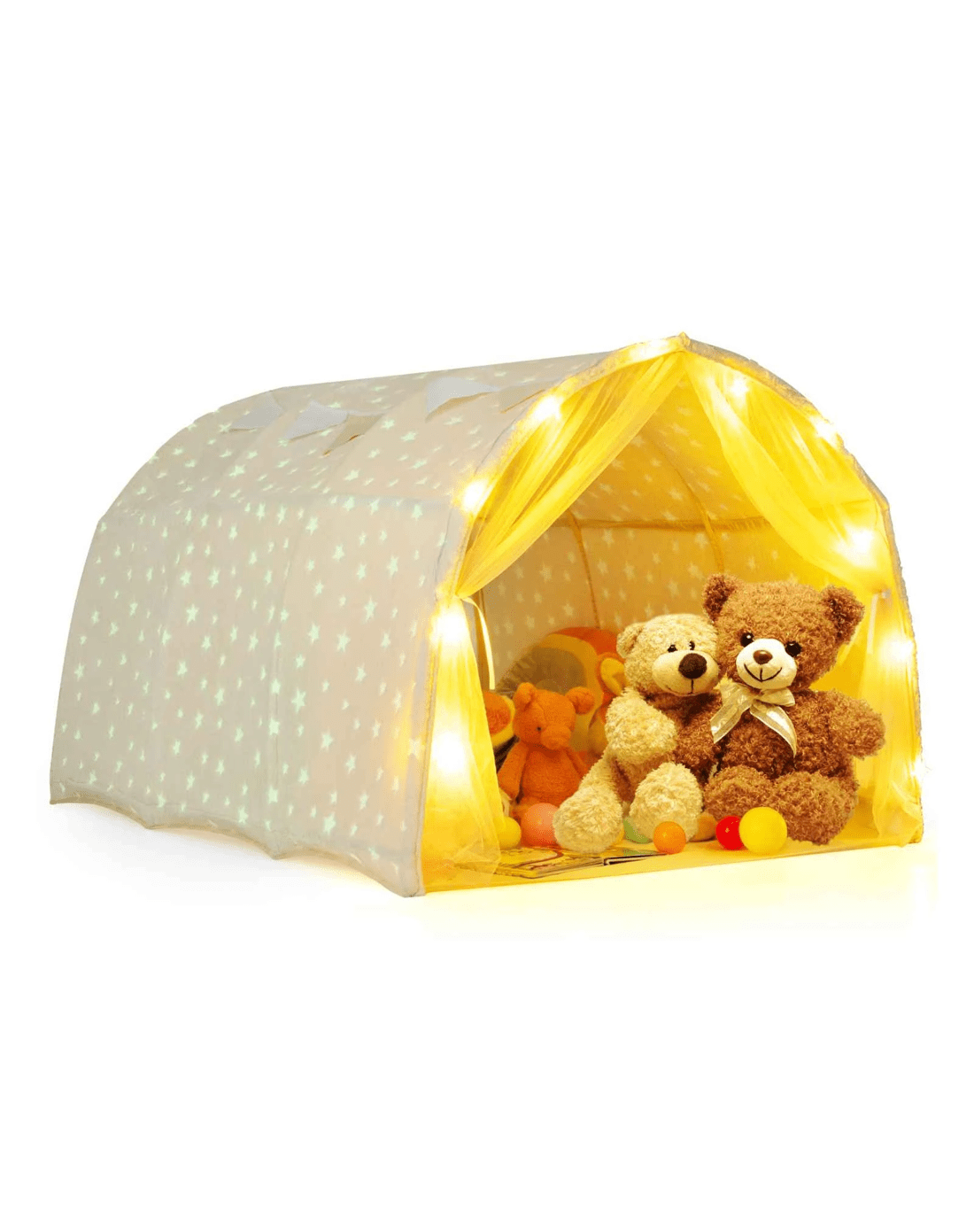 Looking for a gift to ignite your little one's imagination? The 2-in-1 bed tent is a unique bed canopy that will make little ones’ bedtime an exciting experience. The little ones bed shelter can meet dual purpose as a play area during the day and cozy sleep area at night. Designed to fit twin beds, this bed tent is designed to provide a secure and comfortable sleeping space for your little one. More importantly, the star pattern on the little ones bed tent will emit green lights in the night or dark surroundings, transporting little ones to a magical wonderland. Also, the front and rear mesh curtains will promote ventilation and prevent unwanted guests. Equipped with a star light string and flag banner, the magical play tent exudes charm and sweetness, turning any room into a whimsical paradise. Crafted with skin-friendly flannel fabric and fiberglass poles, the twin bed tent for little ones is built-to-last.