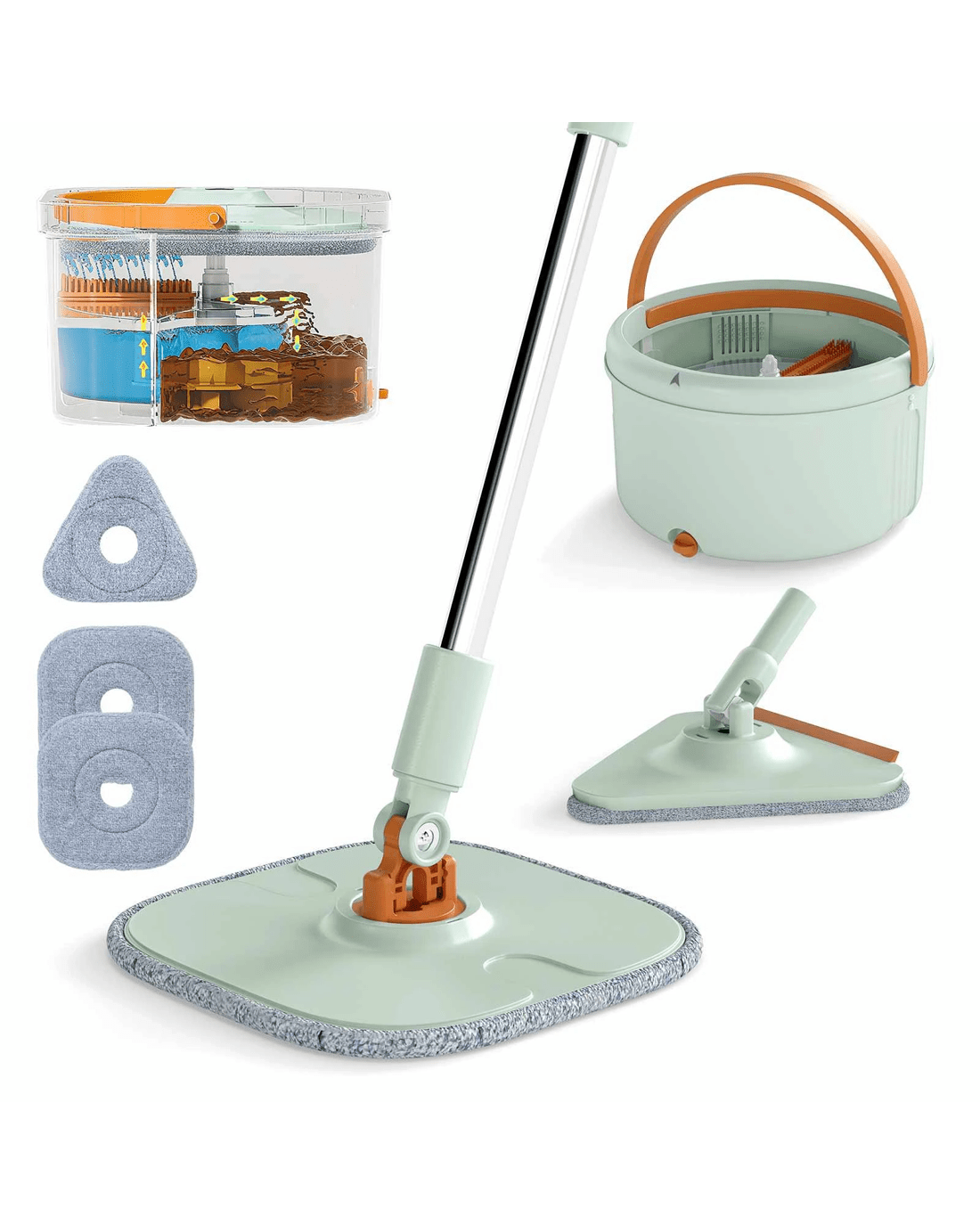 This versatile mop and bucket system ensures a effective clean with its innovative water separation technology, keeping fresh water distinct from dirty to prevent cross-contamination. Equipped with a mechanical spray, comb scrubber, and a filter basket, it efficiently rinses, filters debris, and ensures hands-free mop washing. Featuring 2 mop heads - a rectangular and a triangular one - that rotate 360 degree, it effortlessly reaches tight corners and underneath furniture. Adjustable handles provide personalized comfort during use. Perfect for both wet mopping and dry dusting, it is designed for different stains and surfaces, like hardwood, tile, windows, and ceilings, even cleaning under low-clearance spaces as narrow as 6 cm. The set includes highly absorbent, quick-drying microfiber pads in different shapes, which are machine washable and excel at trapping hair and dirt. Designed with user convenience in mind, this floor cleaning kit offers easy disassembly.