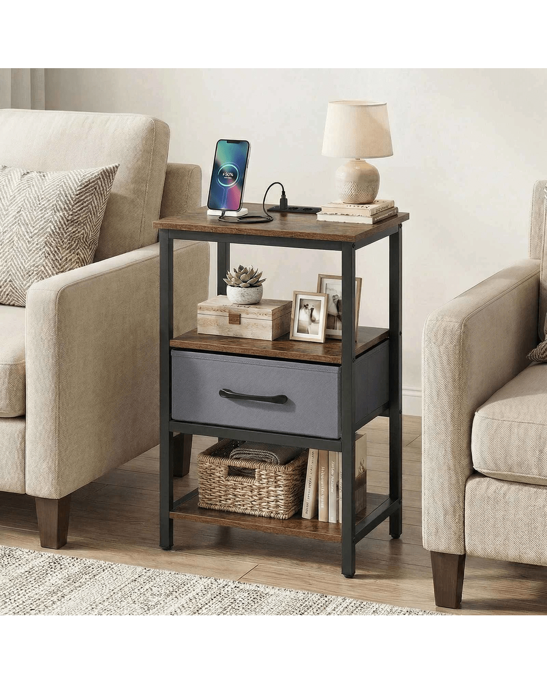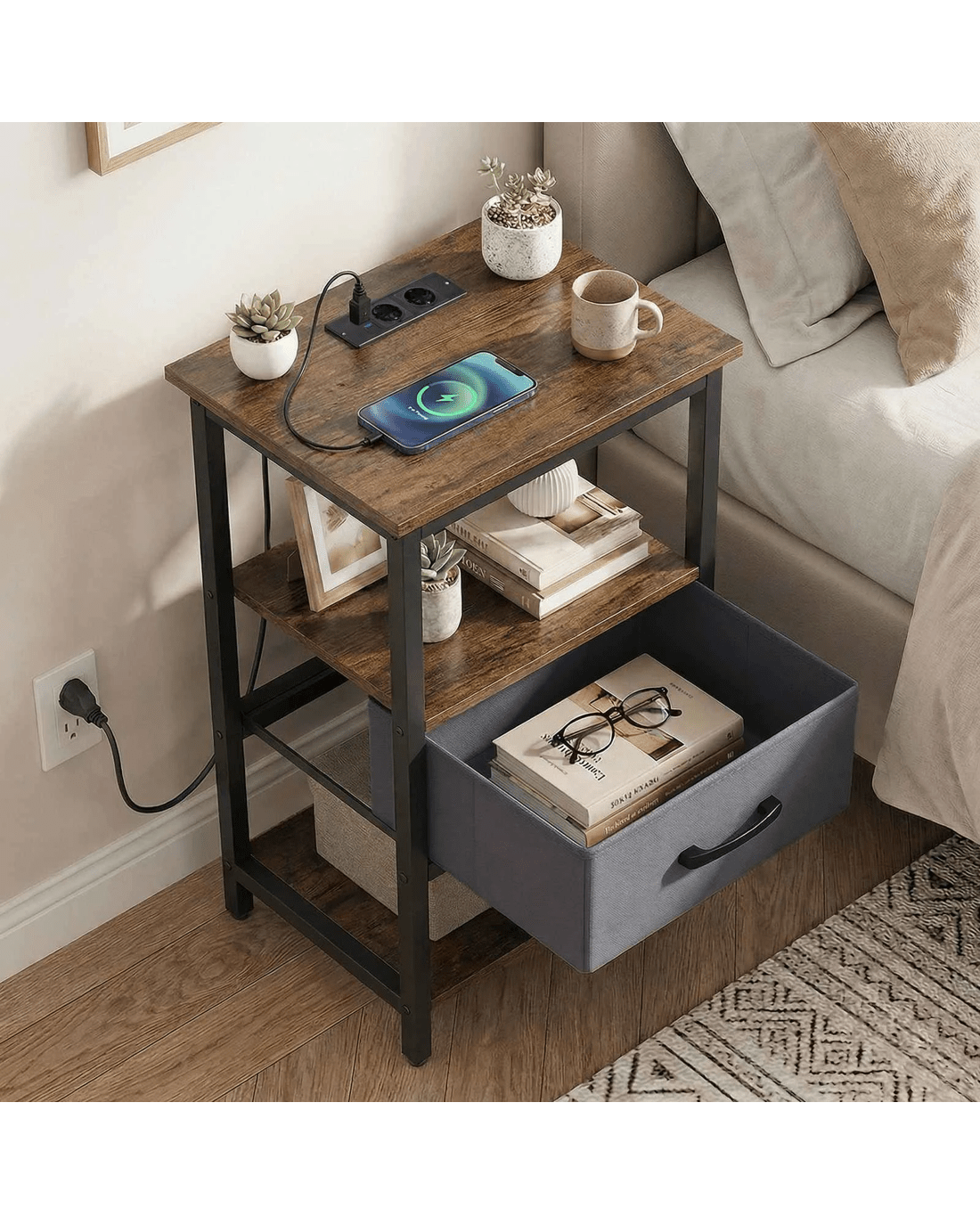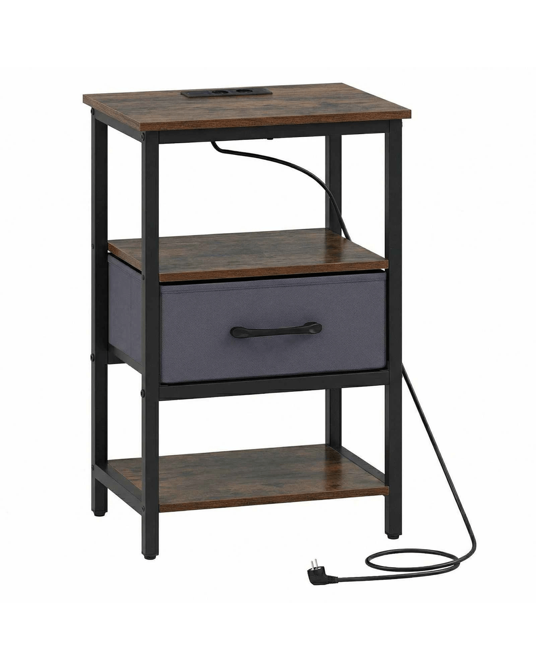 Costway Industrial Bedside Table Nightstand w/Drawer & Power Outlets