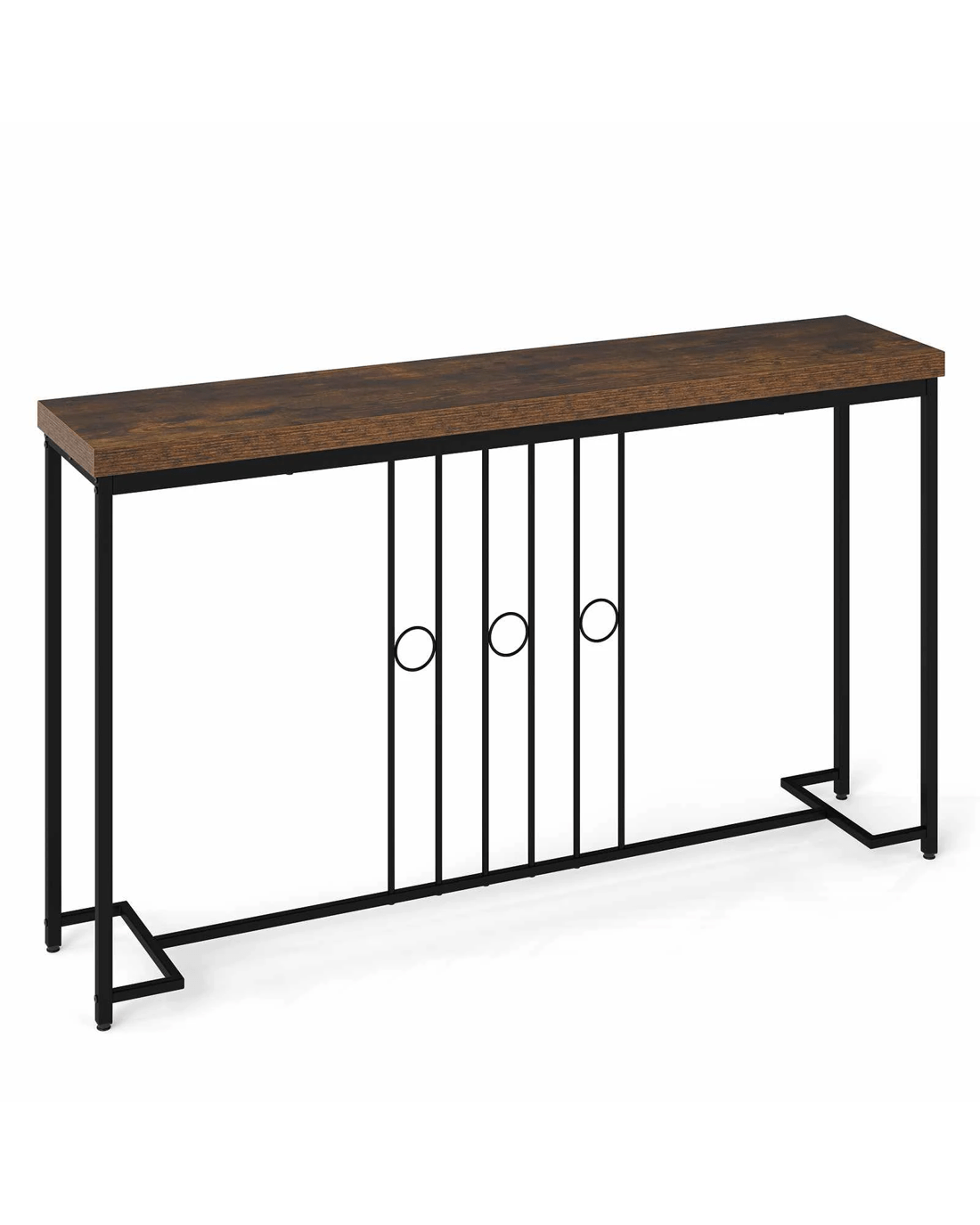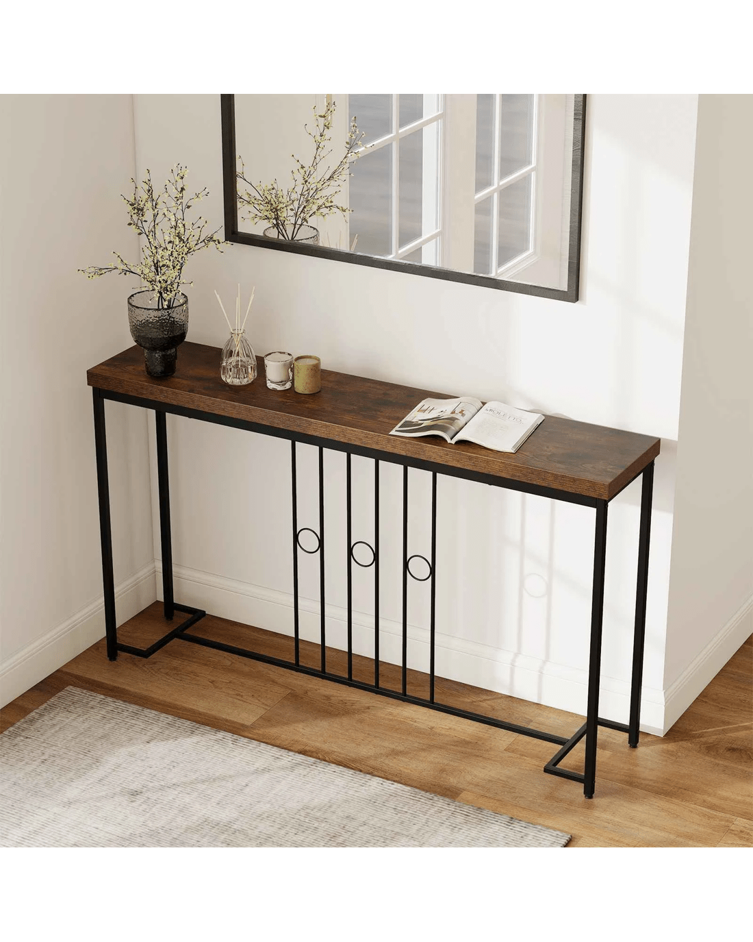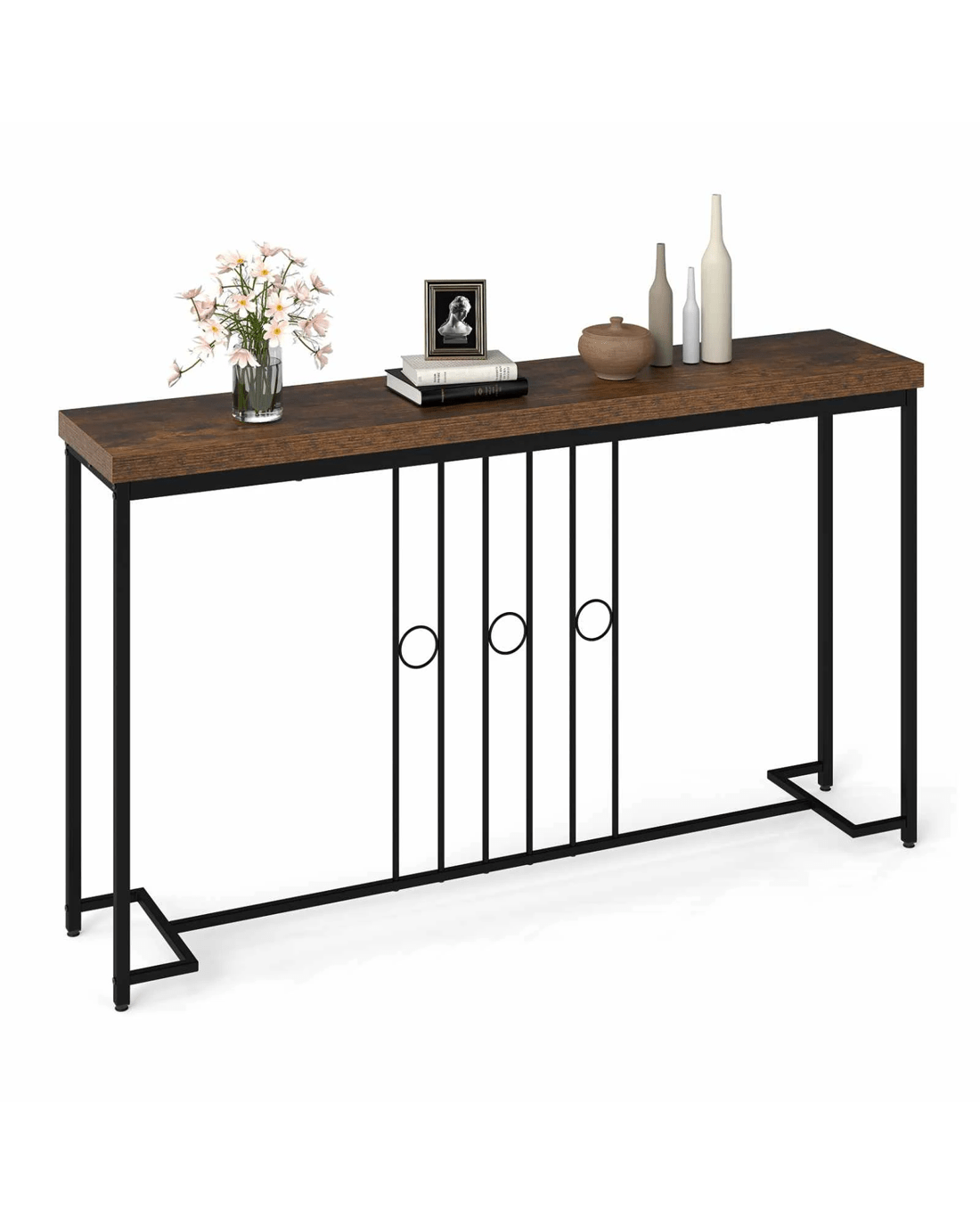 Built with high-quality metal and reinforced with a solid H-shaped base and crossbar, this console table supports up to 75kg with excellent stability ensured by adjustable foot pads and anti-toppling devices, even on uneven floors. Plus, this stylish industrial sofa table seamlessly combines a sleek metal frame with a rustic wooden tabletop measuring 140 x 30cm (L x W), offering ample space for decorations like plants, lamps and picture frames. Moreover, the minimalist yet elegant design makes it a versatile piece, perfect for enhancing entryways, living rooms, bedrooms or dining areas while serving as a reliable and eye-catching focal point.