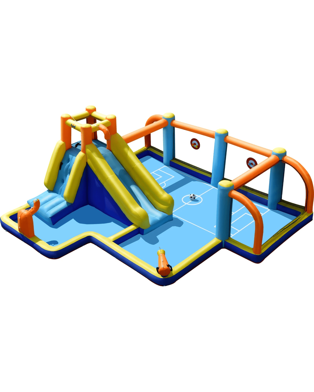 Depending on different needs, the water slide can be filled with water or not. So in cold winter, it can be used indoors for bouncy fun. Usually, in hot summer, the water slide is placed in the backyard in wet status. There is a splash pool, dual water cannon and long water slides for enjoyable coolness. As for the soccer zone, inflatable soccer and climbing wall, little ones who love sports will enjoy them very much. Besides, the whole water slide is made of 420D+840D oxford cloth for durability and protective mesh wall for security. Five little ones (3-12 years old) in total can play in it together. Each one's weight should lower than 30kg and the maximum load capacity for inflatable part is 150kg. Finally, in addition to a deflated water slide, you will also get a carry bag, 10 bouncer stakes, a hose assembly kit, an inflatable soccer, a pump for ball, 4 targeted balls and a repair kit. The blower is not offered and we recommend you to buy a 680W blower by yourself.