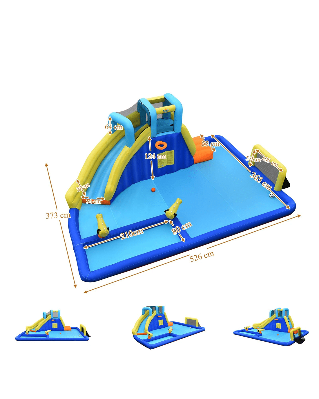 Have an exciting and cool summer with this water park! Designed with a waterproof feature and equipped with a water pipe, it will be perfect for summer party. 2 built-in water cannon add more fun for water battle, getting rid of the heat of summer. Besides water play, little ones can also enjoy sliding, climbing, and playing basketball & football. And thickened oxford material ensures high durability for a carefree playing environment.