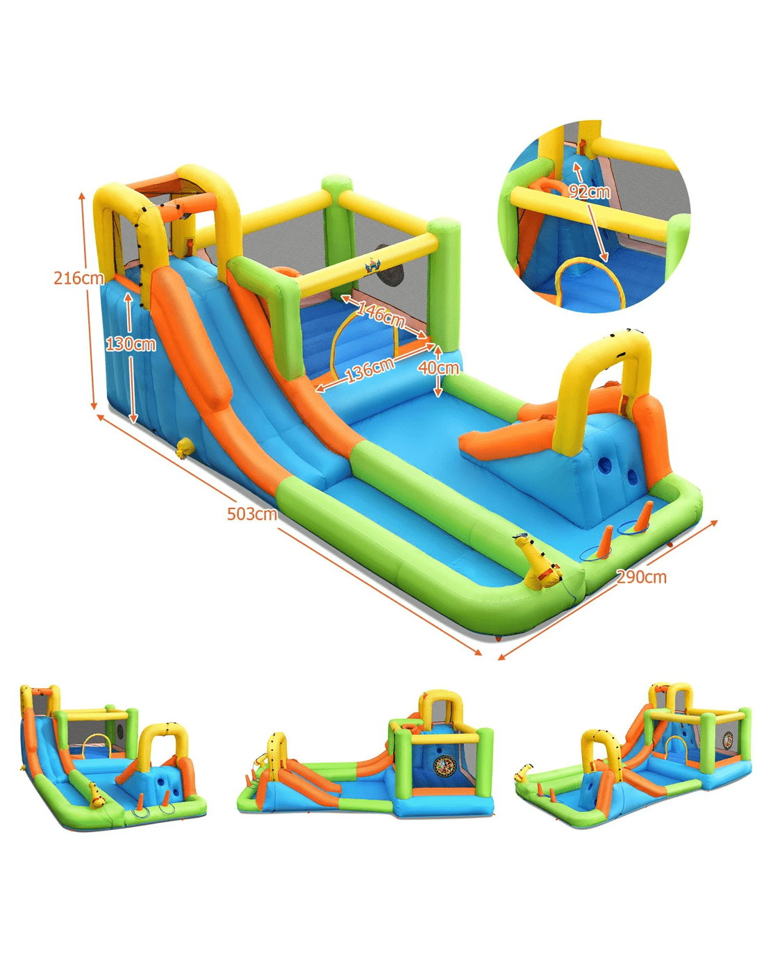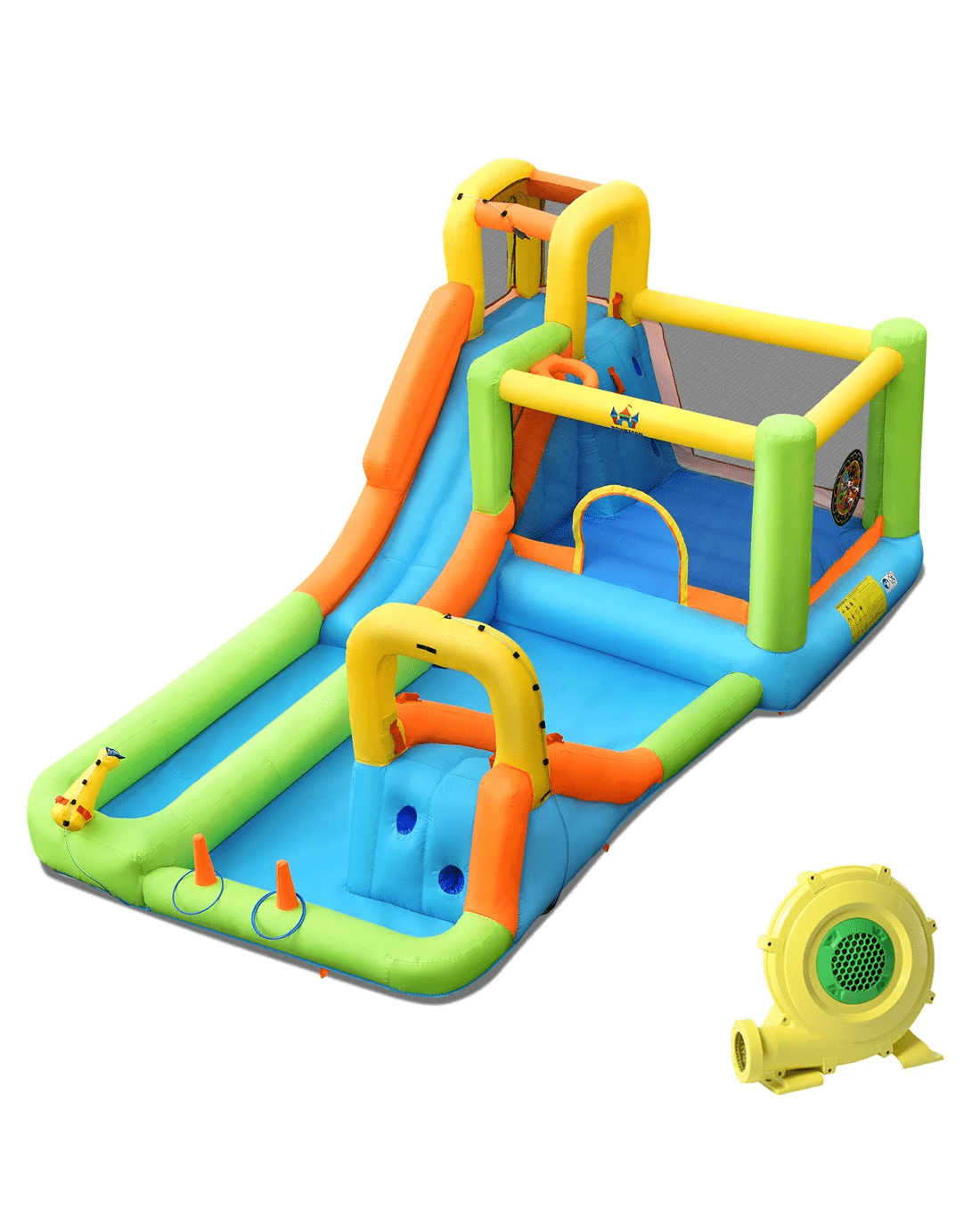 Our inflatable water bounce house with bright colors and funny games will be the talk of all the little ones! The design of this bouncy castle features the most attractive games for little ones, such as: a bounce area, a basketball hoop, a water cannon, and two slides, all of which allow little ones to build friendship with friends. 3 plastic rings, 3 target balls and inflatable basketball will bring more enjoyment to your lovely little ones. Made of 420D and 800D Oxford cloth, this inflatable water slide is puncture-resistant and lasting-long. The mesh netting wall combines the advantages of maximum ventilation and reliable protection to provide a comfortable and safe entertainment environment. It is worth mentioning that the unique outlet tube is designed to help the basketball deflate within a few minutes. The portable carrying bag allows you to quickly store all accessories to prevent loss.
