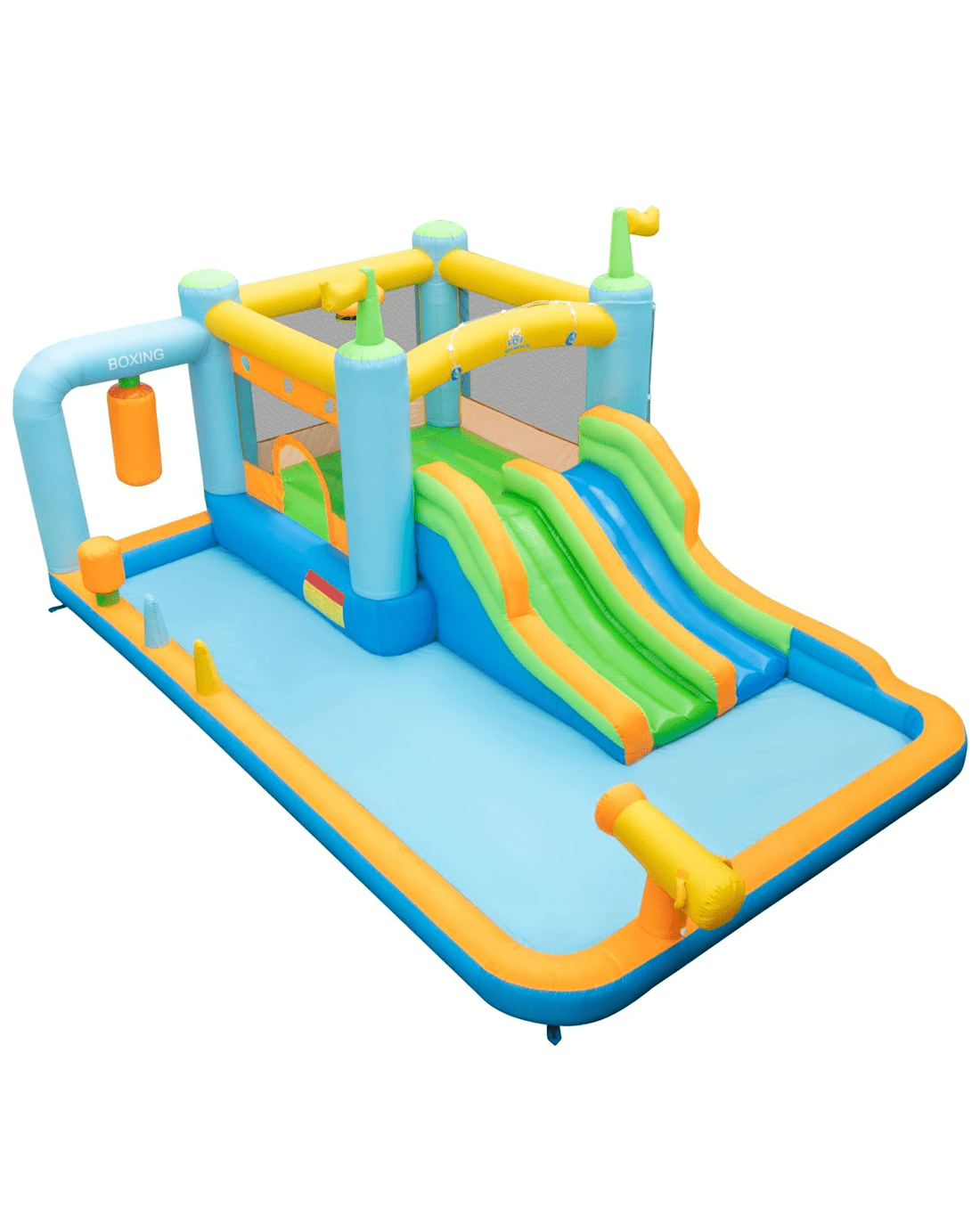 The little ones water park is fitted with double seamless stitches & made of 420D PVC-coated oxford cloth with high strength & better durability, while it features elastic mesh walls to protect from falling. Besides, it contains a bouncing mat where little ones can enjoy jumping & have fun with the basketball rim. Plus, dual slides are designed with 35 cm elevated handrails to allow exciting sliding & higher security. In the large splash pool, little ones can start an interesting water fight, using the water cannon. With blowup boxing sandbag, the bounce house becomes an inflatable boxing world. More, it comes with a full accessory kit, ground stakes, a repair kit, a carry bag & the recommended power is 680-750W. Just unfold & flatten the bounce house, wait for 2 minutes for easy & quick inflation, then fix with included ground stakes. It will be a perfect gift for little ones who love jumping & boxing.