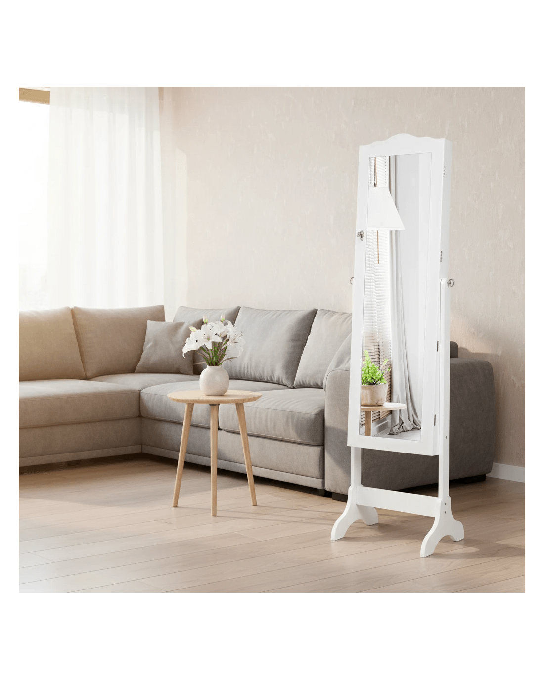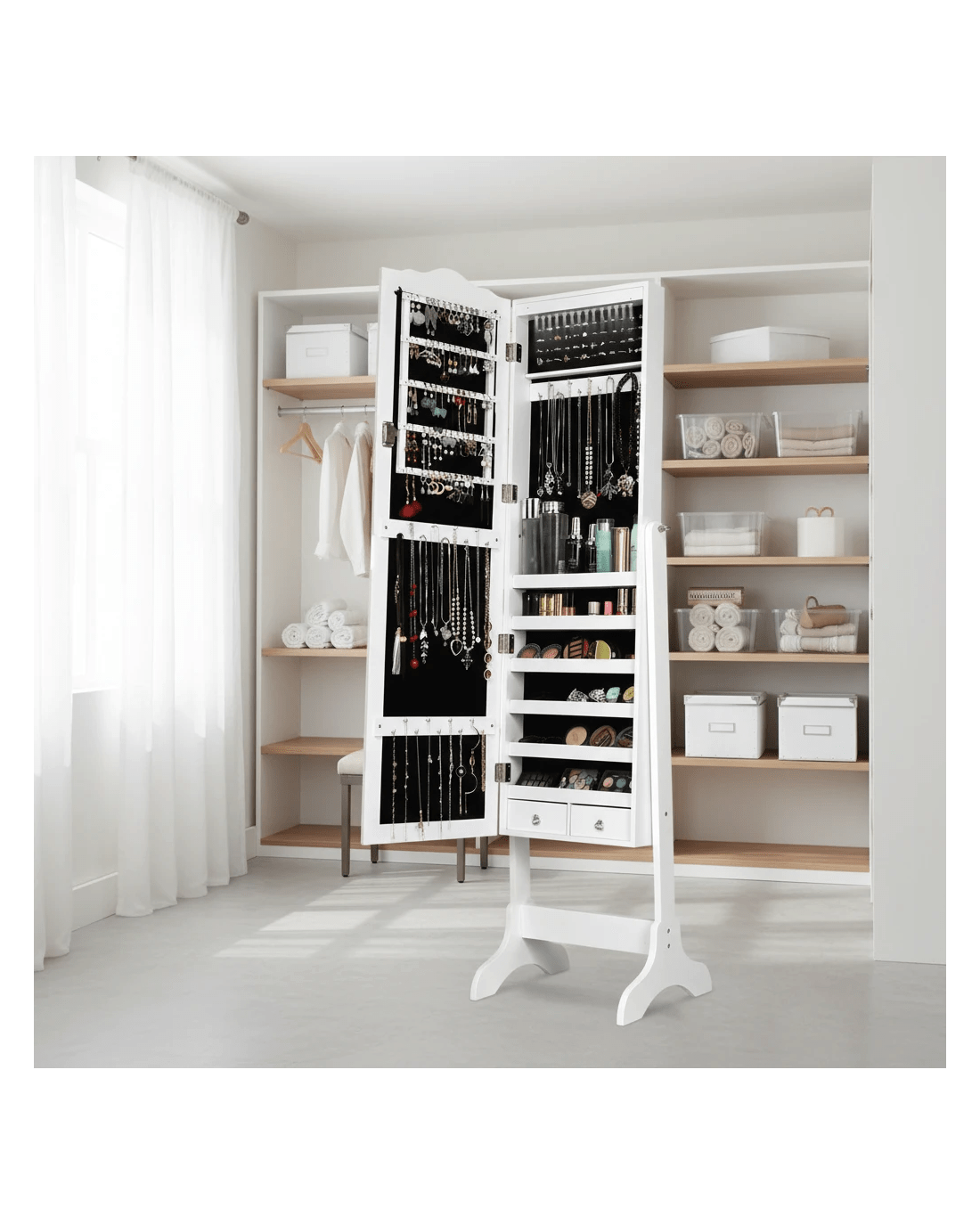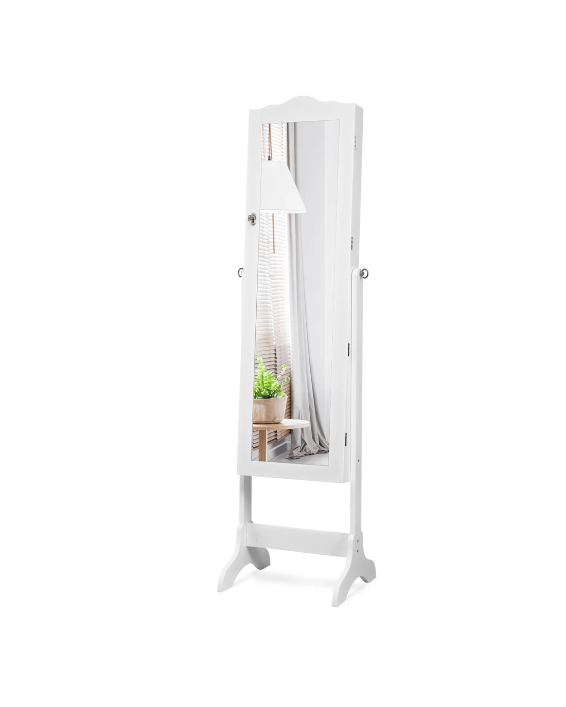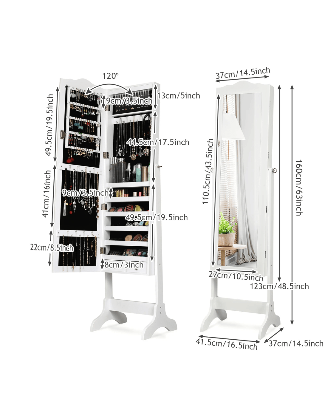 This is our brand new jewelry cabinet with full size mirror and 14 LED lights, which is an attractive art work for your room. Full size mirror is convenient for trying your jewelry and clothes on, lights add luxury to your cabinet. It is specially designed for your valuables help your jewelry in an organized manner and prevents them from getting tangled. Lockable design ensures the security of your jewelry. Features four angle tilting positions so that you can choose your favorite angle according to you needs.