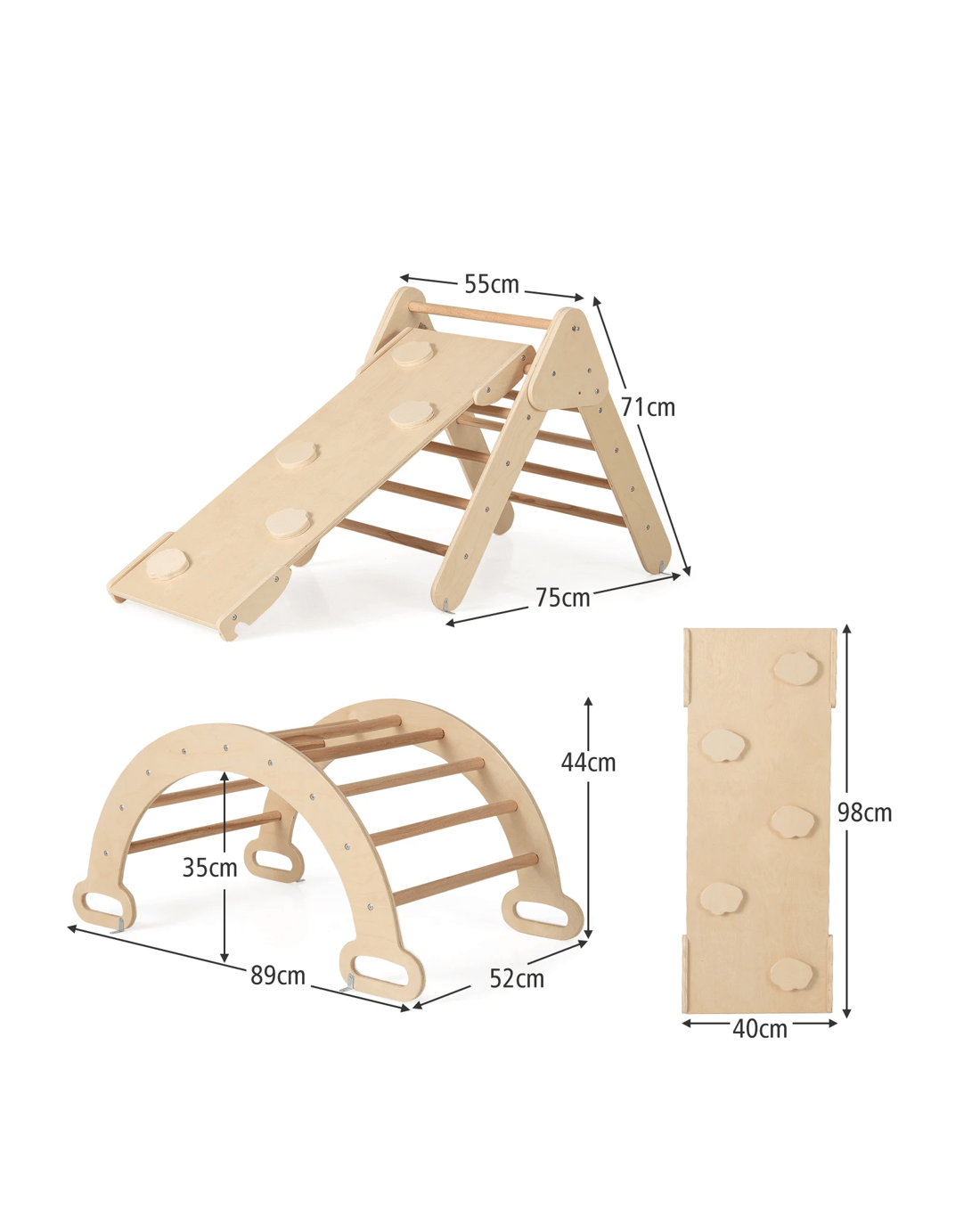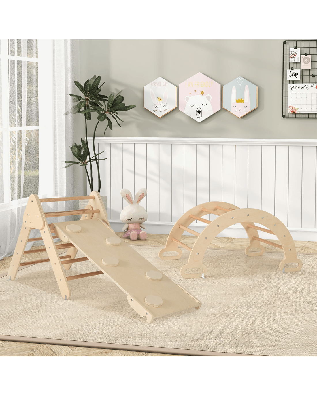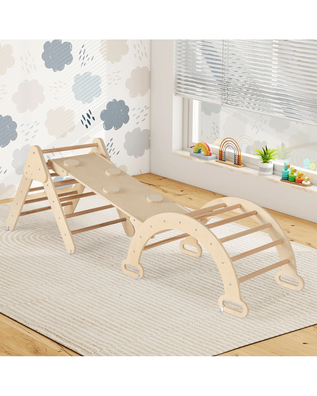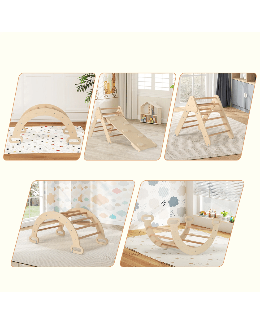 Perfect Early-Education Gift for Your Lovely little ones! Our 7-in-1 triangular set includes a climber, an arch, and a ramp, which can be combined in different ways, adding more fun for playing. Especially, the climbing arch can also be used as a rocker for resting, and the ramp with a double-sized design can be used for climbing and sliding, meeting different needs. More than that, the climbing toys are crafted with selected beech wood, which is carefully polished and safely painted, ensuring great security. Thanks to the funny little one climbing toys, little ones can improve balance, develop gross motor skills, promote hand-eye coordination, and inspire imagination, creating a funny activity center for your little ones!