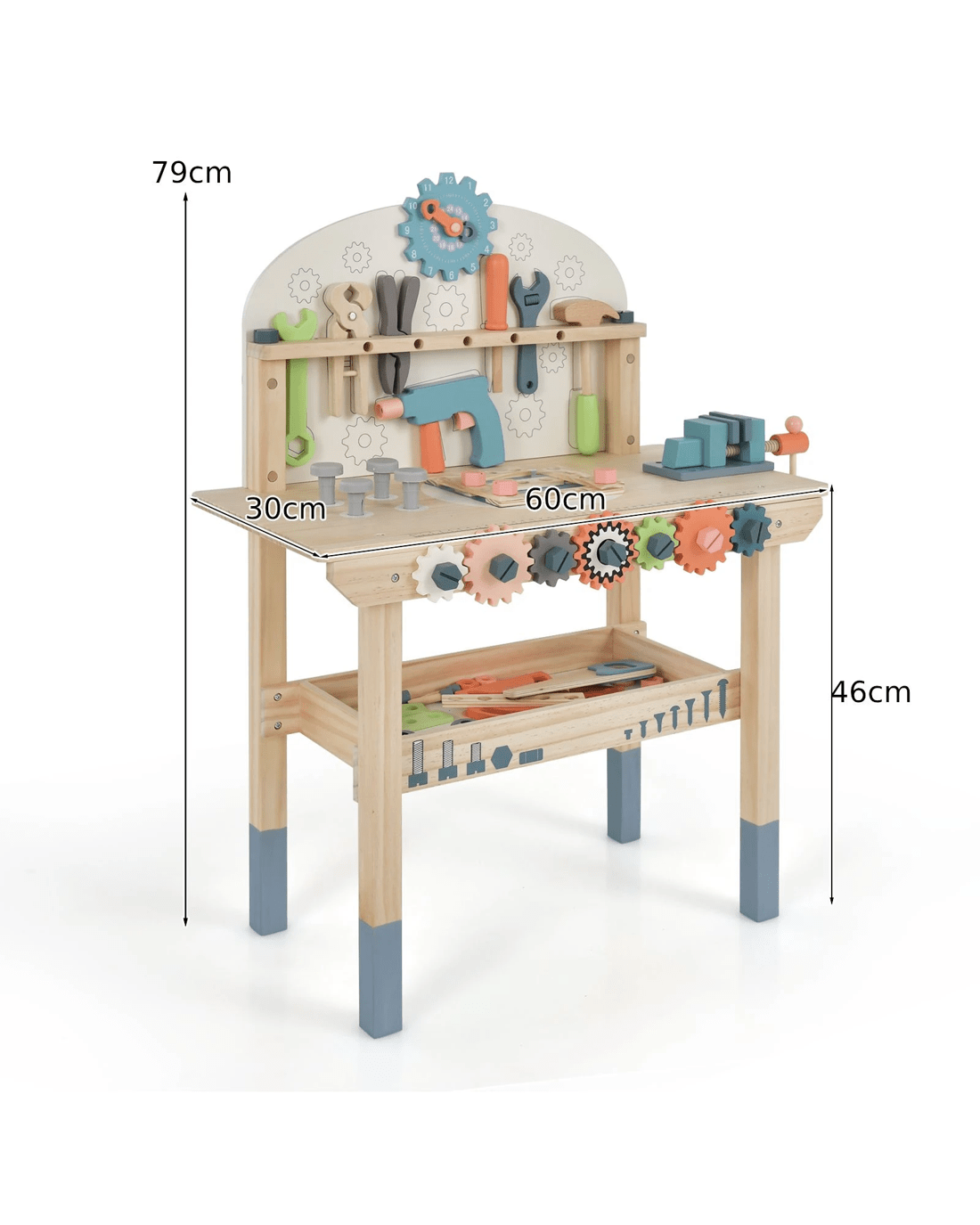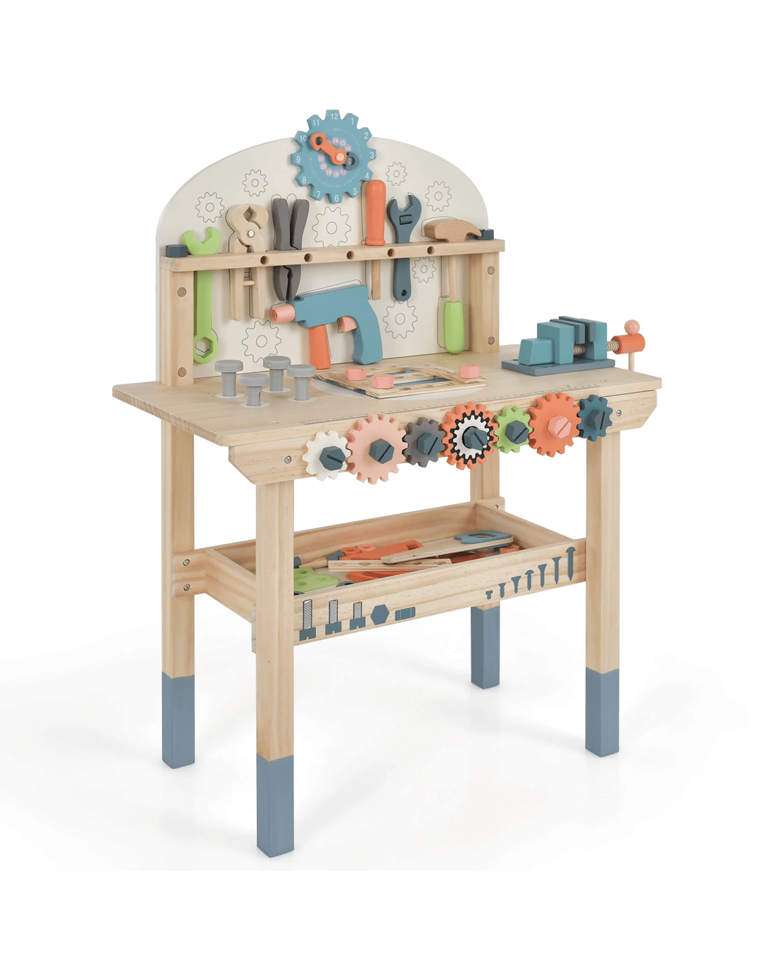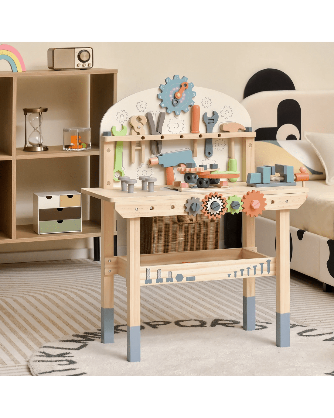 Fun wooden tool workbench toy to build with accessories and little one-sized tools
