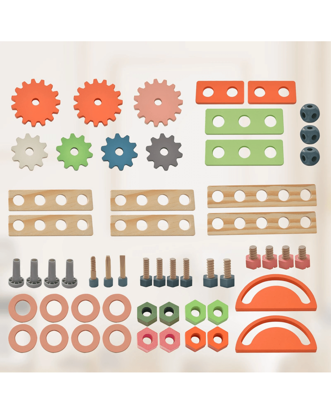 1 saw, 1 hammer, 1 screwdriver, 1 L-shaped ruler, 1 workbench vise, 1 connecting device and 1wrench offer little ones real experience