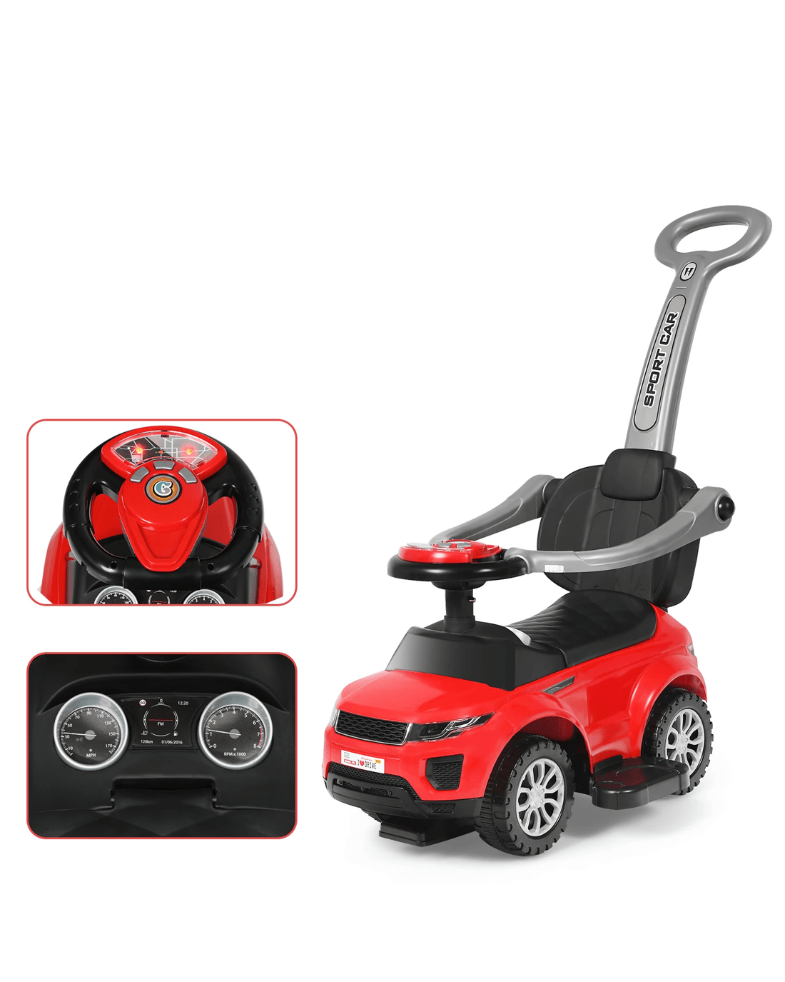 This car toy combines the functions of stroller, walking car and ride-on car for easy pushing, pulling and sliding. Your little angel can slide the car by himself/ herself, or you can control the car with a removable handle rod. Wear-resistant wheels, security guardrails and anti-fall board are protective enough to enhance little ones' security during riding. If little ones want to carry some small toys, snacks or other items, the hidden storage room under the seat will satisfy their requirements perfectly. Ergonomic seat, built-in music, horn sound and steering wheel will give them wonderful and exciting driving experience. It is an ideal present for your little one aged 12-36 months old.