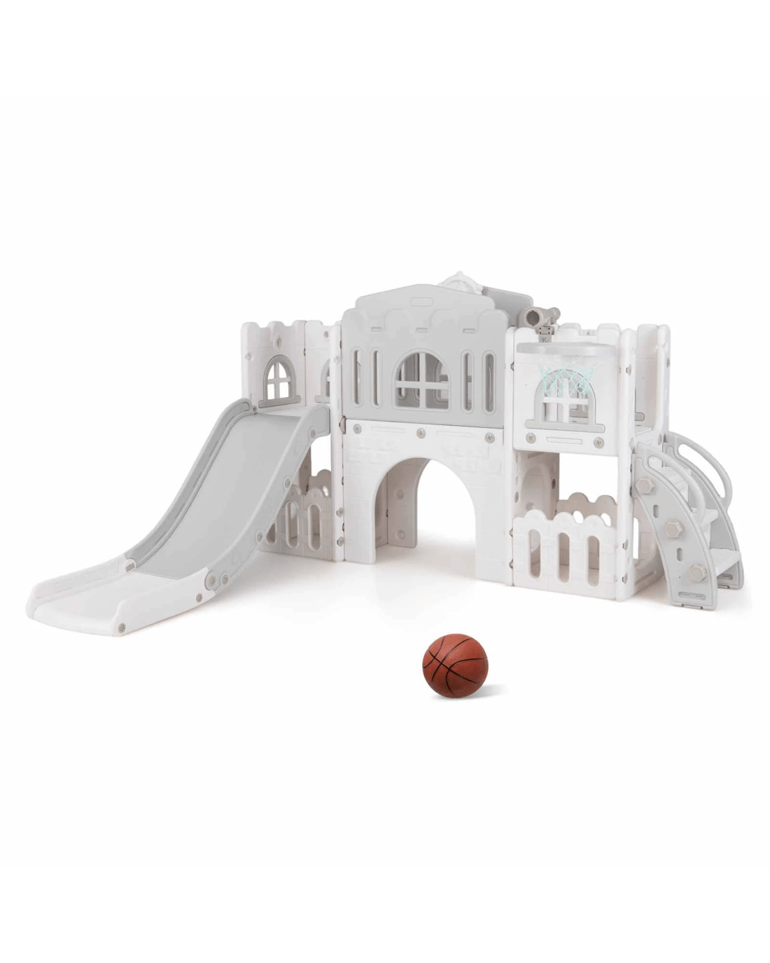 Includes telescope, climber, slide, tunnel, basketball hoop, hiding spot, steering wheel and storage