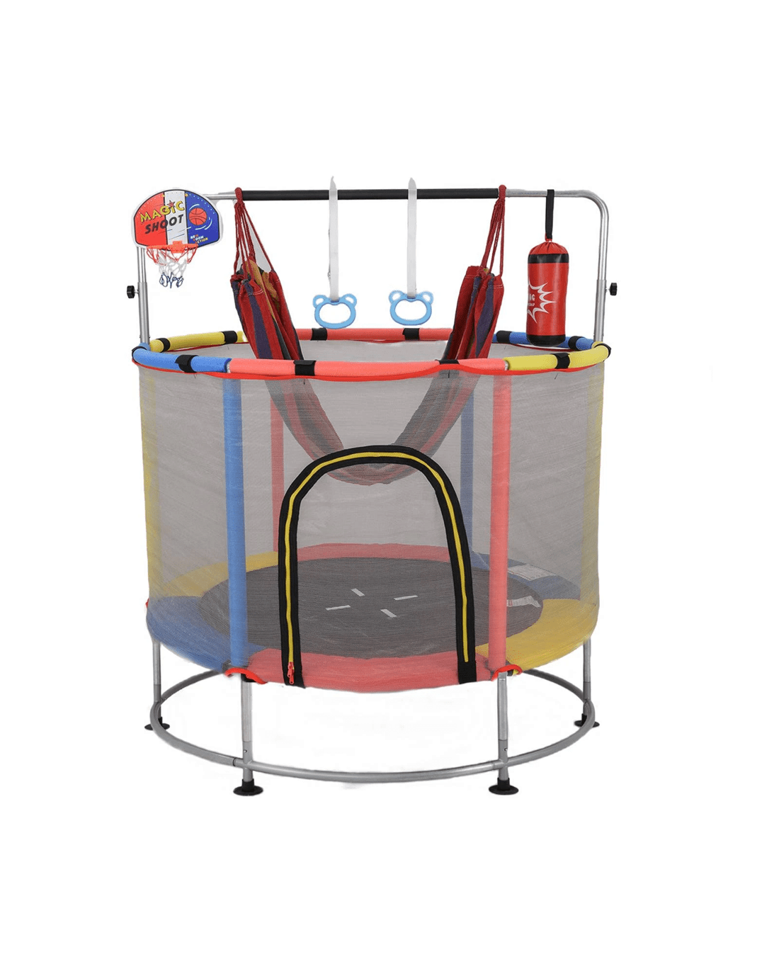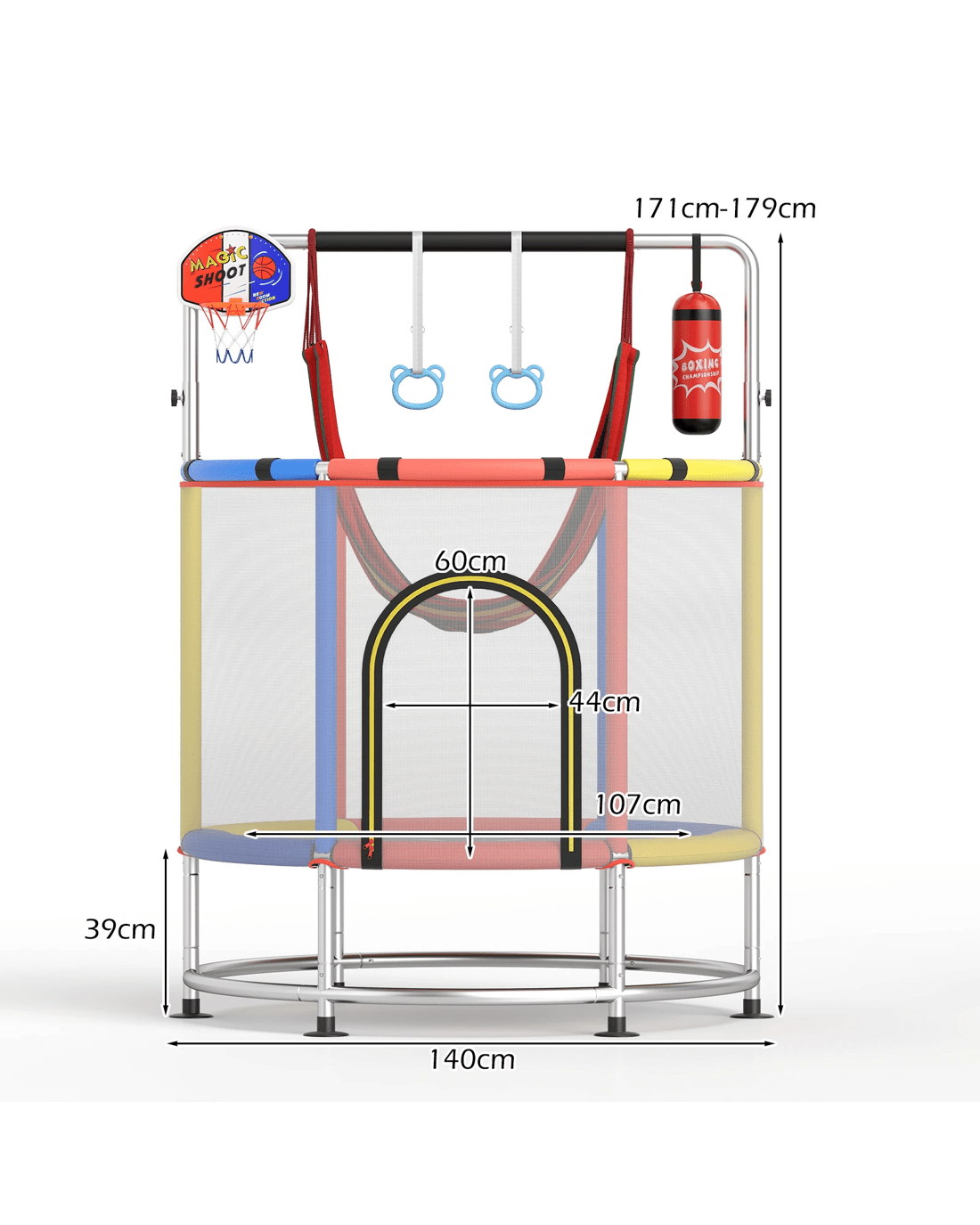 More than just jumping, your family can also practice boxing moves, swing like monkeys, or shoot hoops like basketball stars! The no-gap mat and 360° net protect little adventurers, while the robust springs and galvanized metal frame ensure years of energetic fun. The waterproof, wear-resistant surface stands up to daily use, and non-slip feet keep it steady without tipping over. With its snap-fit assembly, it will be ready to channel all that wonderful energy in no time!