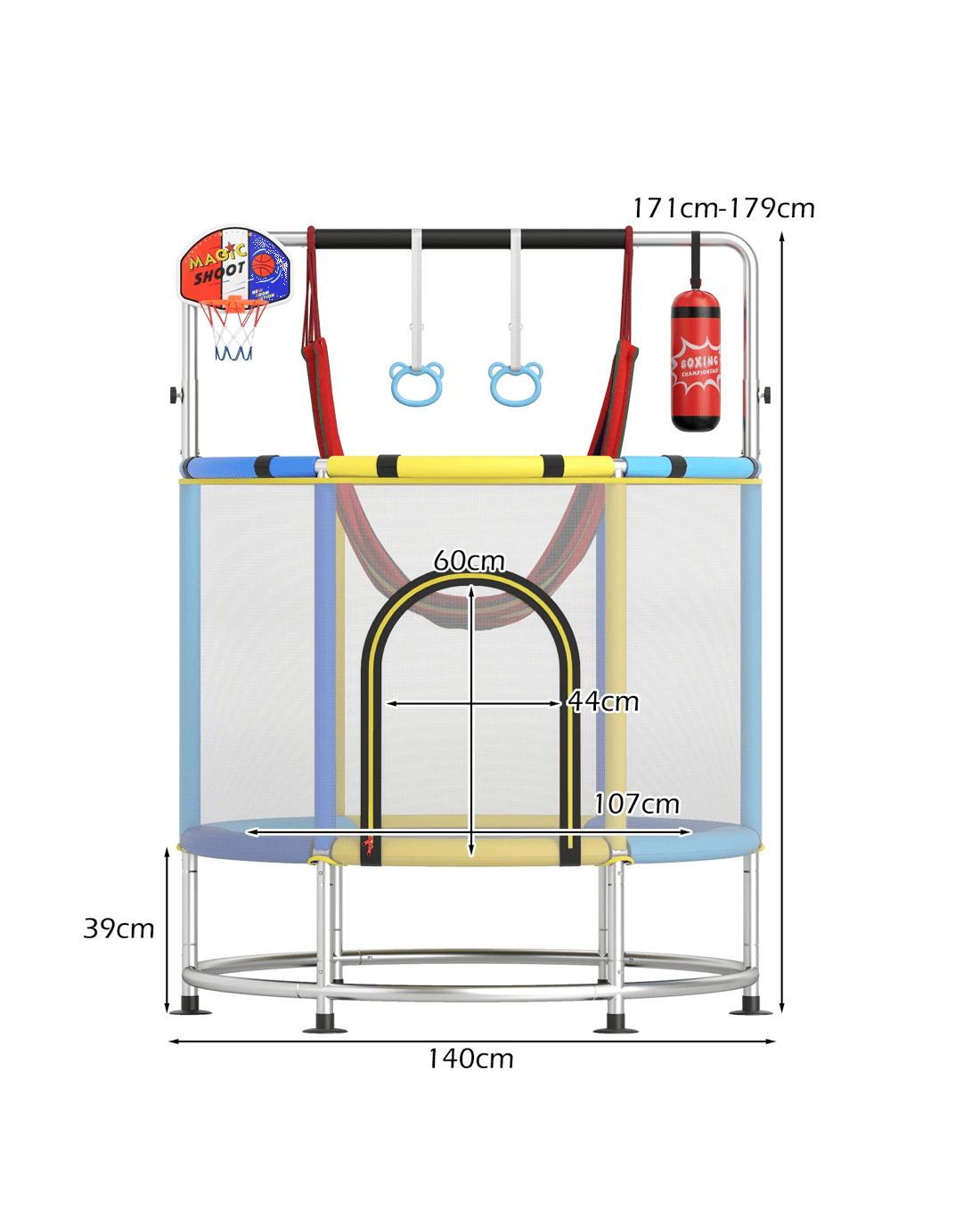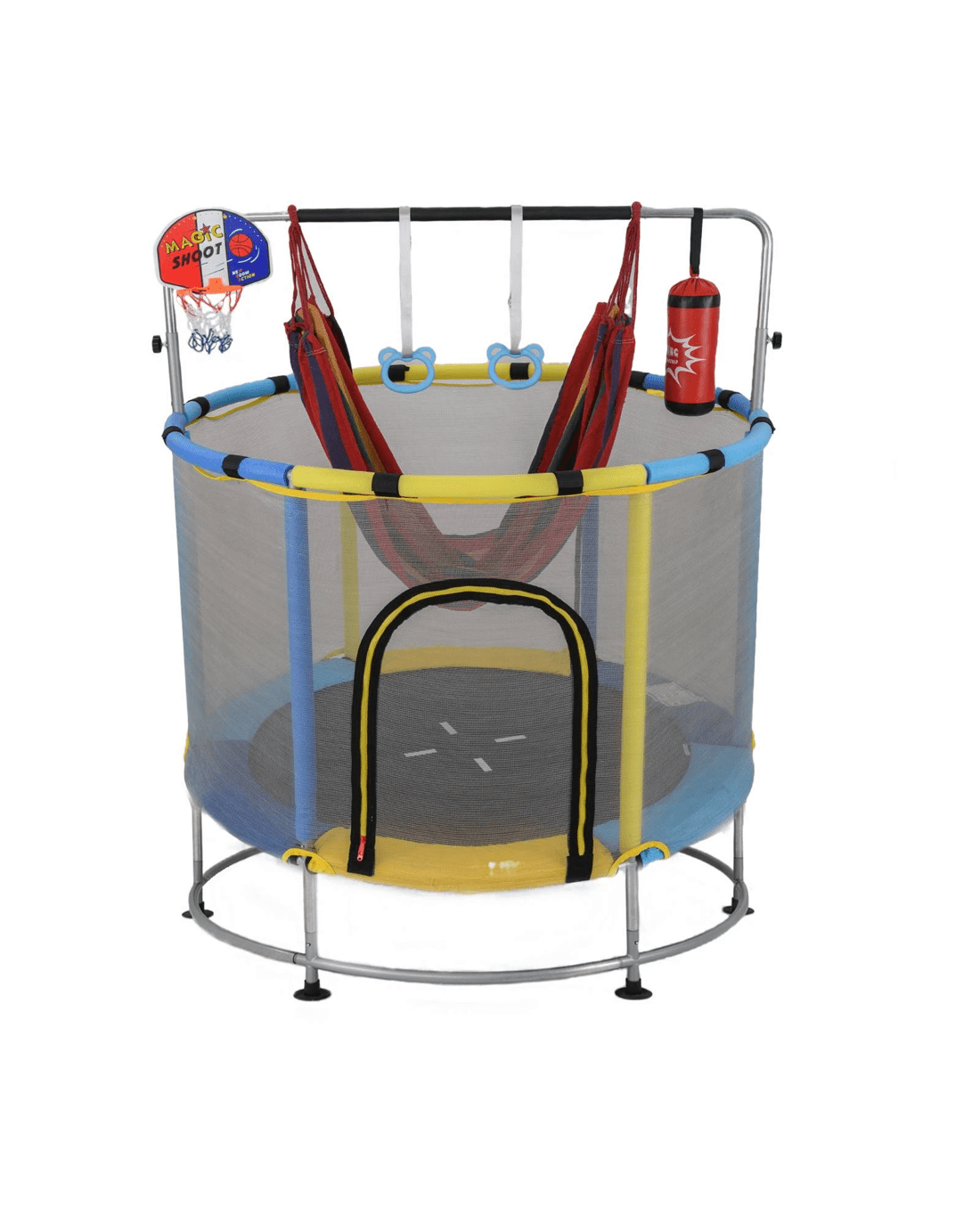 More than just jumping, your family can also practice boxing moves, swing like monkeys, or shoot hoops like basketball stars! The no-gap mat and 360° net protect little adventurers, while the robust springs and galvanized metal frame ensure years of energetic fun. The waterproof, wear-resistant surface stands up to daily use, and non-slip feet keep it steady without tipping over. With its snap-fit assembly, it will be ready to channel all that wonderful energy in no time!