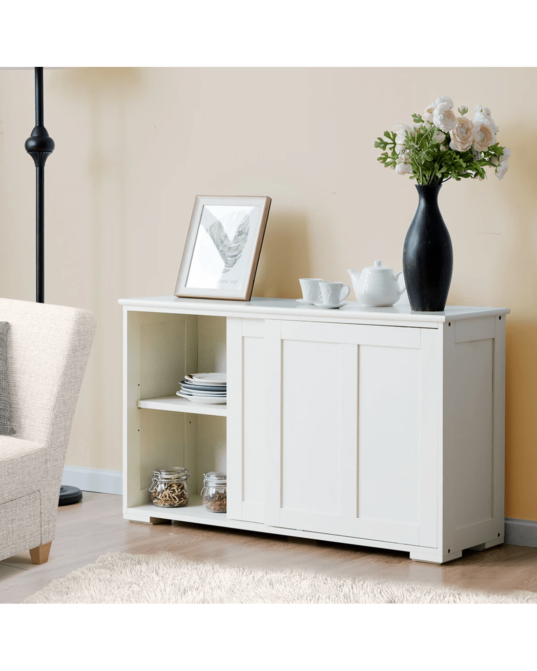 Made of thicken material, the cabinet has excellent sturdiness and great load bearing up to 60kg. Four firm bottom legs that help the cabinet maintain stability. Ample storage space definitely satisfies your most daily needs. Inside the cabinet, there are two large compartments and a removable shelf. You can place common condiments on the wide tabletop. Due to its modern and simple design, it can be used as kitchen buffets, sideboards, TV Cabinet and more.