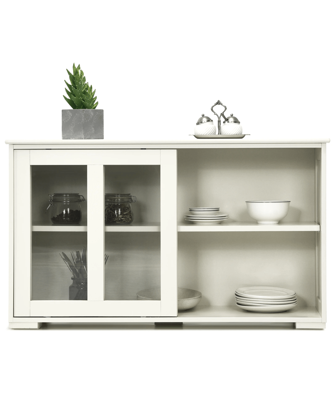 The storage cabinet is made of high quality MDF board and coated with paint, which is durable and firm for last long time use. The height adjustable inside shelf allows you to customize storage space according to your needs with great convenience. The stackable sideboard buffet is designed with 2 practical sliding doors, which could not only help to protect the stuffs from outside dust, but also is convenient for easy taking and putting things. In addition, with a stylish appearance, the storage sideboard can add unique charm to your living room, bedroom, kitchen and various places. With a sleek surface, it can be cleaned by a damp cloth effortlessly. With spacious tabletop and large storage compartments, an organized and neat home can be easily come true. If you are looking for a sideboard cabinet, don't hesitate to buy it!
