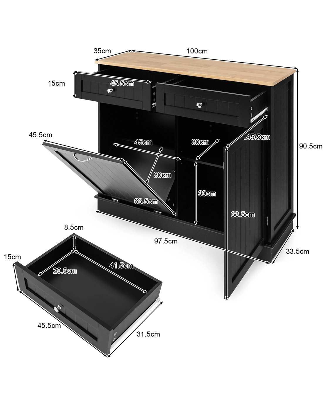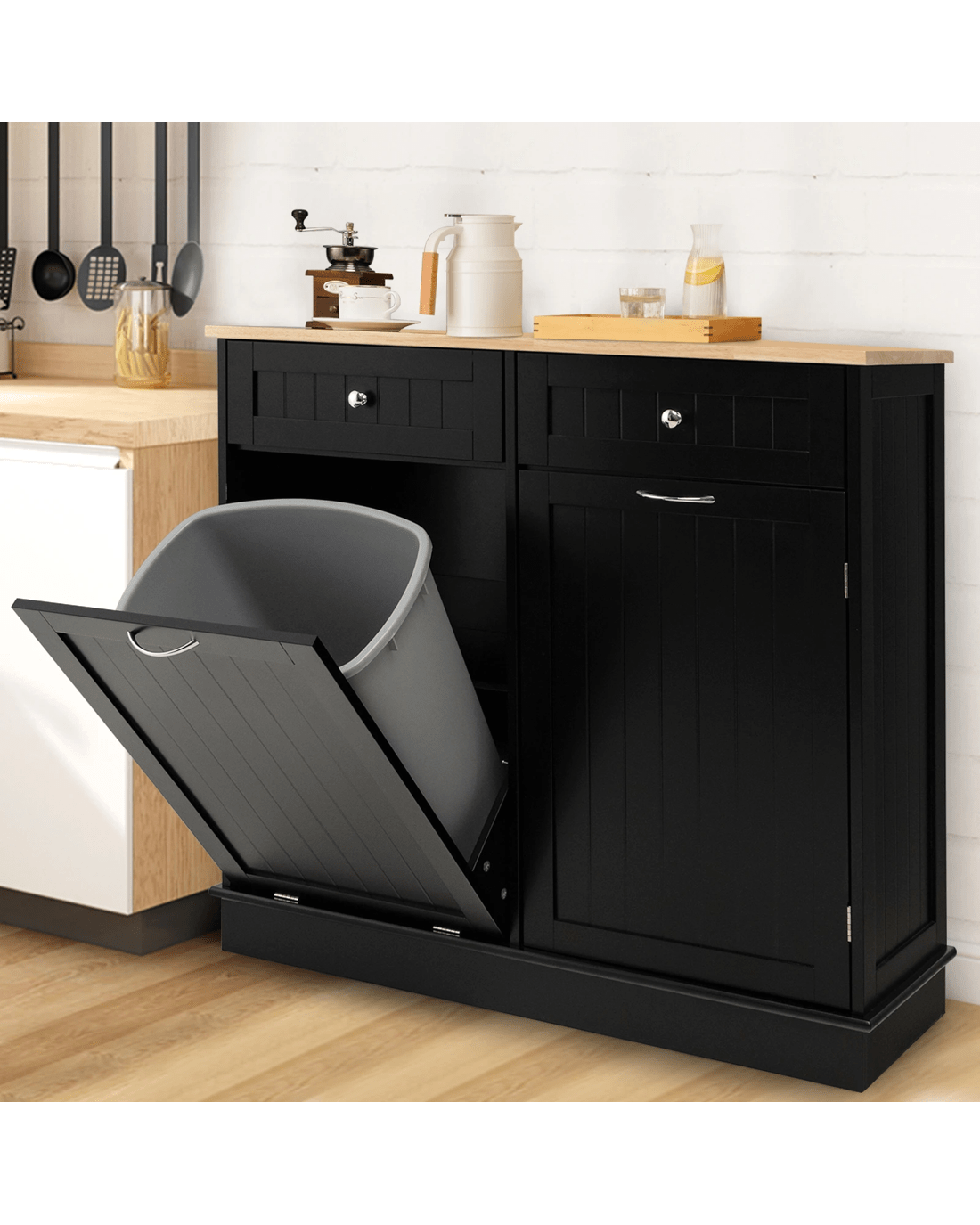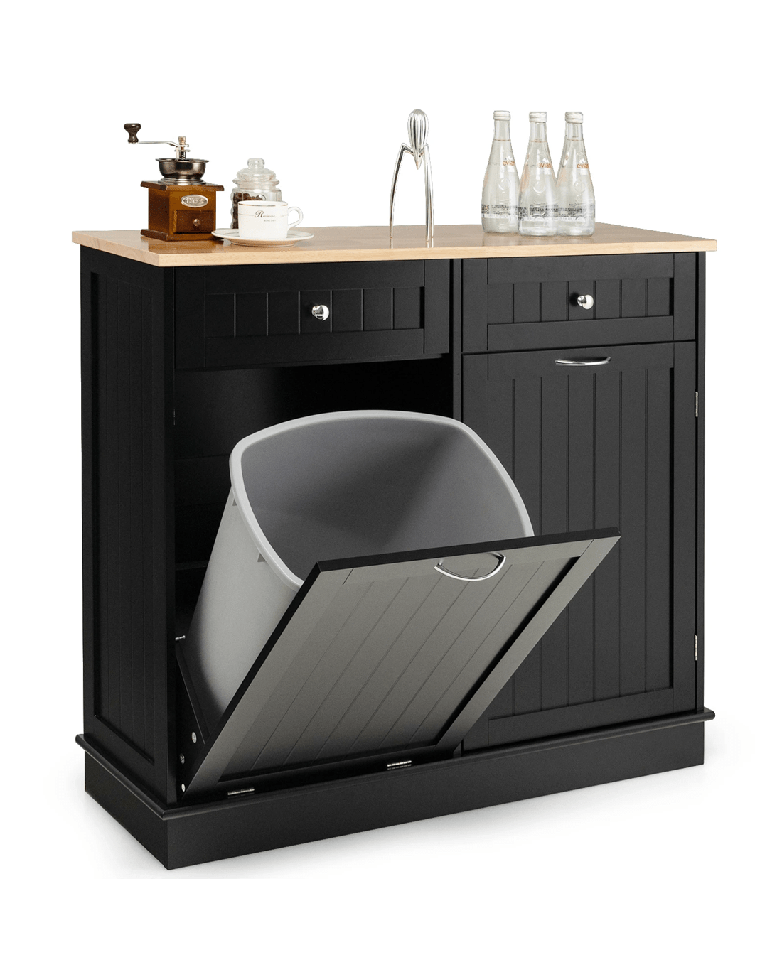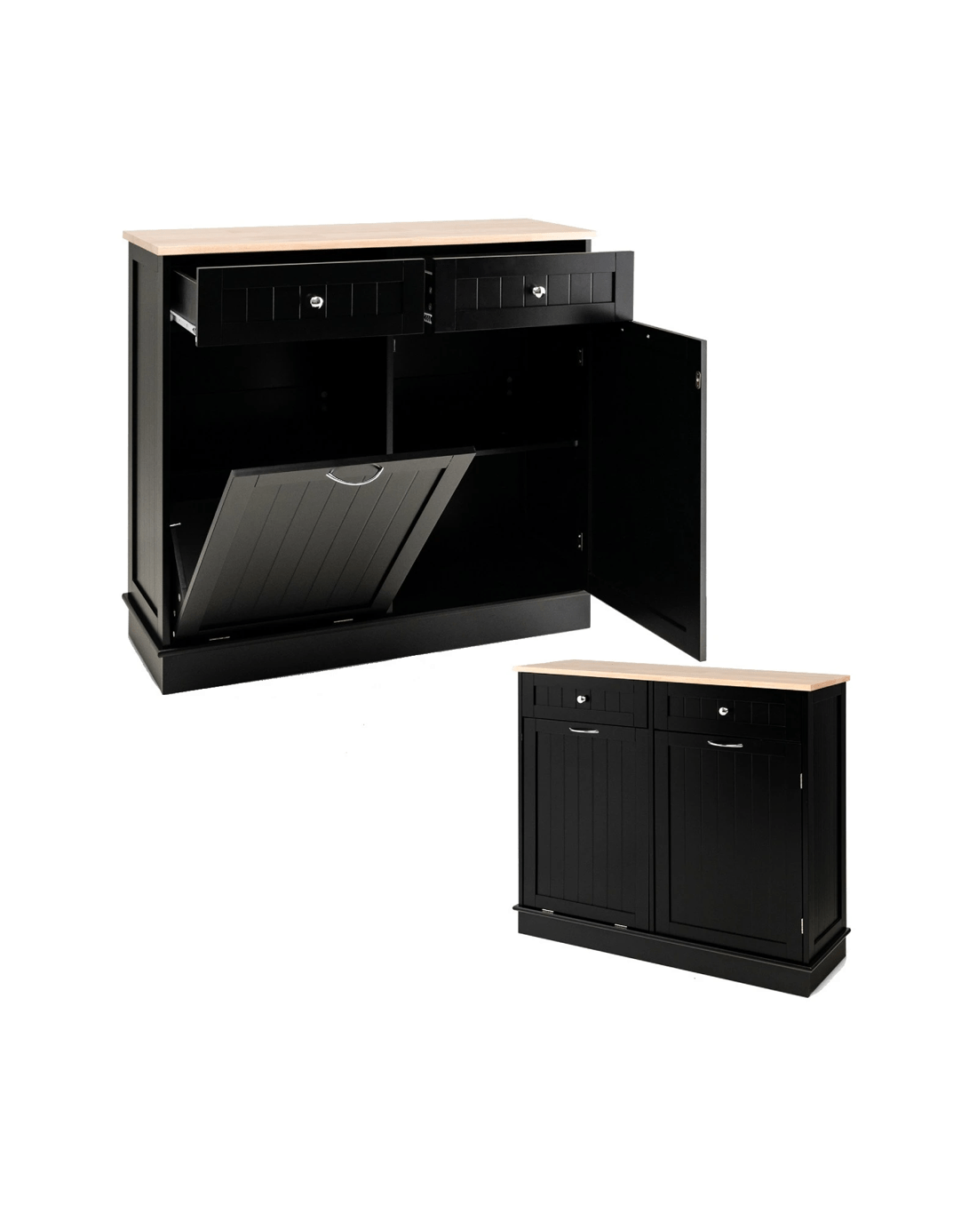 This trash cabinet has a solid rubber wood tabletop with ample room to display kitchen appliances and prep your food. It features a tilt-out door that elegantly accommodates waste bins of 40L. This single trash can cabinet is also designed to store your dirty clothes and organize your pet supplies. The enclosed cabinet has a 3-position adjustable shelf with capacious storage to hide your clutter. The 2 drawers also provide organizing spots for silverware and utensils. This kitchen island with trash can holder has a strong MDF structure that lasts for quite a long time to provide you with great service.