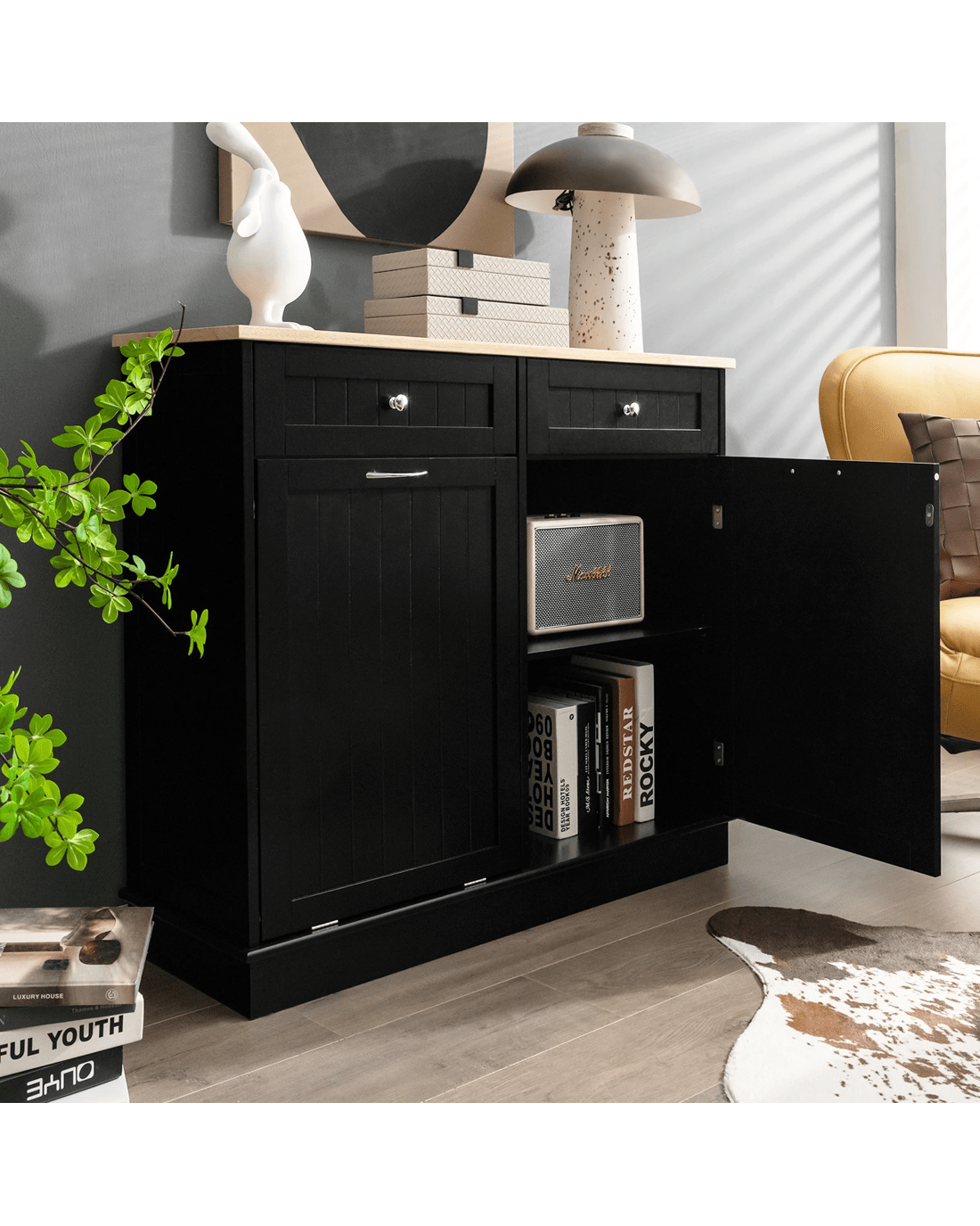 2-layer storage cabinet and 2-tier open compartment for more storage space