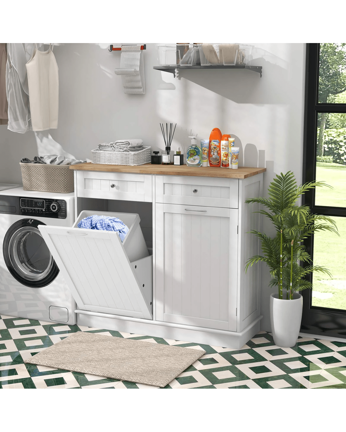 Used as a trash can cabinet, laundry sorter or recycle bin