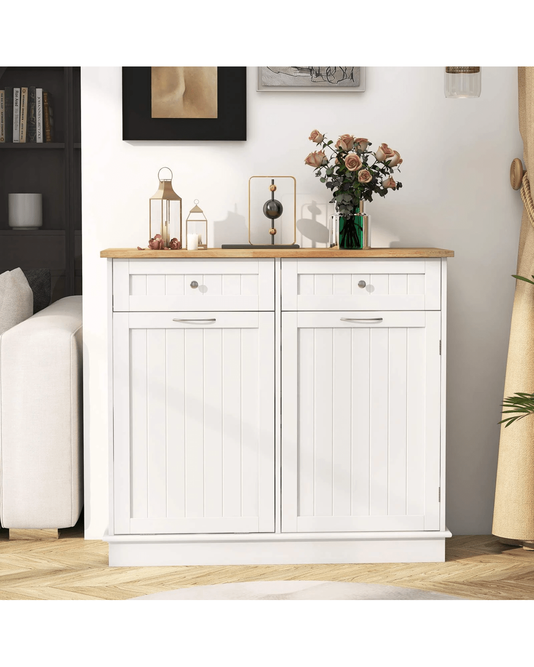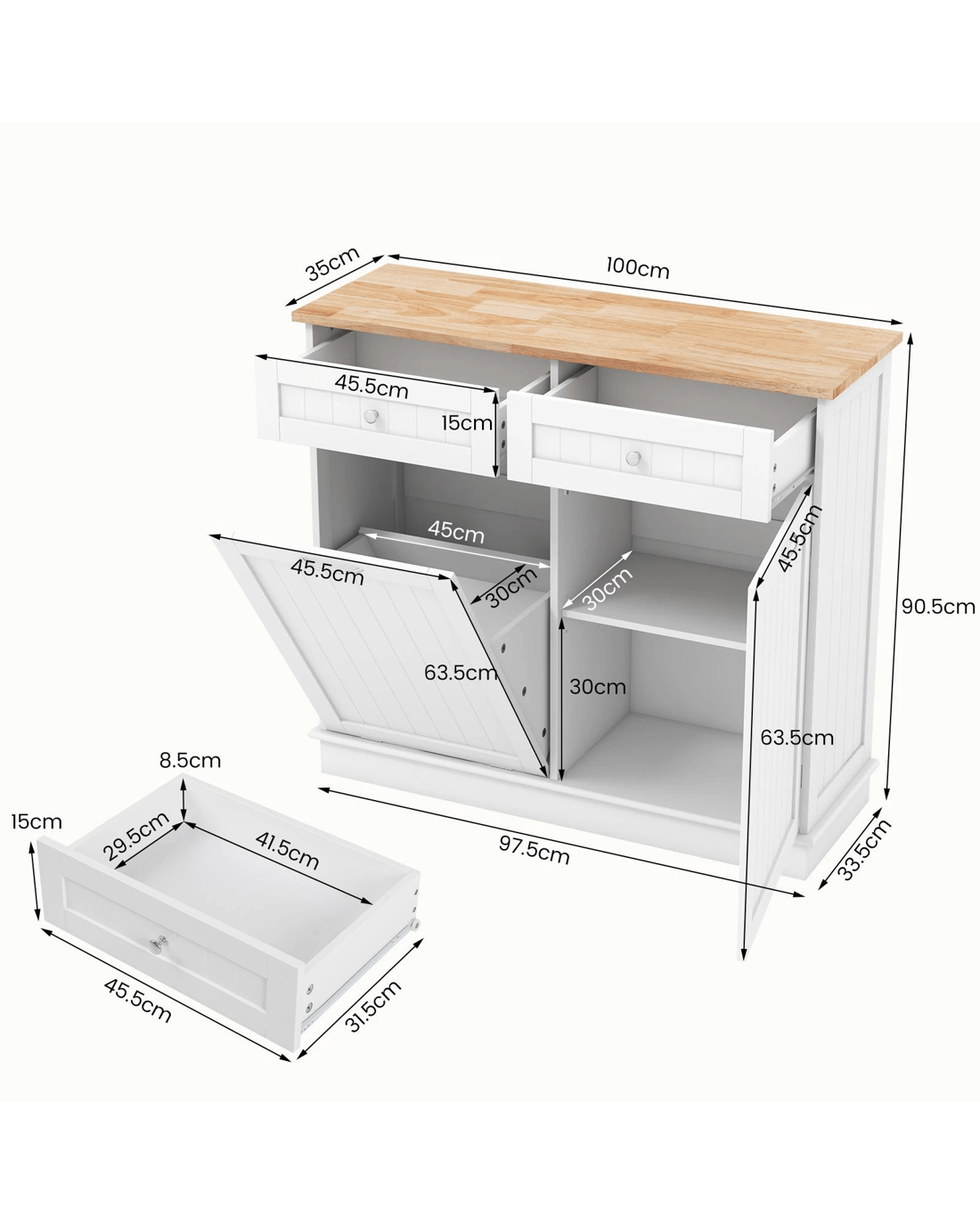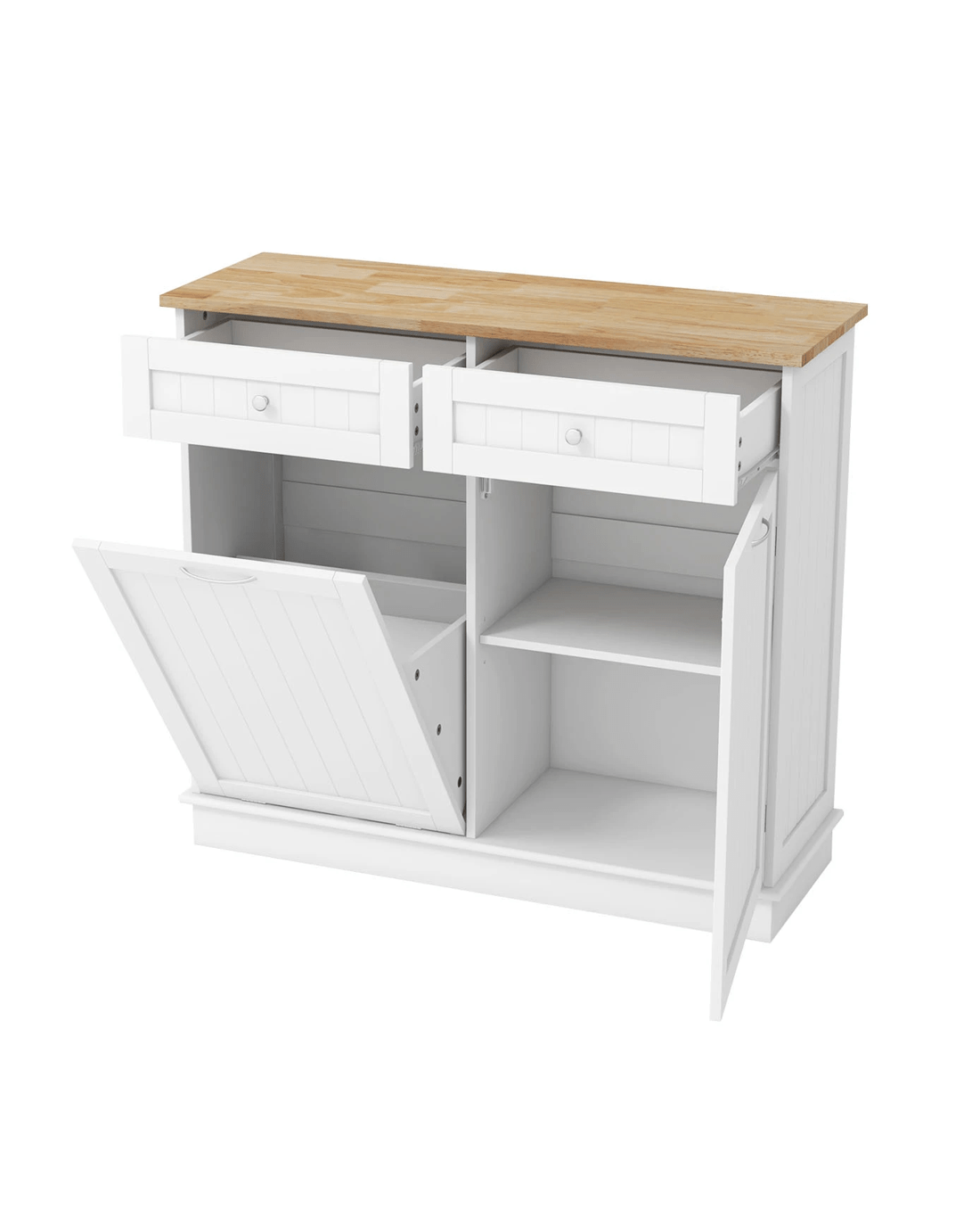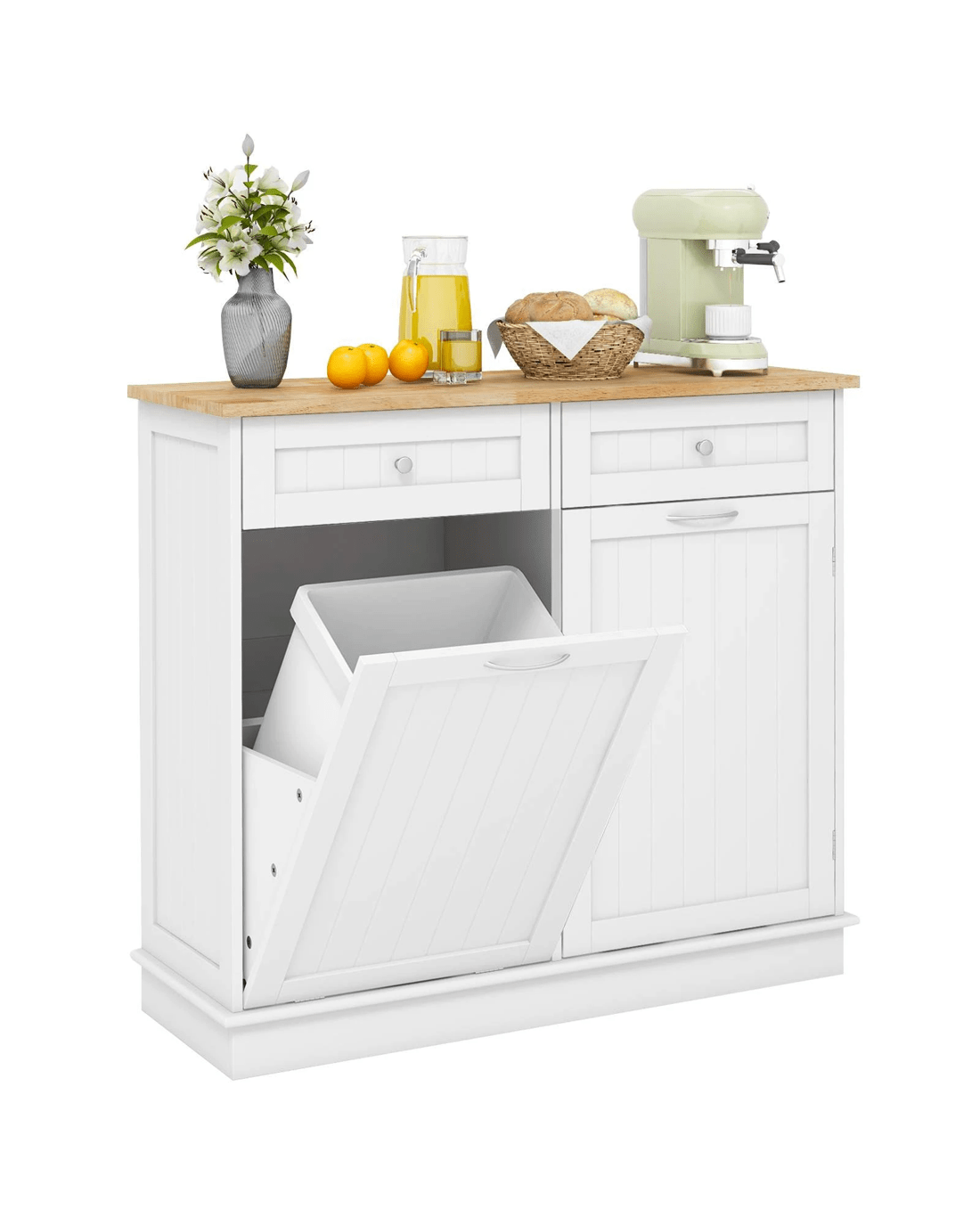 Say goodbye to unsightly trash cans!The hidden 11-gallon garbage holder is designed to keep pets away from waste and conceal unpleasant smells. For storage convenience, the rubber wood countertop offers additional workspace in your kitchen. Equipped with 2 drawers and 3-position adjustable shelf, this trash bin cabinet enlarges ample storage space for kitchen essentials. For reliable structure, the anti-toppling kits enhance stability and provide peace of mind, especially in homes with pets orlittle ones. Not just for the kitchen, this recycling cabinet can be used in the laundry room, living room, or dining room.