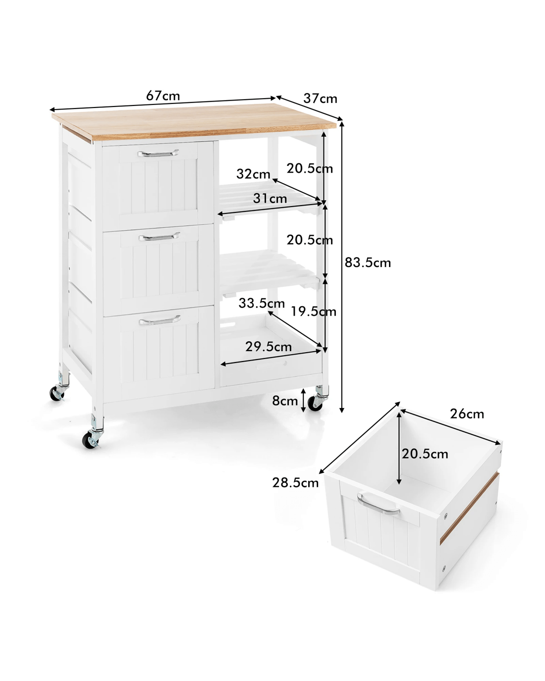 It has 1 wide countertop, 1 tray, 2 shelves and 3 drawers to store a variety of sundries. You can place or display your wines, glasses, tableware or ornaments. And you can also rearrange the serving tray, 2 open shelves and 3 deep drawers to meet different storage needs. Besides, you are allowed to lock or unlock the casters to stop or move the cart according to your different needs. As for its durability, we design it with rubber wood countertop and solid wood frame to keep it durable and stable.
