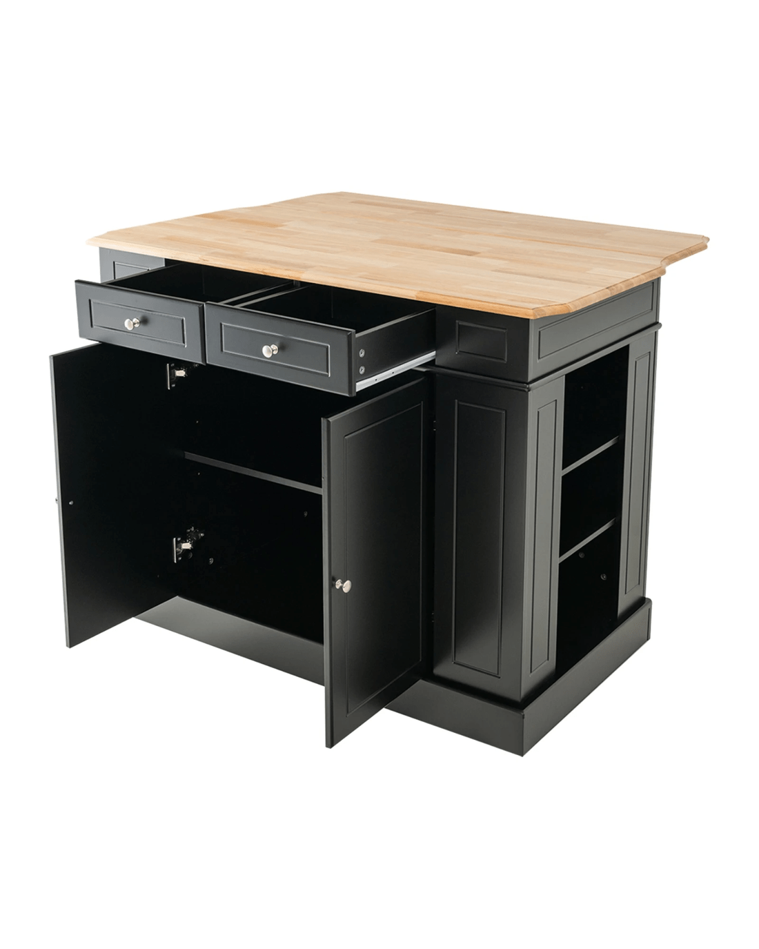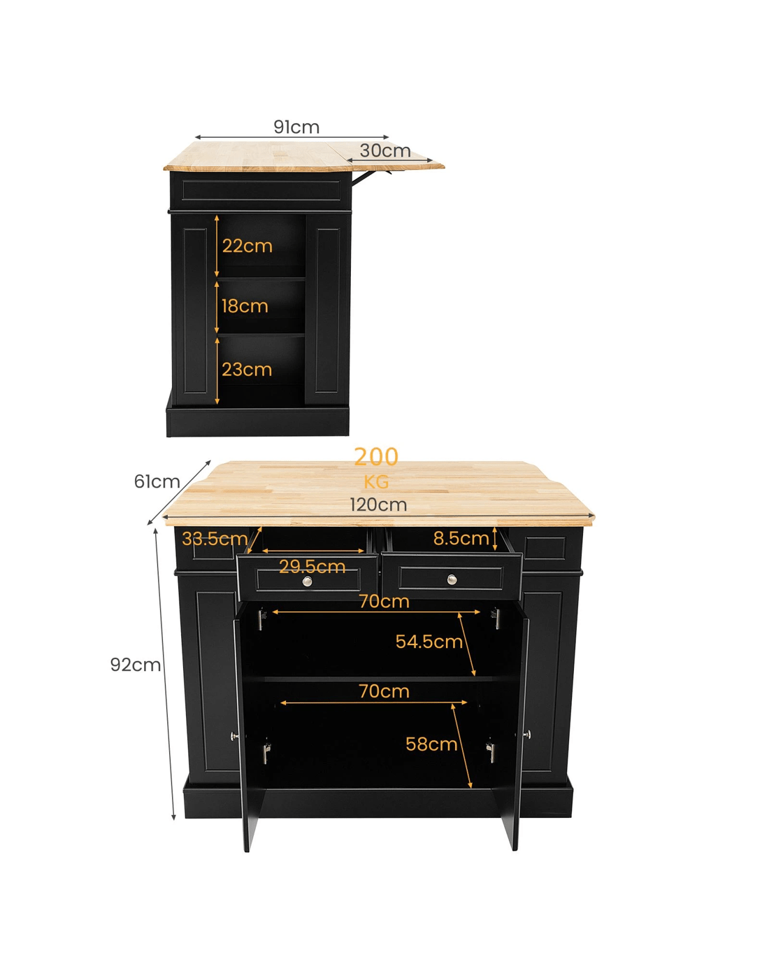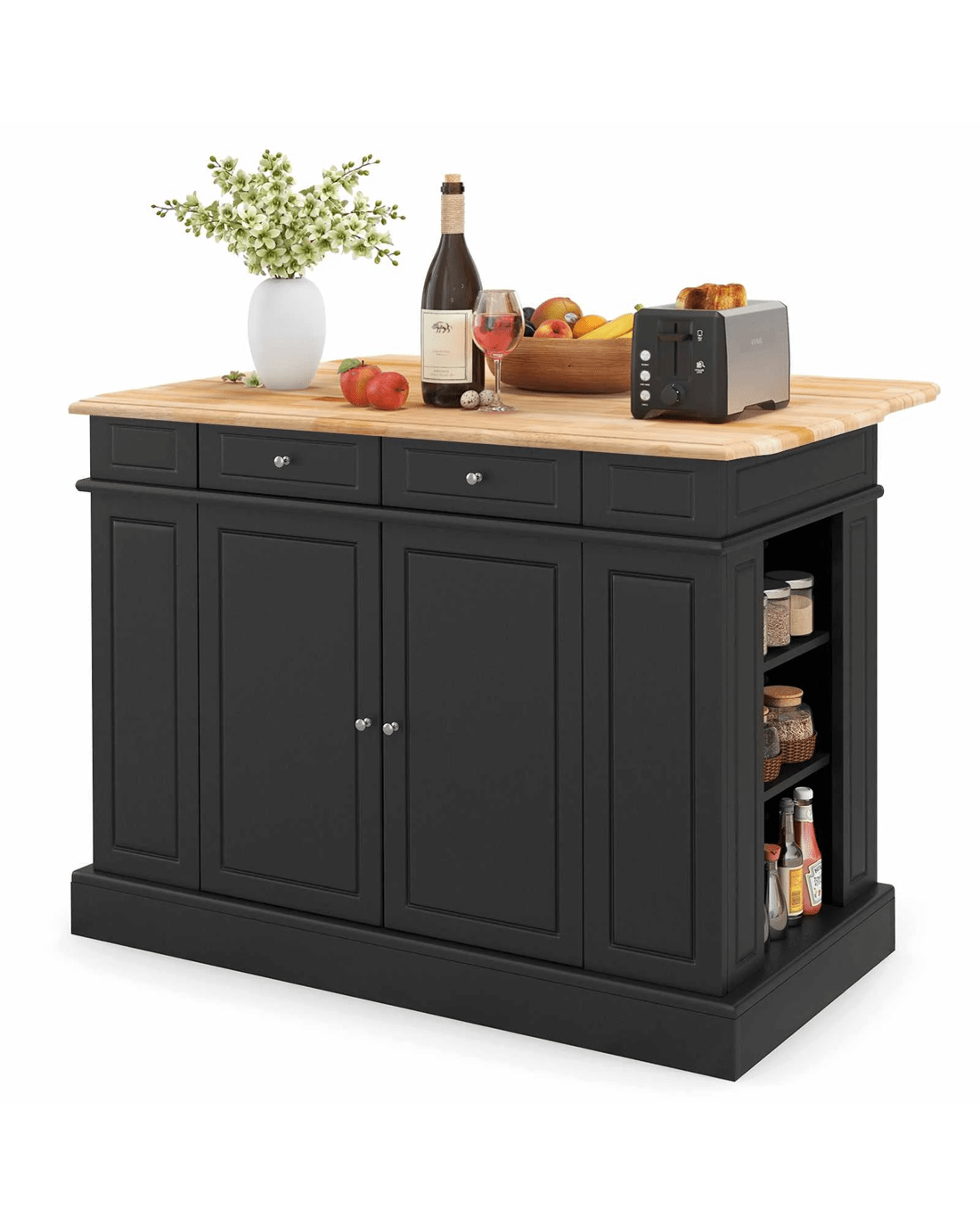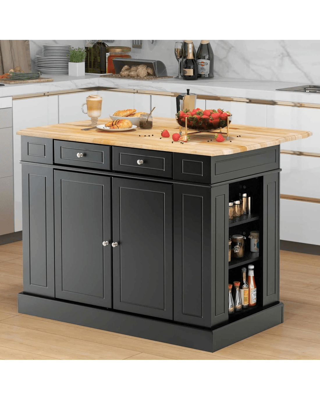 No place to put your kitchen supplies? Don't worry! Our kitchen island table features a large rubber wood countertop, practical drawers, side racks and 2-door cabinet for the perfect storage solution. Besides, the shelves in the side racks and cabinet can be adjusted in 3 different heights to meet your storage needs. If you want to get more preparation space, just extend the countertop thanks to its drop leaf design. And the practical drop leaf countertop allows you to use this kitchen island as a dining bar table as well. As for aesthetics, the simple black/white color makes this kitchen storage cabinet blend seamlessly with your home decoration.