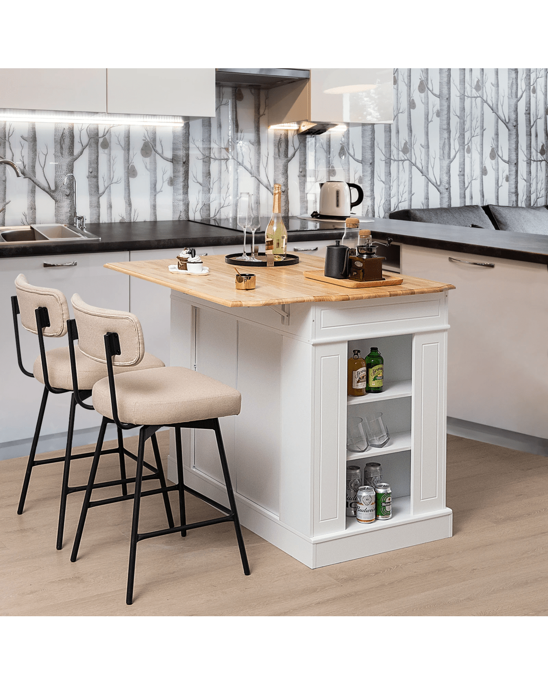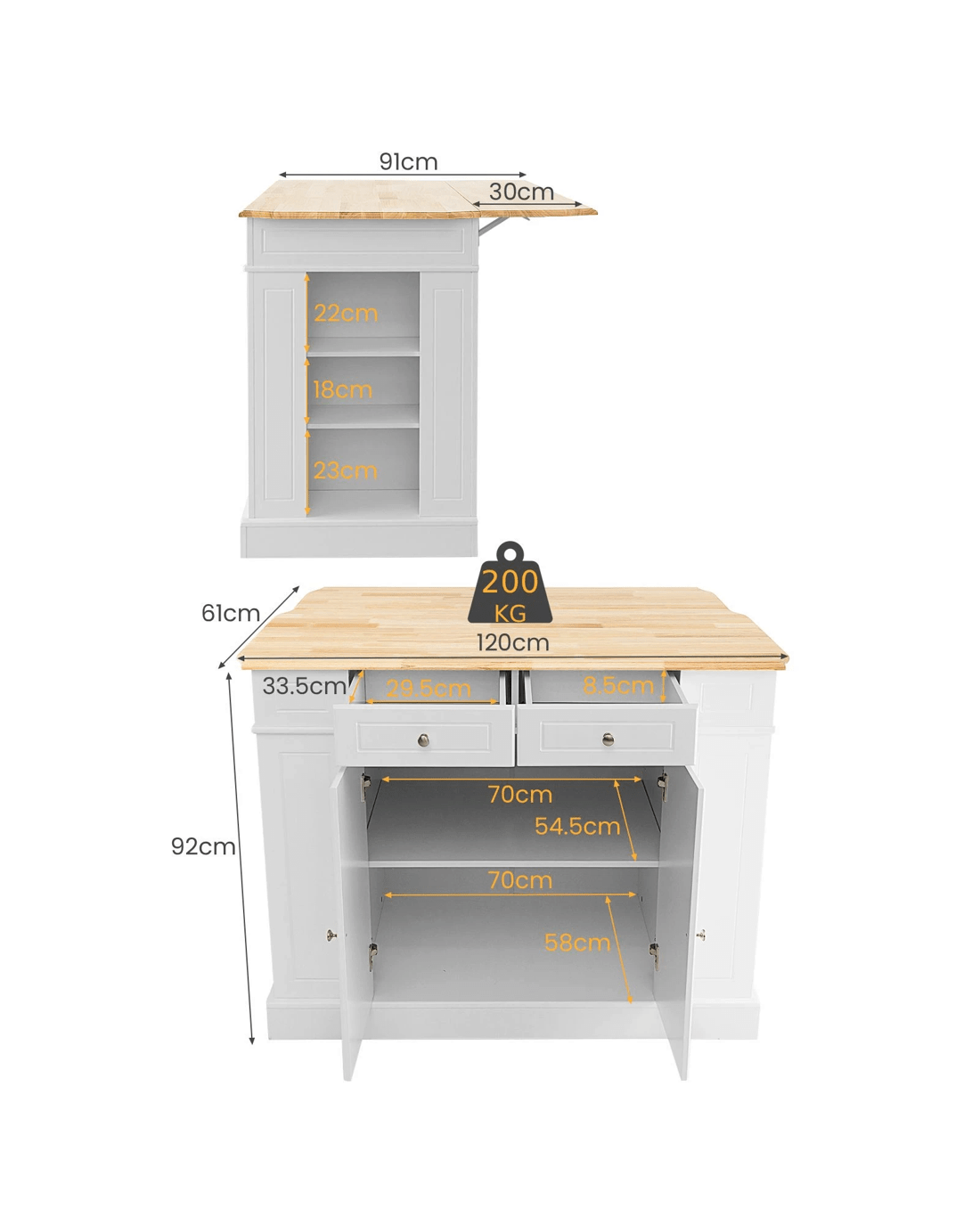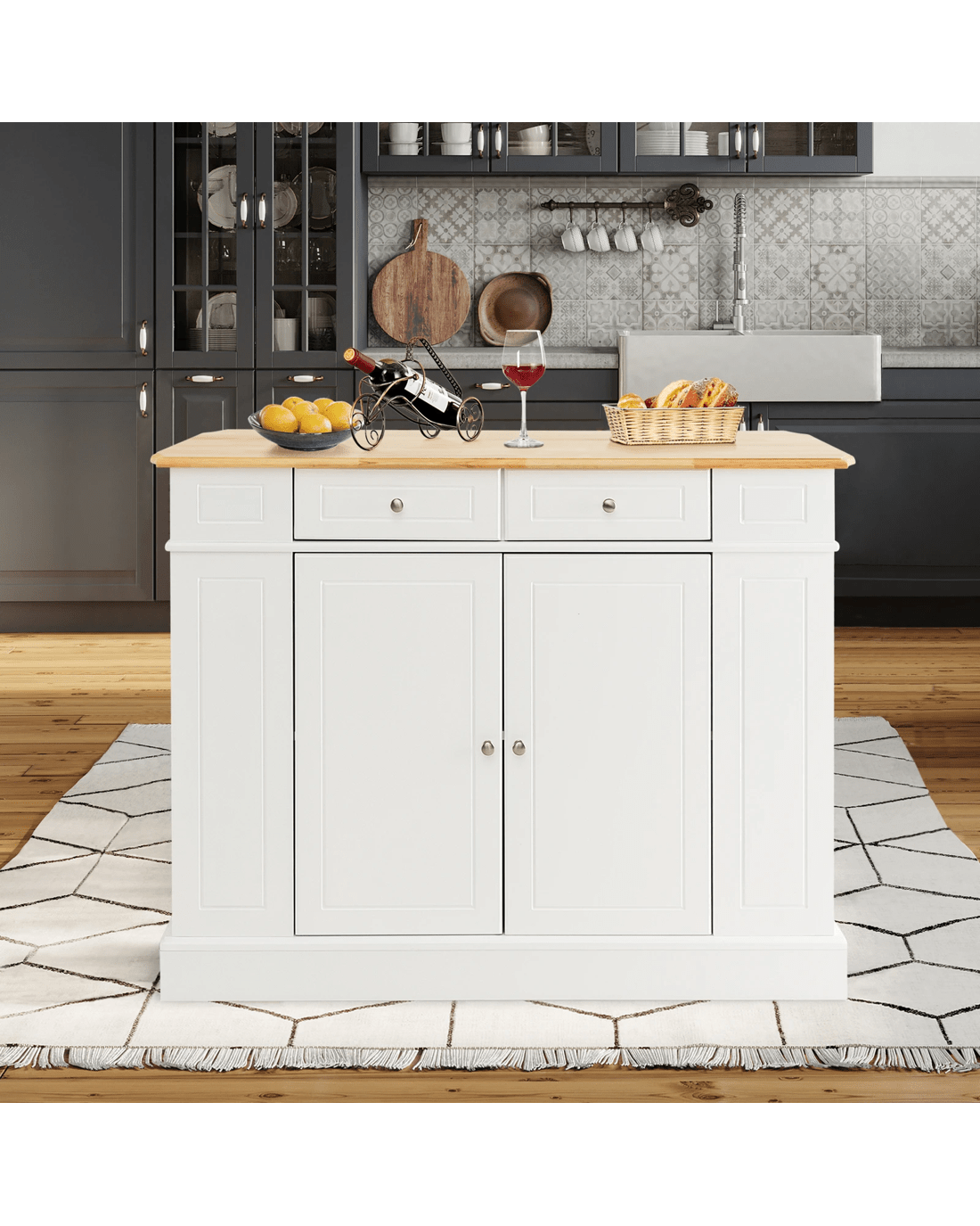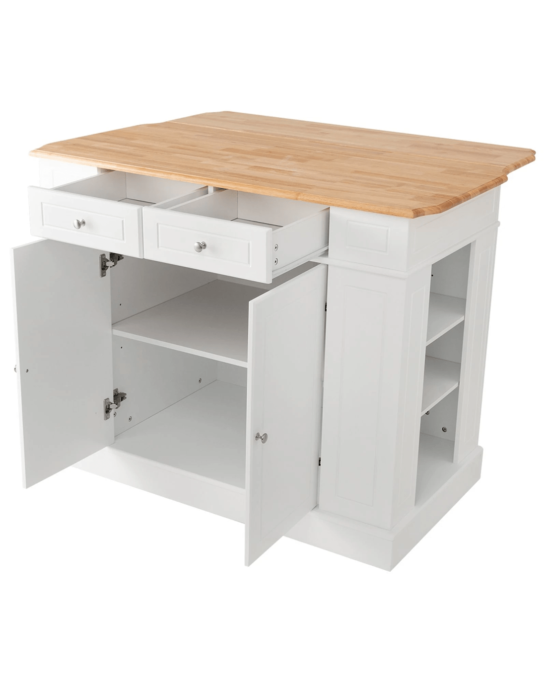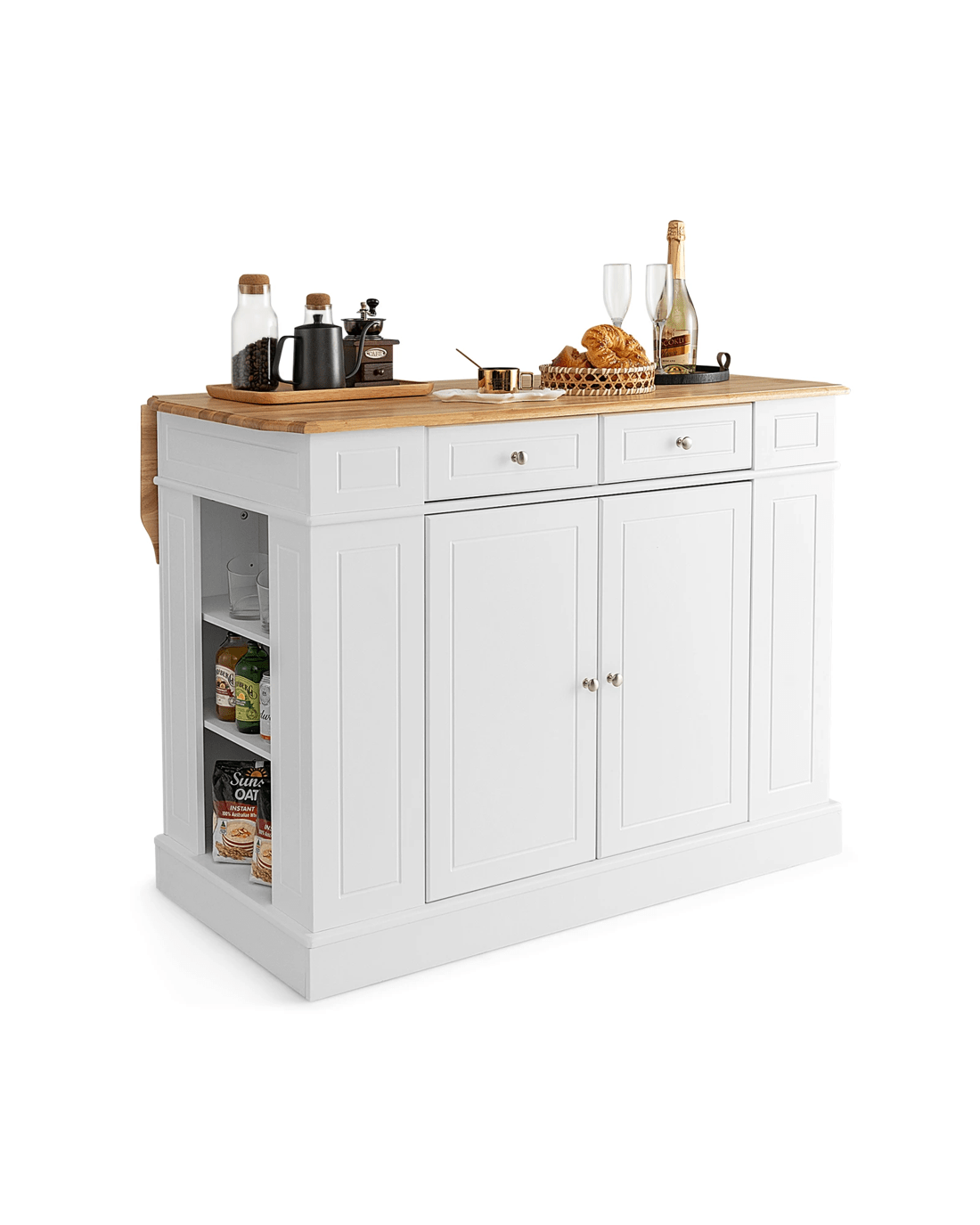 No place to put your kitchen supplies? Don't worry! Our kitchen island table features a large rubber wood countertop, practical drawers, side racks and 2-door cabinet for the perfect storage solution. Besides, the shelves in the side racks and cabinet can be adjusted in 3 different heights to meet your storage needs. If you want to get more preparation space, just extend the countertop thanks to its drop leaf design. And the practical drop leaf countertop allows you to use this kitchen island as a dining bar table as well. As for aesthetics, the simple black/white color makes this kitchen storage cabinet blend seamlessly with your home decoration.