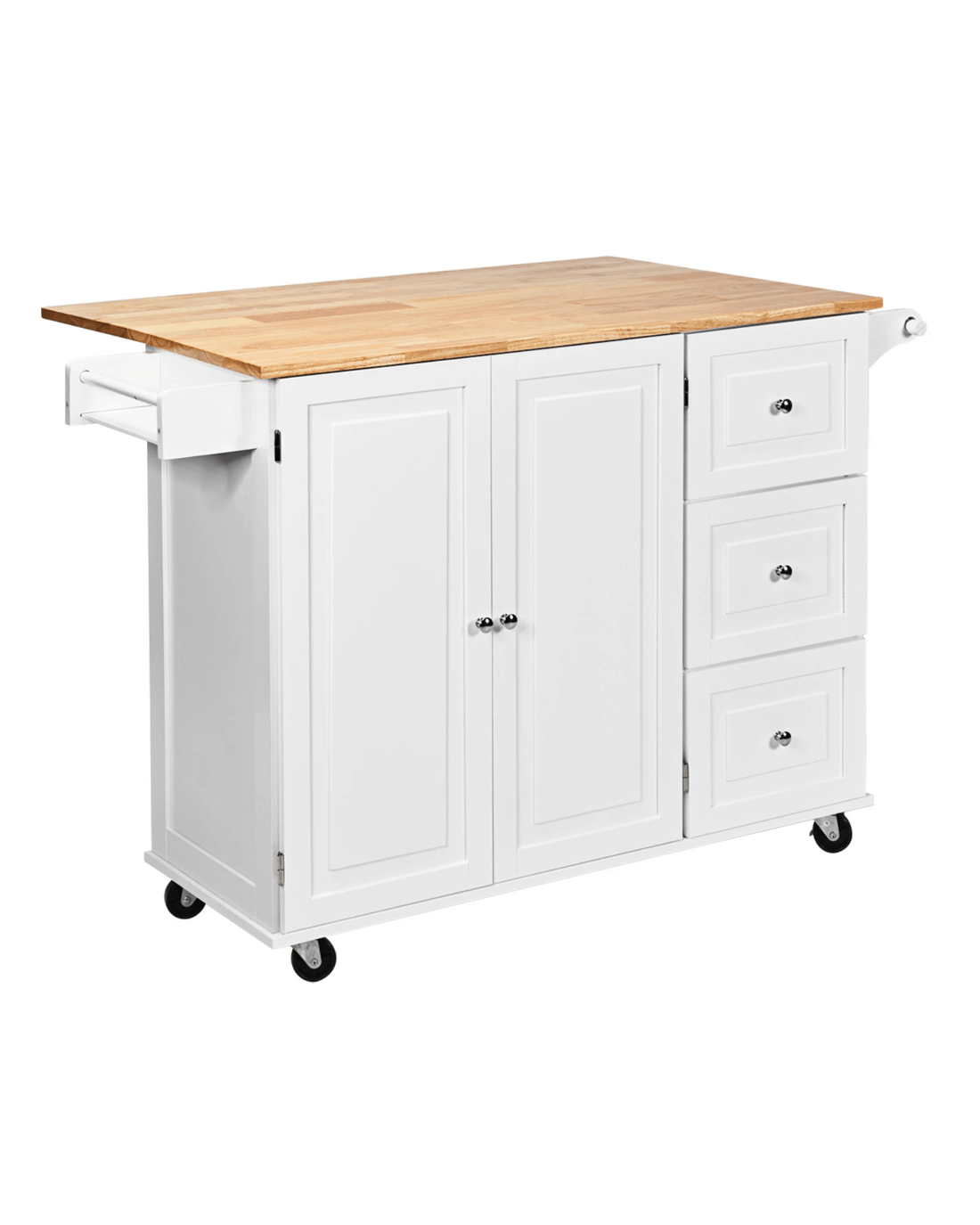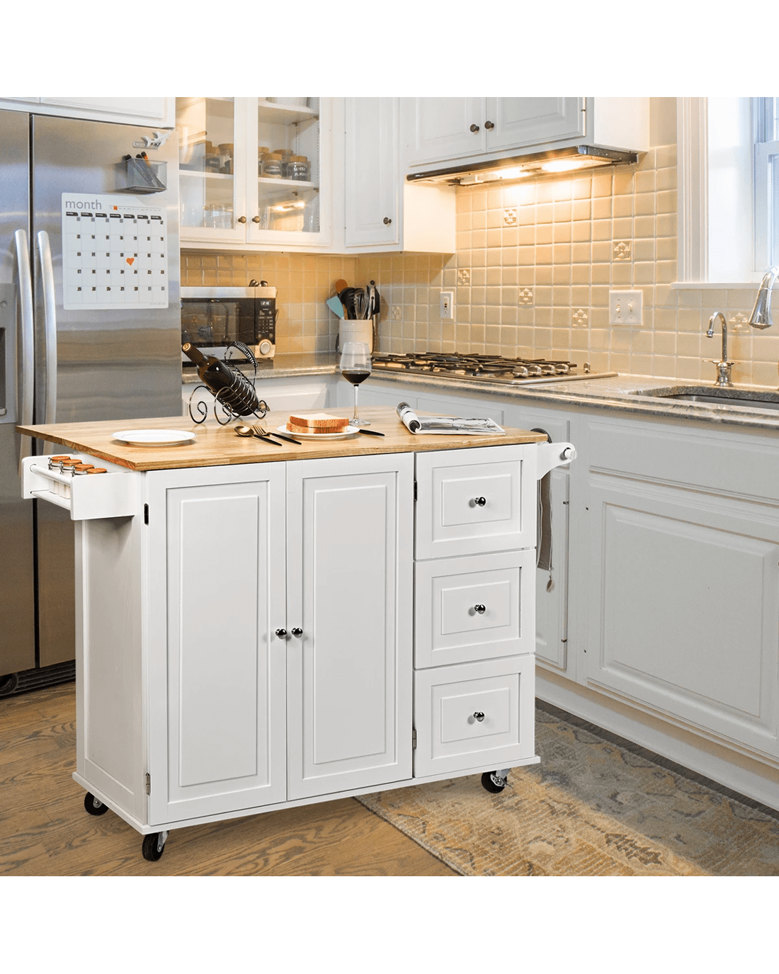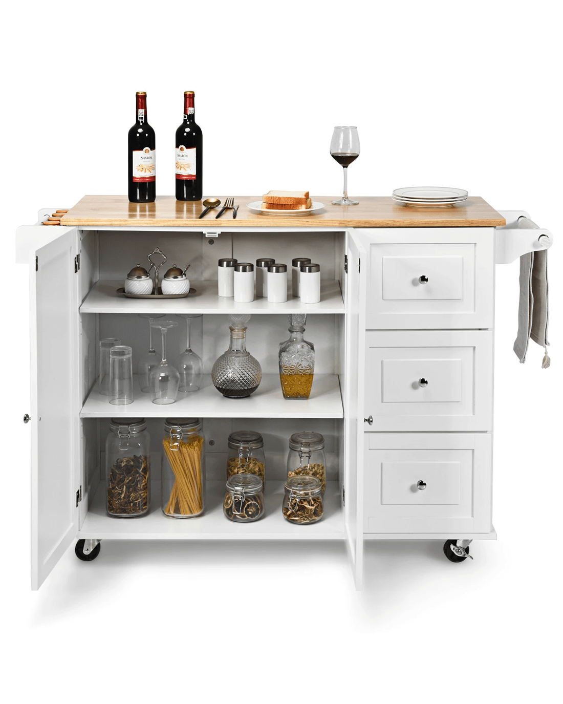The key to keep a neat kitchen or create a convenient dining environment is bringing the kitchen cart home. It features a rubber wood countertop with drop leaf. In this way, you can customize your food prep surface according to your needs. And rolls to anywhere you want due to smooth rolling wheels. A spice storage shelf and towel rack allows quick access to the spice bottles and kitchen towel when you need them. The kitchen cart will appeal to your guest and family because of its elegant design. It also includes built-in 2 adjustable shelves and 3 drawers to give you ample storage space.