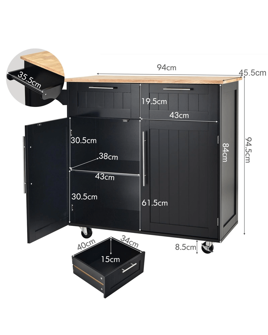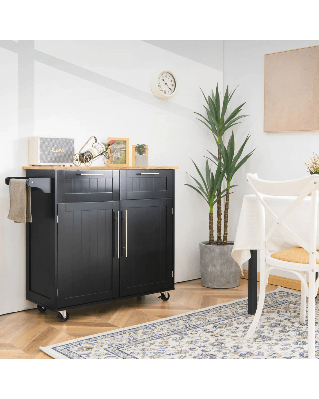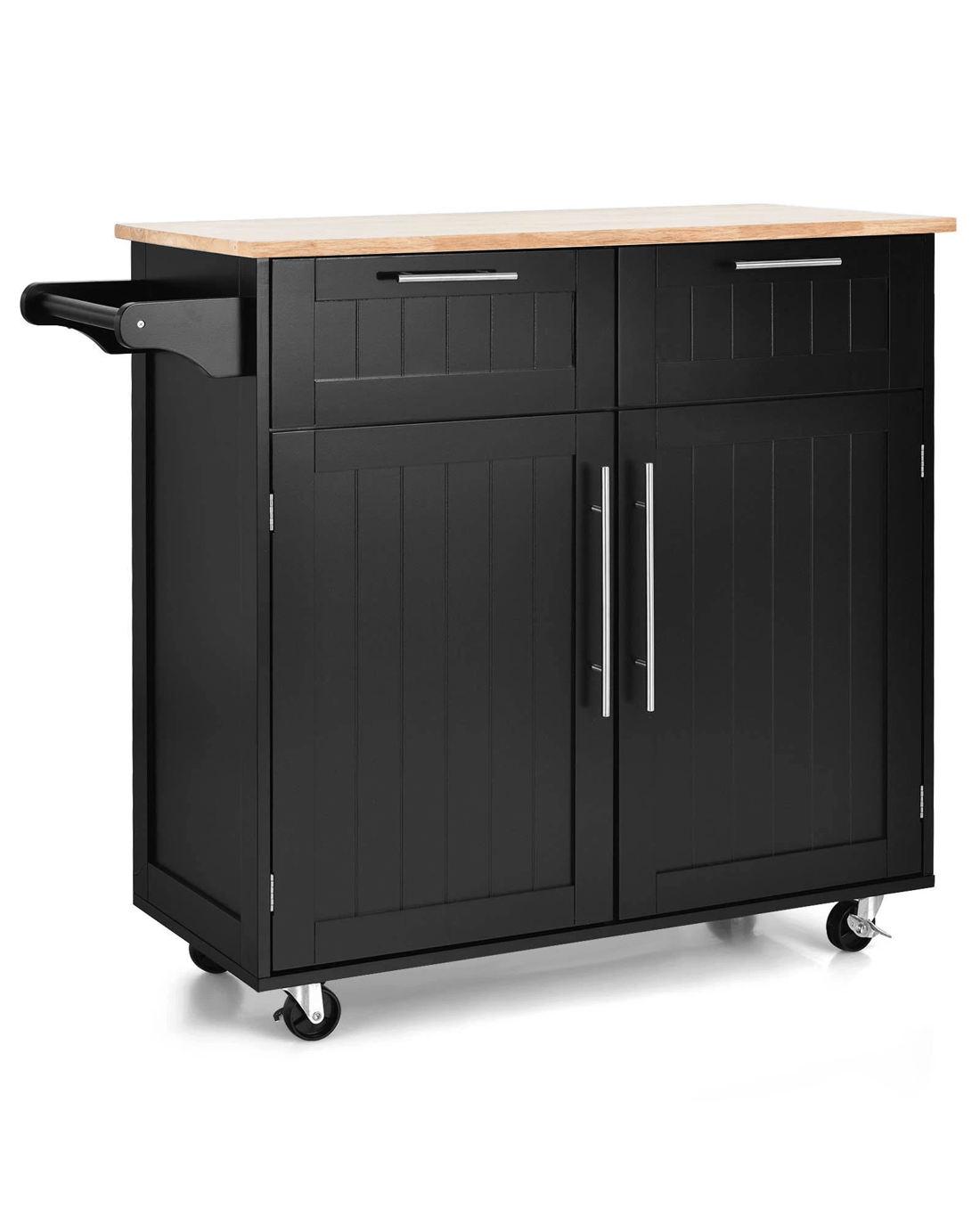 Our kitchen island cart will be a perfect storage solution. It has 1 rubber wood top, 1 towel bar, 2 drawers and 2-door cabinet with adjustable shelf to hold almost all items in your kitchen or dining room. You can use our convenient handles to easily take out what you need from drawers and cabinet. The smooth surface can be easily cleaned with a damp cloth. Besides, it has 4 rolling casters (includes 2 wheels with brakes) for smooth moving. Also, constructed of solid rubber wood and high quality MDF boards, it ensures high durability and excellent sturdiness. And with detailed instruction and complete accessories, it’s super easy to put together.