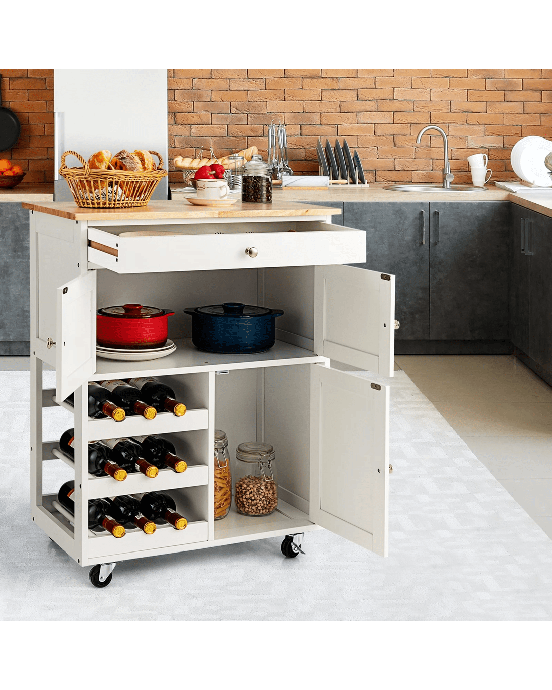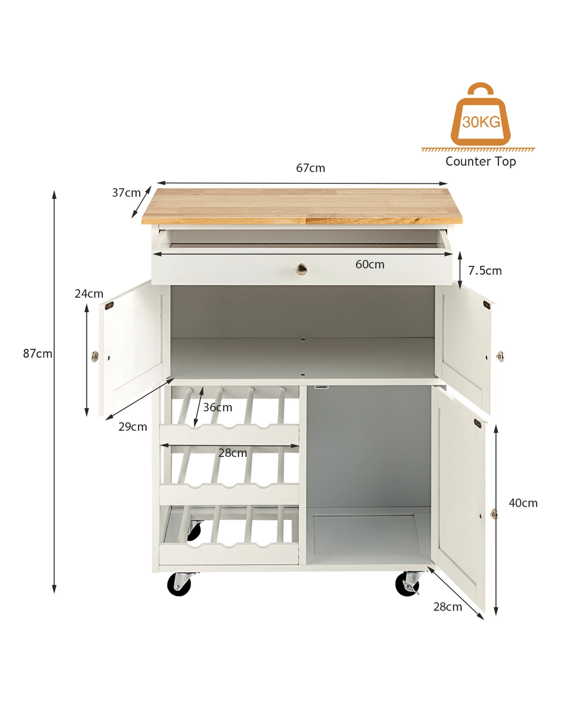 This is our brand new kitchen island trolley, which includes a spacious drawer, 2 cabinets and three layers of wine rack. It supplies you with ample space to store tableware, cookware, tall bottles, stemware and wine, etc. This kitchen cart is constructed from high quality rubberwood table top, MDF frame and cast-iron rubber casters for durability and modern design. Therefore, the cart is suitable for your room with any decor that adding an elegant atmosphere. Rubberwood surface and external varnish make it easy to clean. The kitchen cart is equipped with 4 smooth rolling casters, which are made for easy movement and make sure your floors stay scratch free. What’s more, 2 lockable casters secure the security while using the cart. Don’t hesitate to choose it!