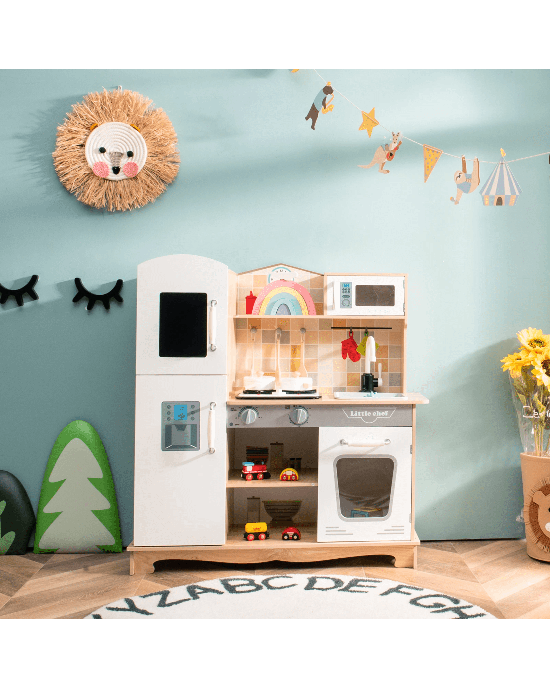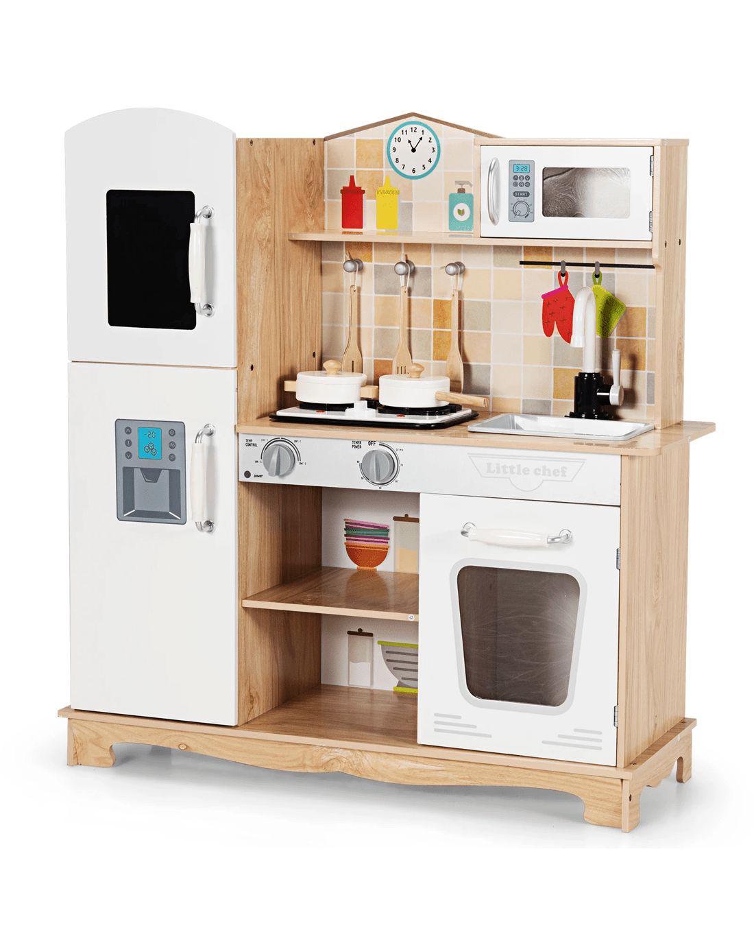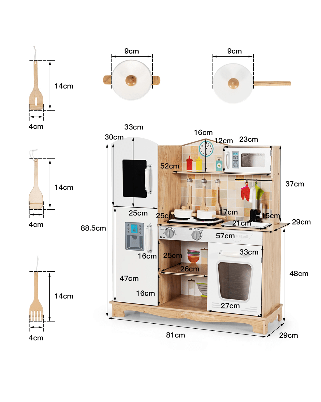 Our little ones Kitchen Play Set is the perfect companion for your little one's development. It favors the overall development of the little one and enhances the interaction between parents and little ones. In addition, we attach great importance to little ones' health and security, so the kitchen play set is made of harmless and learnable wooden materials. With the realistic-looking design and vivid sounds, little ones will have an unforgettable cooking experience. In addition, the playset has multiple storage spaces to keep kitchen entertainment organised. All in all, the kitchen playset is a gorgeous gift for your little ones.