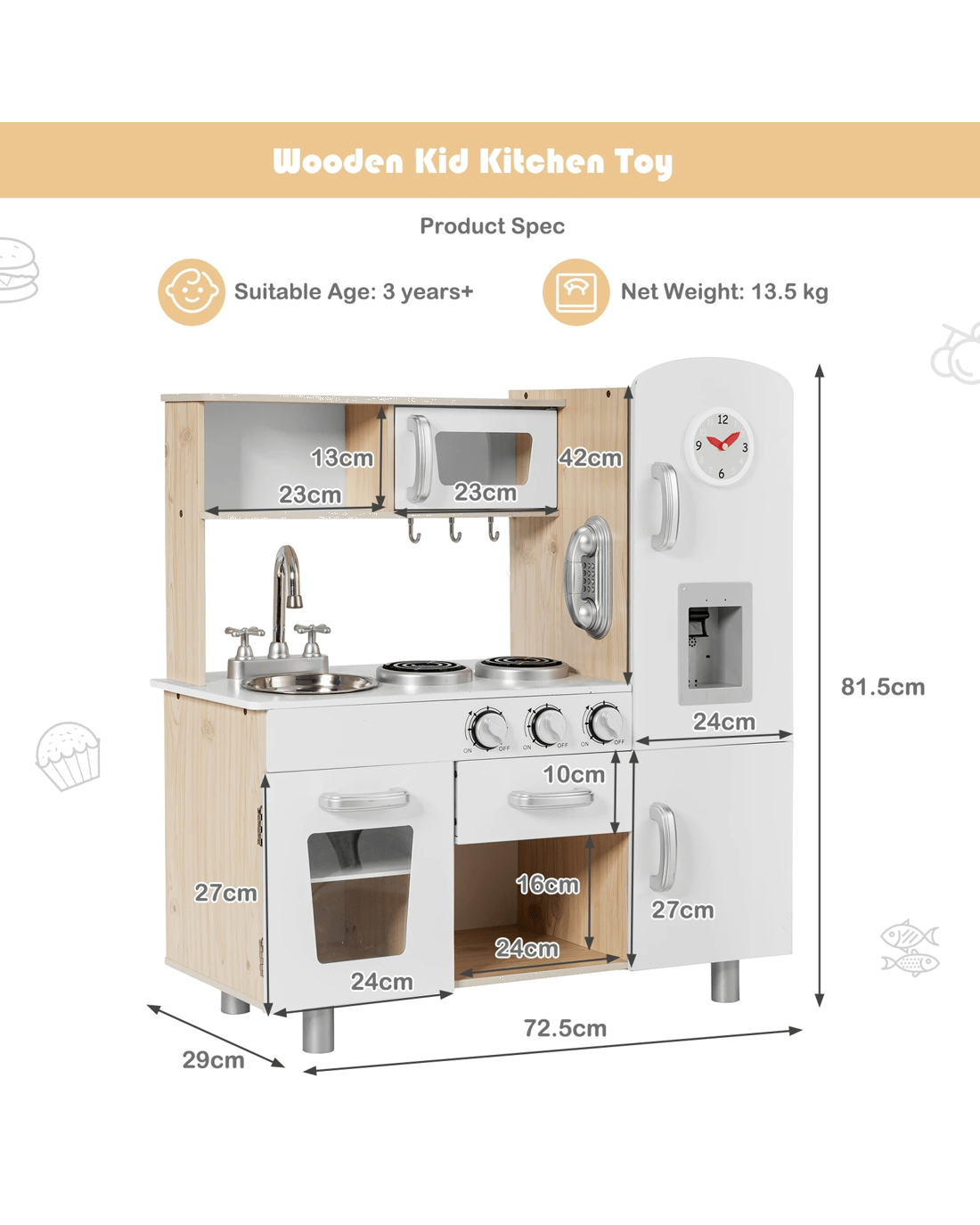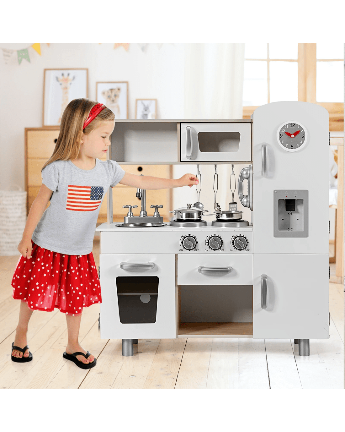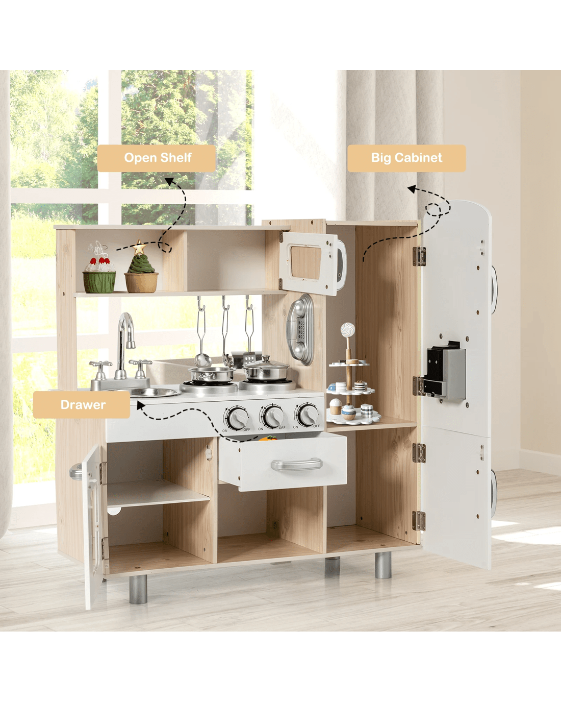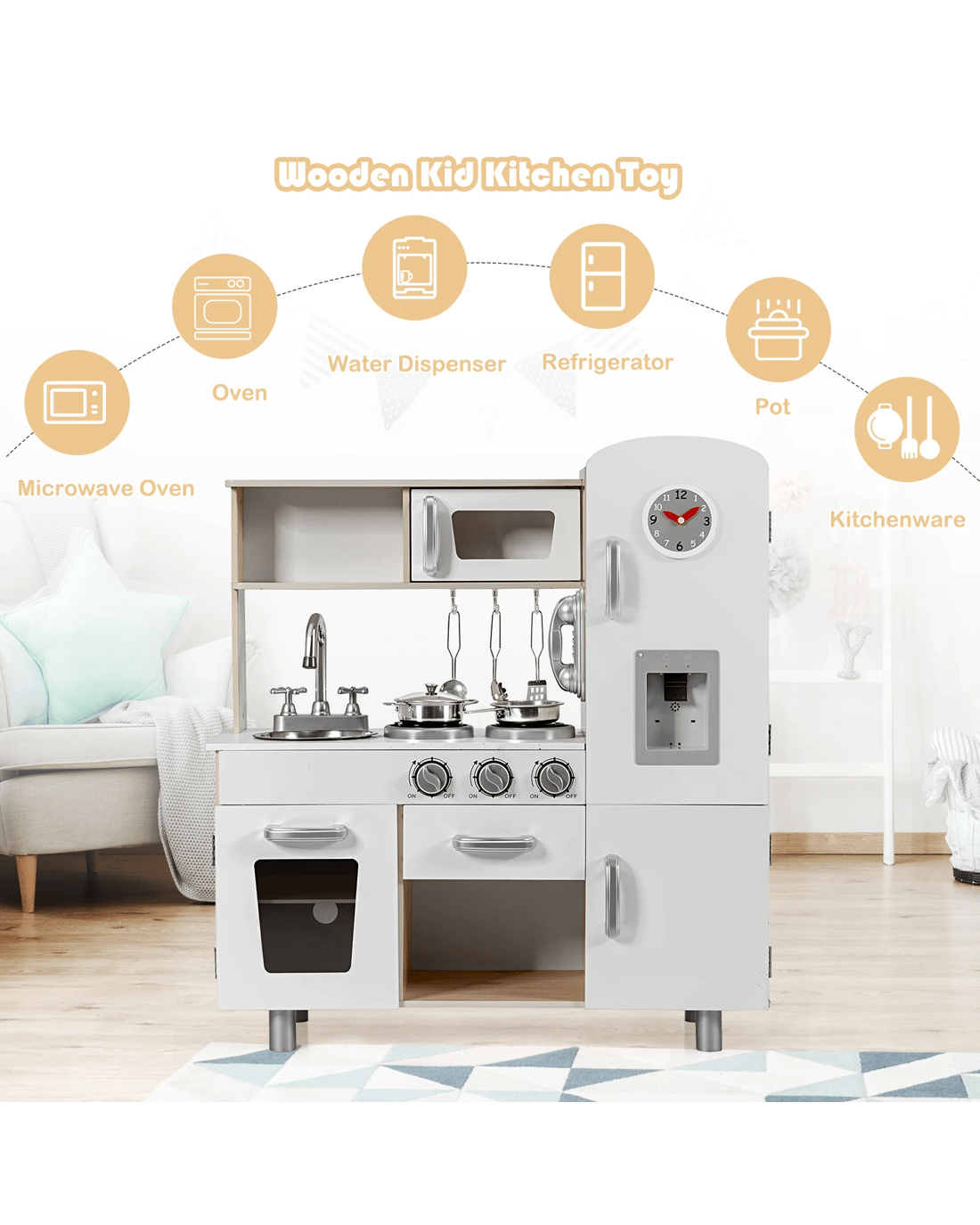 Our kitchen play set is committed to bringing countless hours of fun for your little one! Your little ones will enjoy a realistic cooking experience by stove, sink and fridge of the kitchen set. The water dispenser features light and simulated sound, making the simulation game more lively and interesting. After cooking an imaginative meal, Little one can use the tap to simulate washing the tableware in the sink to learn practical skills. Various cabinets and drawers not only provide enough space to store toys but also help little ones develop the habit of storage. There is a pot with lids, a pan, 3 cooking utensils and a telephone to attract your little ones' attention without taking care of when you are busy cooking.